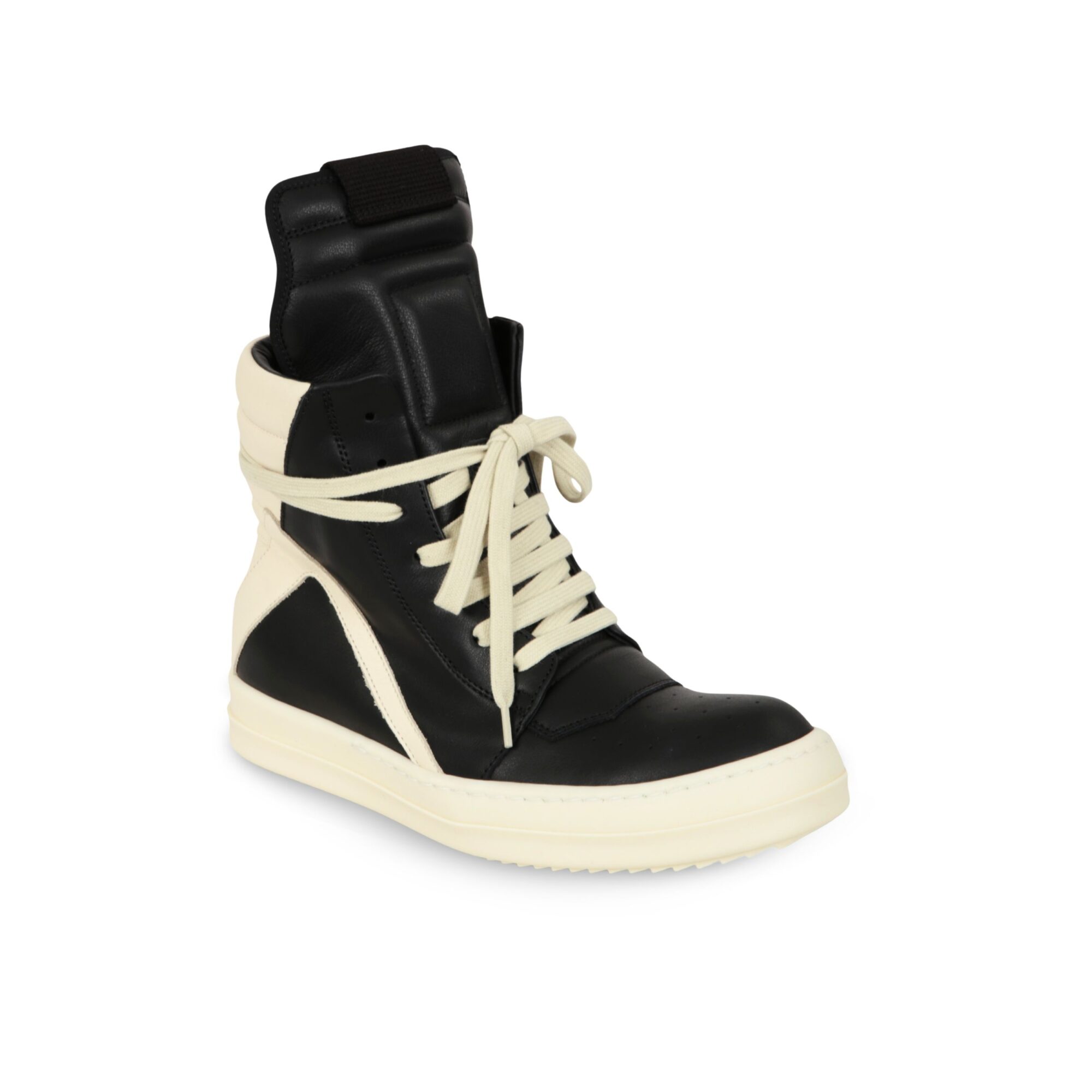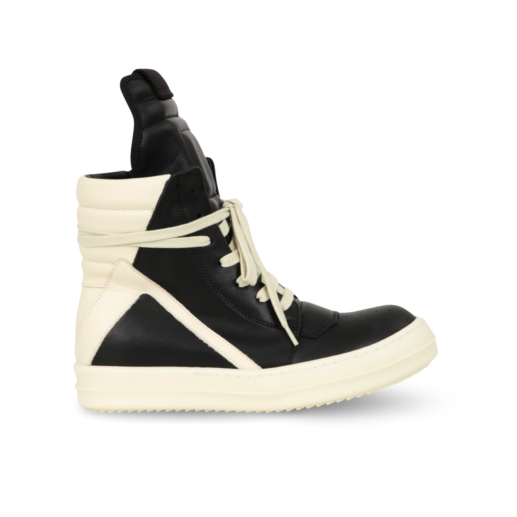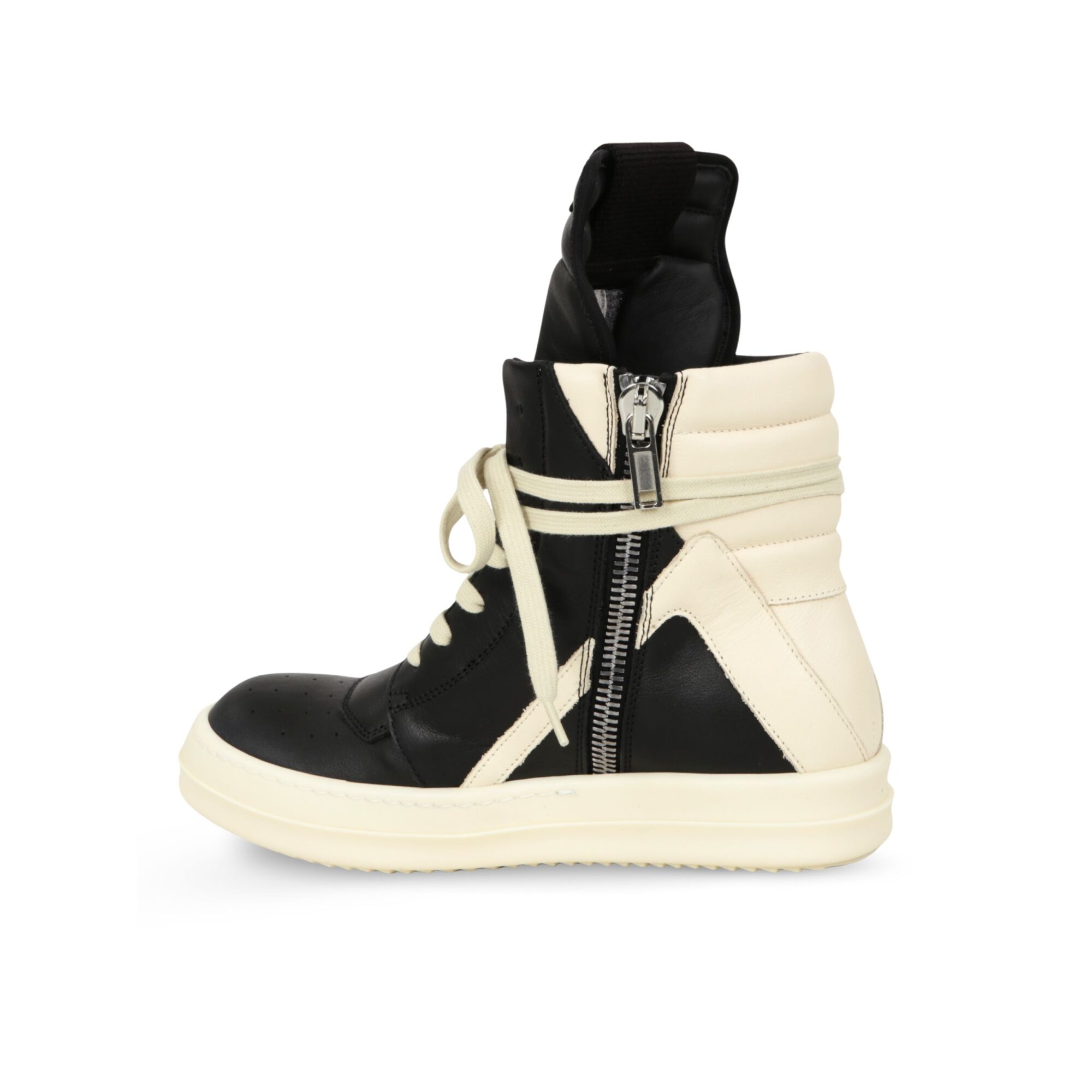 Temple Geobasket Rick Owens. High-top con iconica linguetta oversize e inserto imbottito sul retro, chiusura con lacci e zip laterale e suola in gomma con profilo shark-tooth.