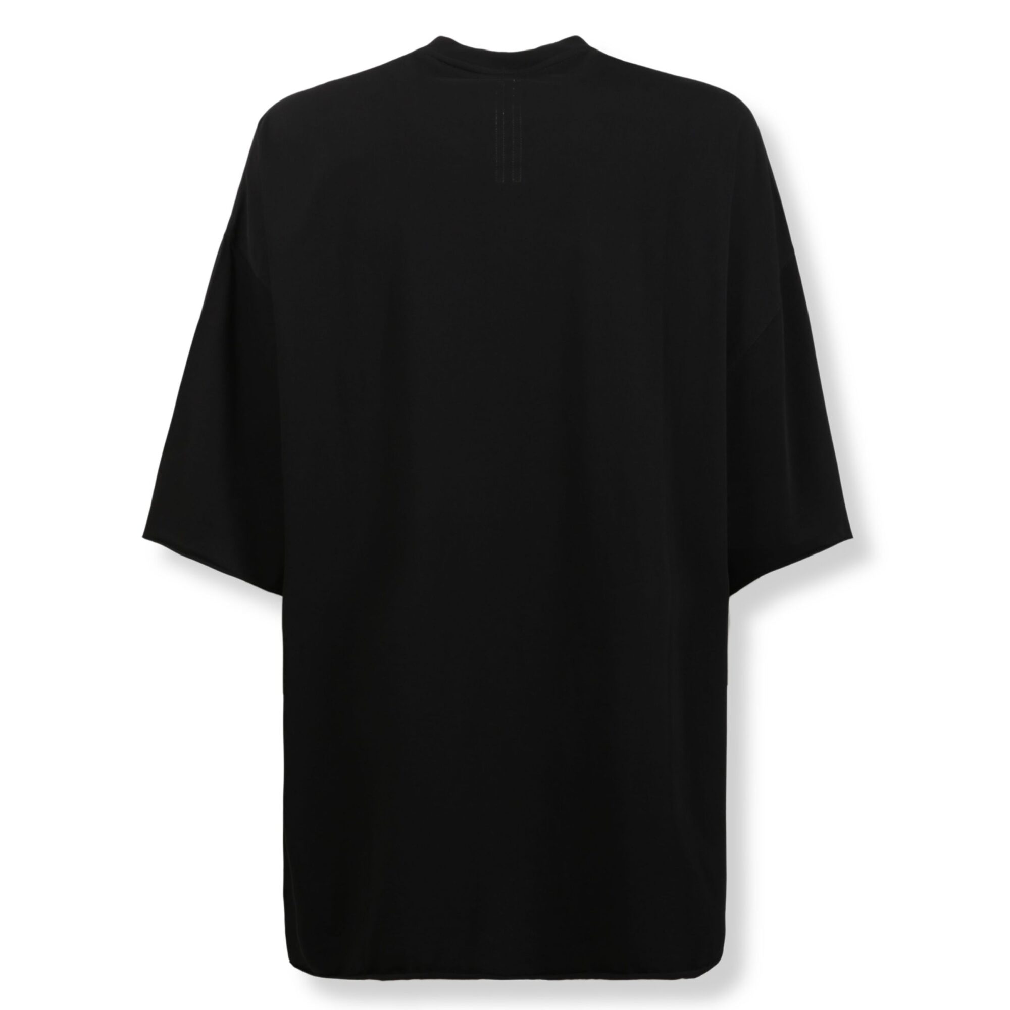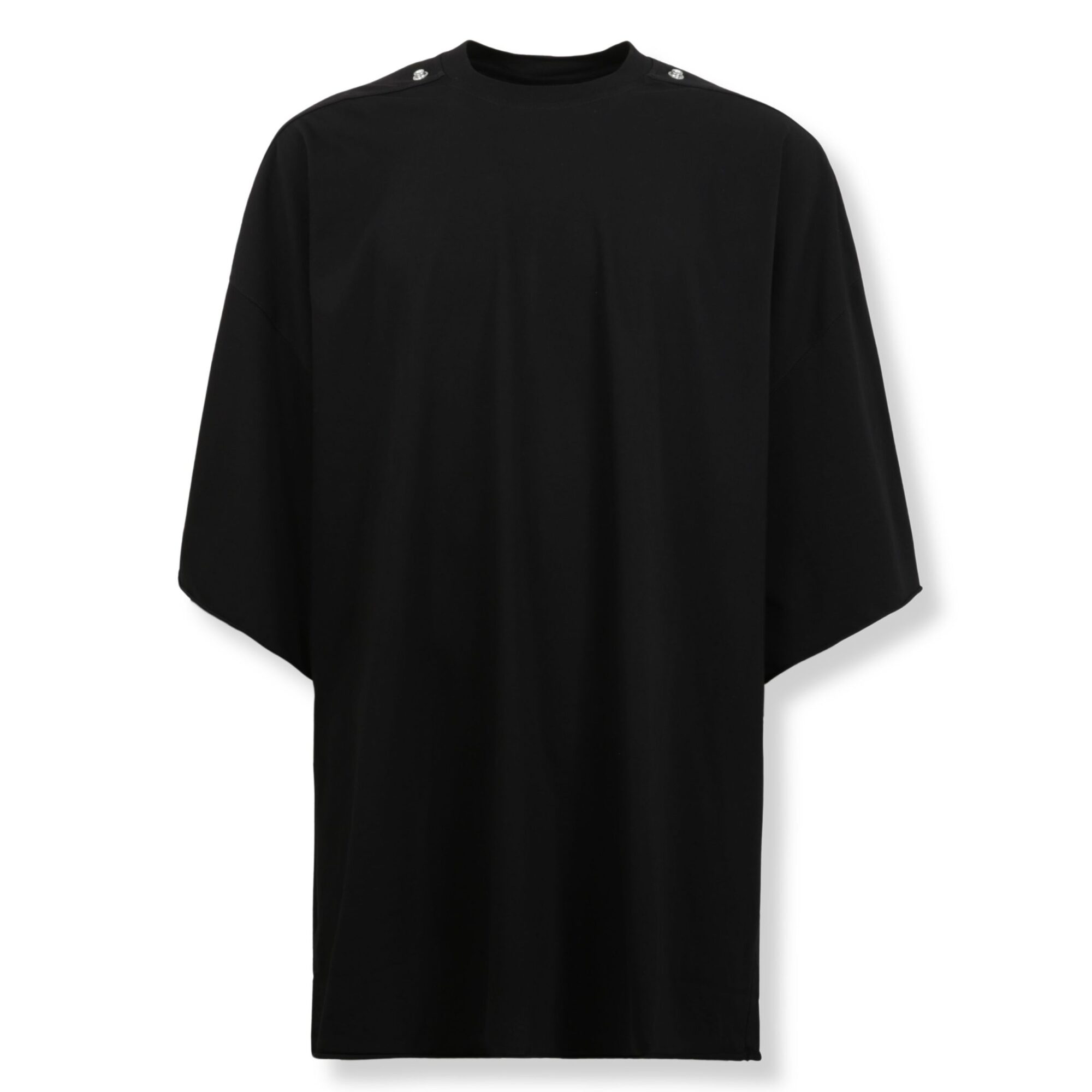 Tommy T Rick Owens. Vestibilità oversize, maniche corte ampie, con giromanica abbassato. Girocollo a costine con cuciture sulle spalle e rivetti decorativi.
