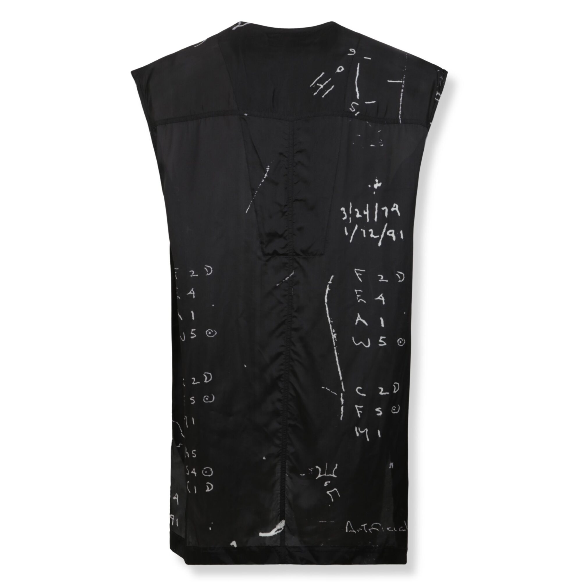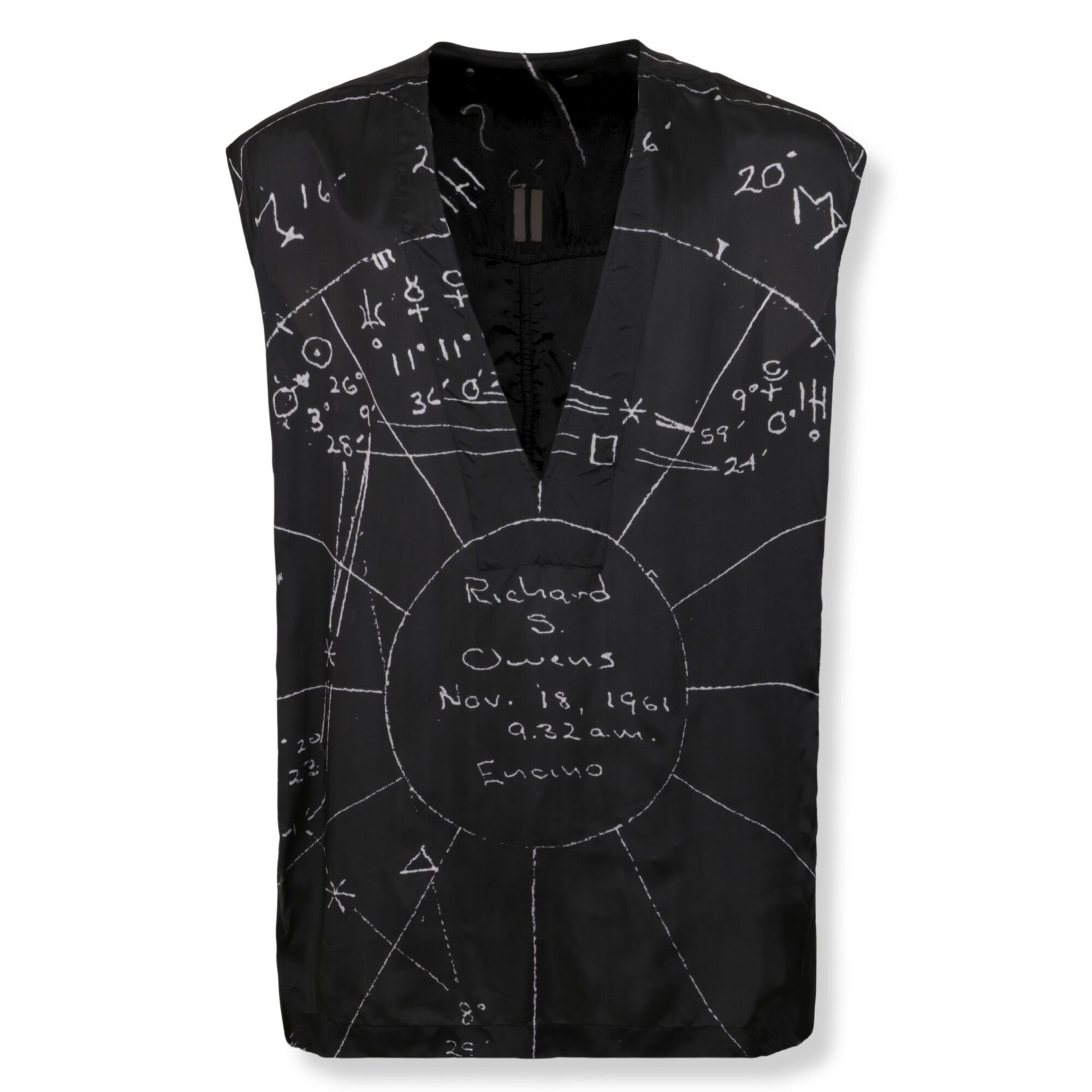 Temple Cropped Flightsuit Top Rick Owens. Design in chiffon di seta semi-trasparente, smanicato con scollo a V e taglio asimmetrico dell’orlo inferiore. La stampa sul davanti rappresenta una carta astrale di Rick Owens, disegnata da suo padre nel giorno della sua nascita.