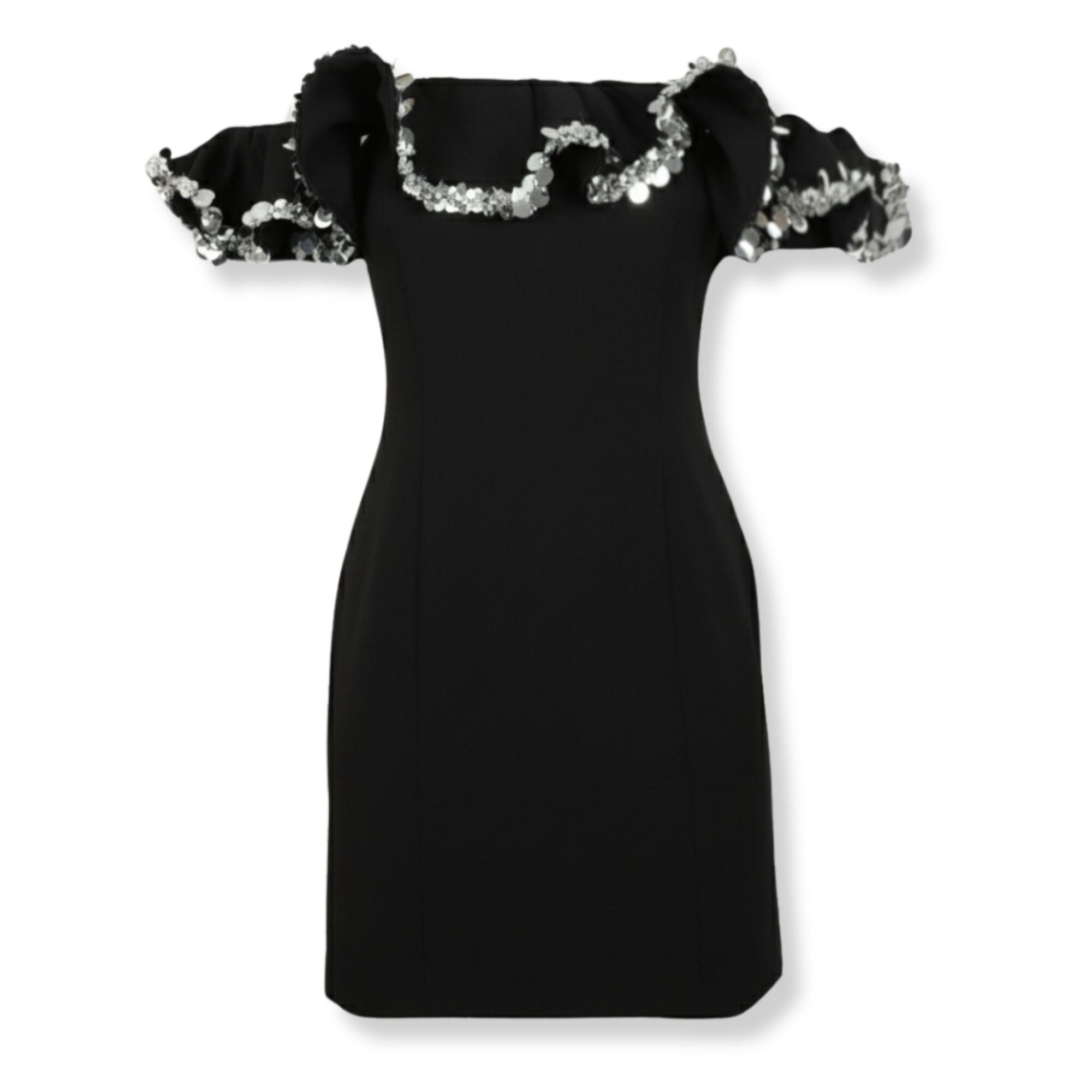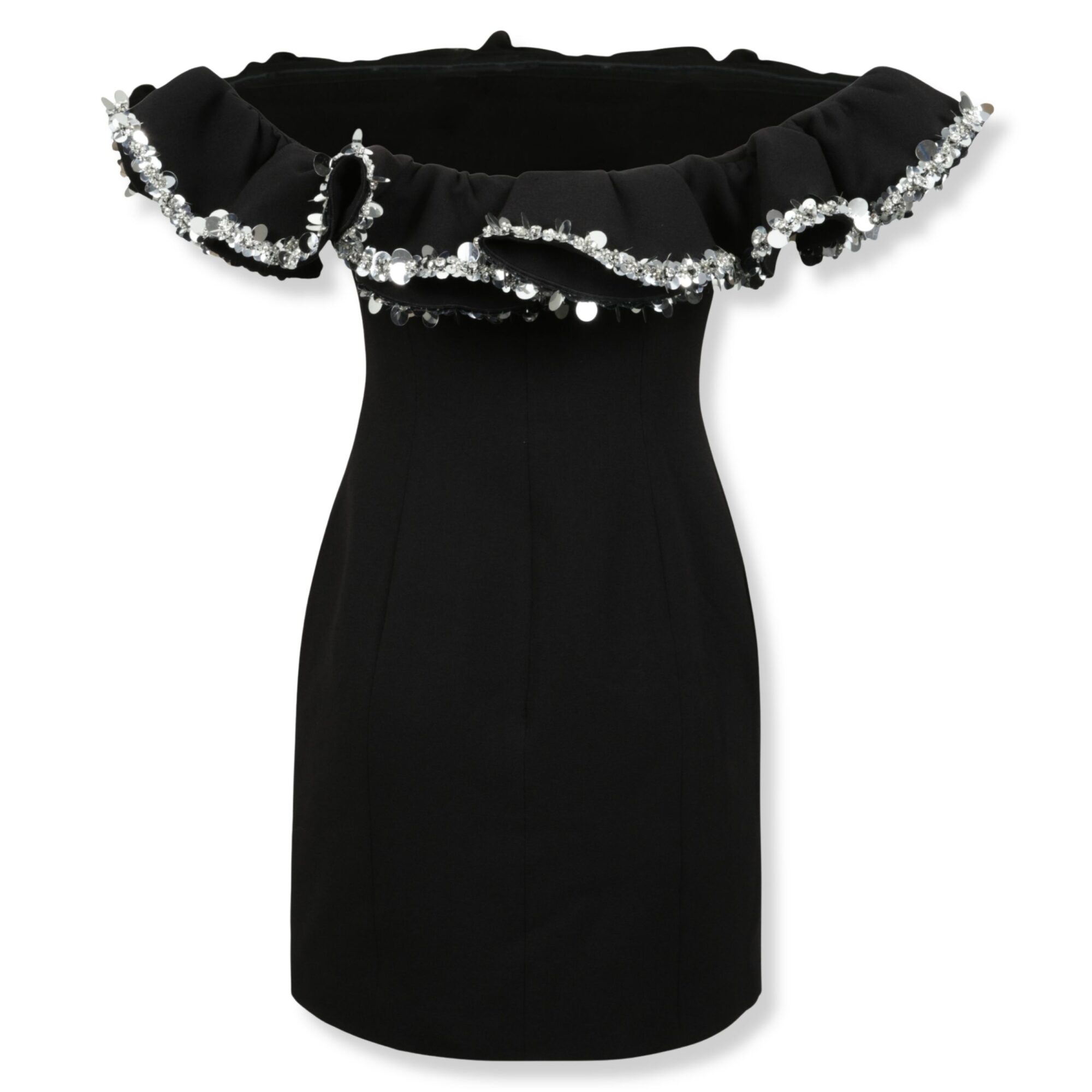 Crêpe Mini Ruffle Dress Rotate. Vestibilità aderente e scollatura ampia. Spalle scoperte, volant a strati decorati con paillettes.