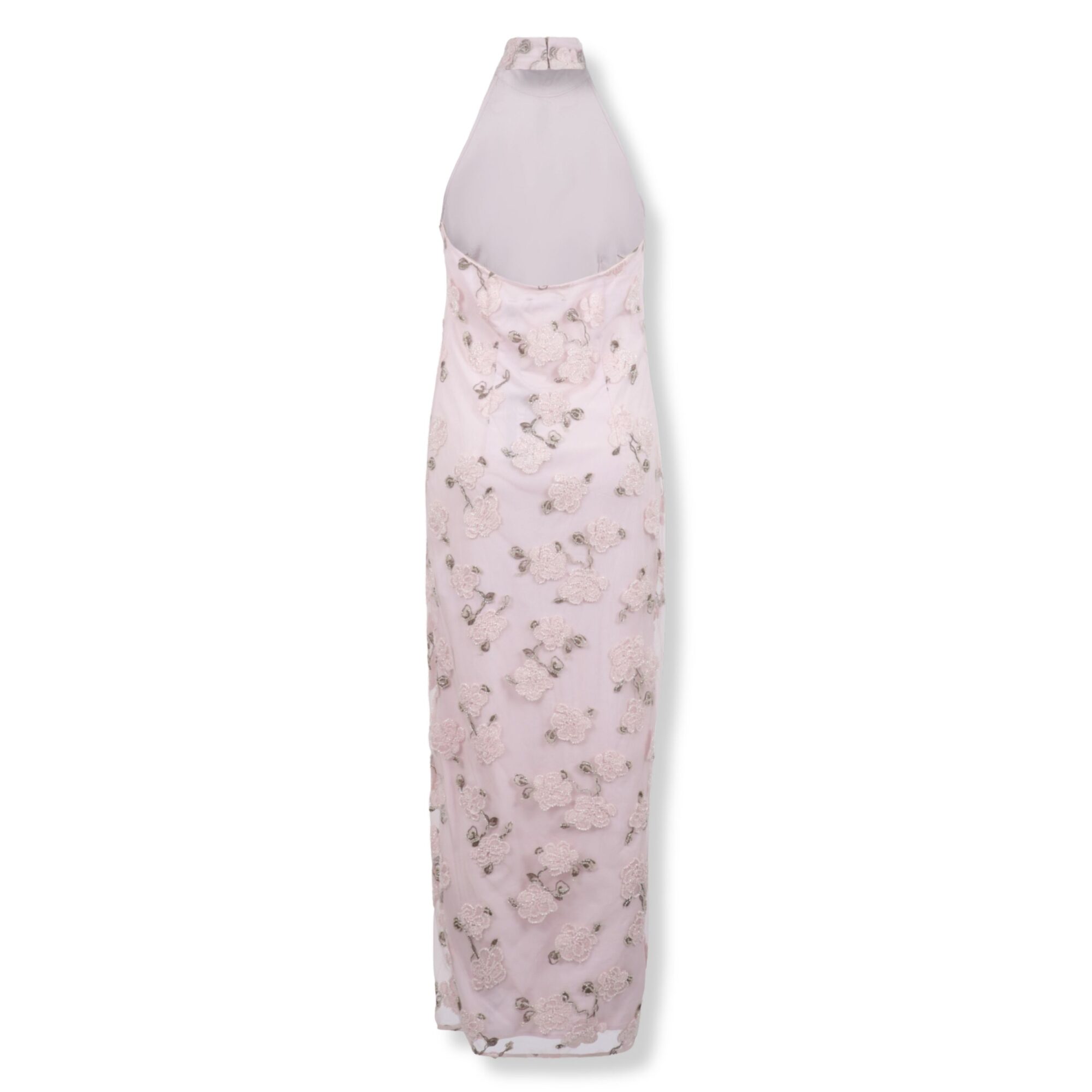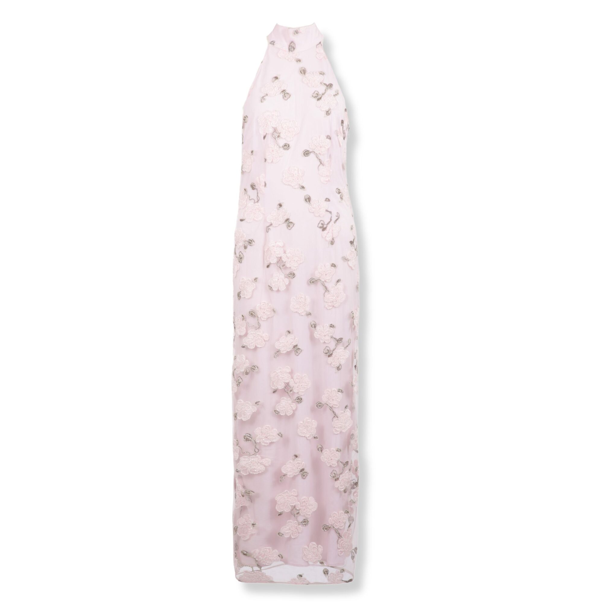 Flower Beads Maxi Dress Rotate. Ricamo floreale con perline all-over, silhouette aderente con scollo all’americana e spacco laterale.