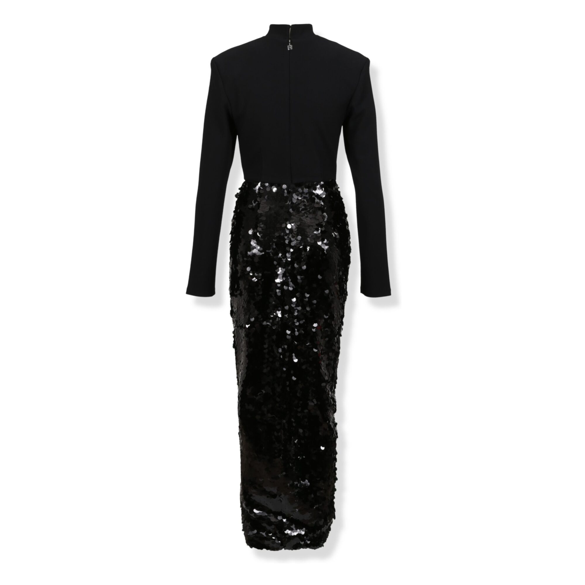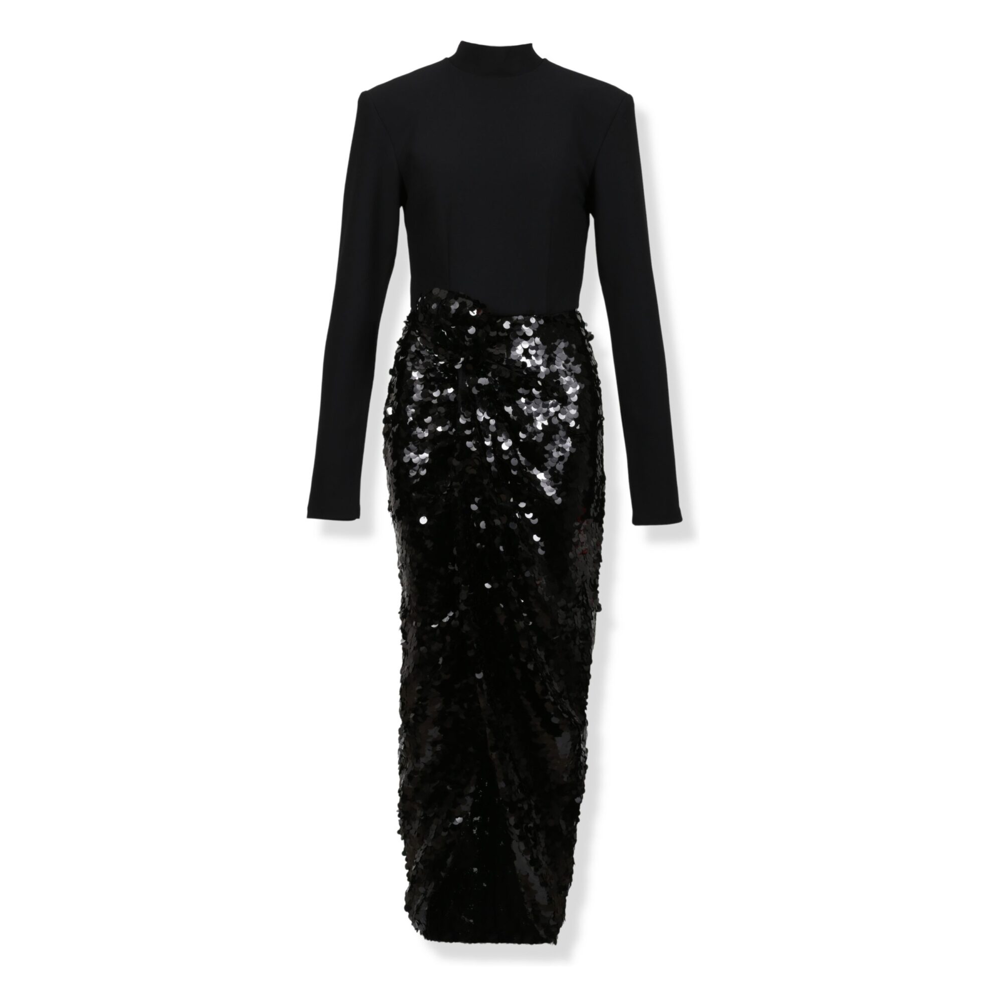 Knotted Midi Dress Rotate. Top in jersey con scollo alto e maniche lunghe. Gonna con dettaglio annodato in vita interamente ricoperta con paillettes.
