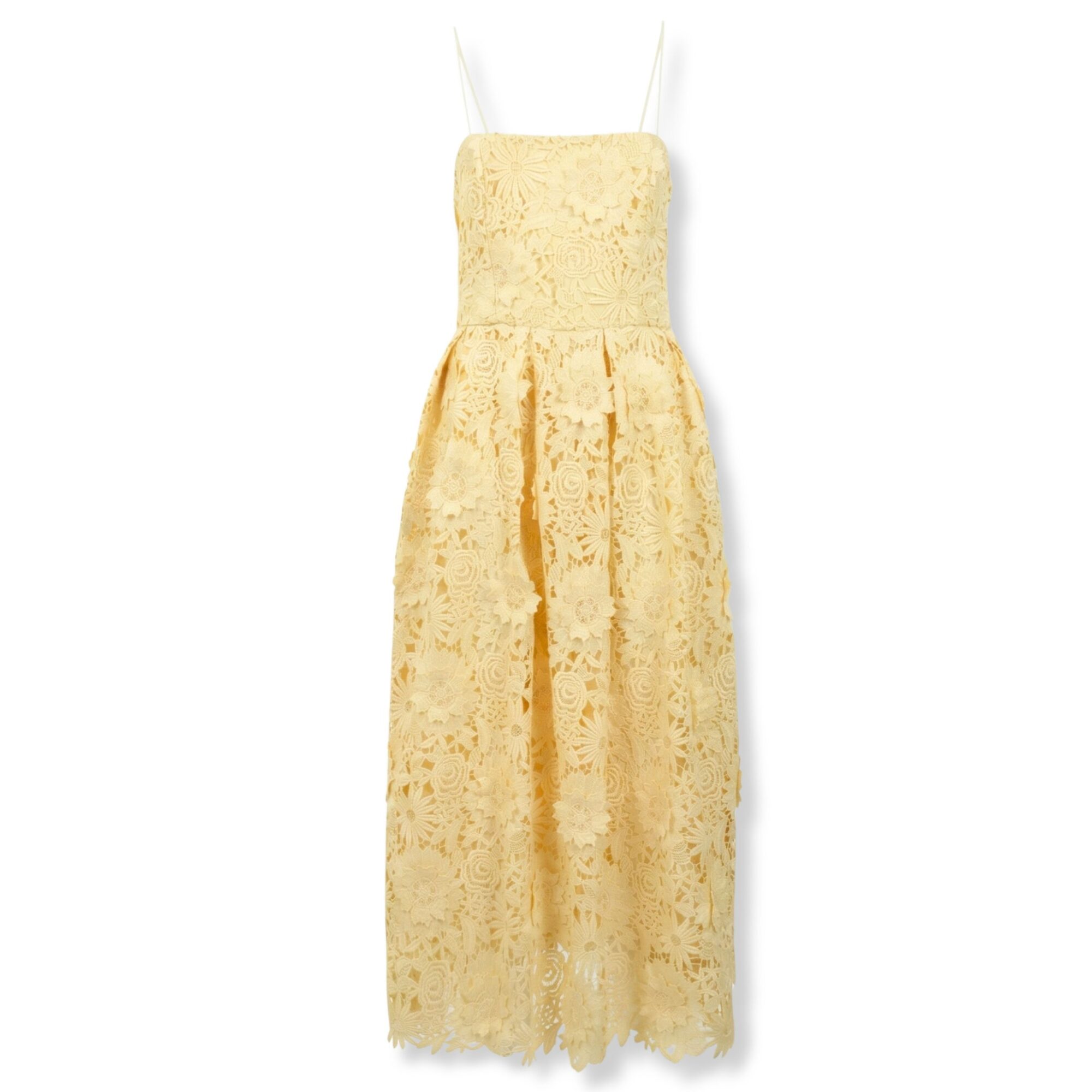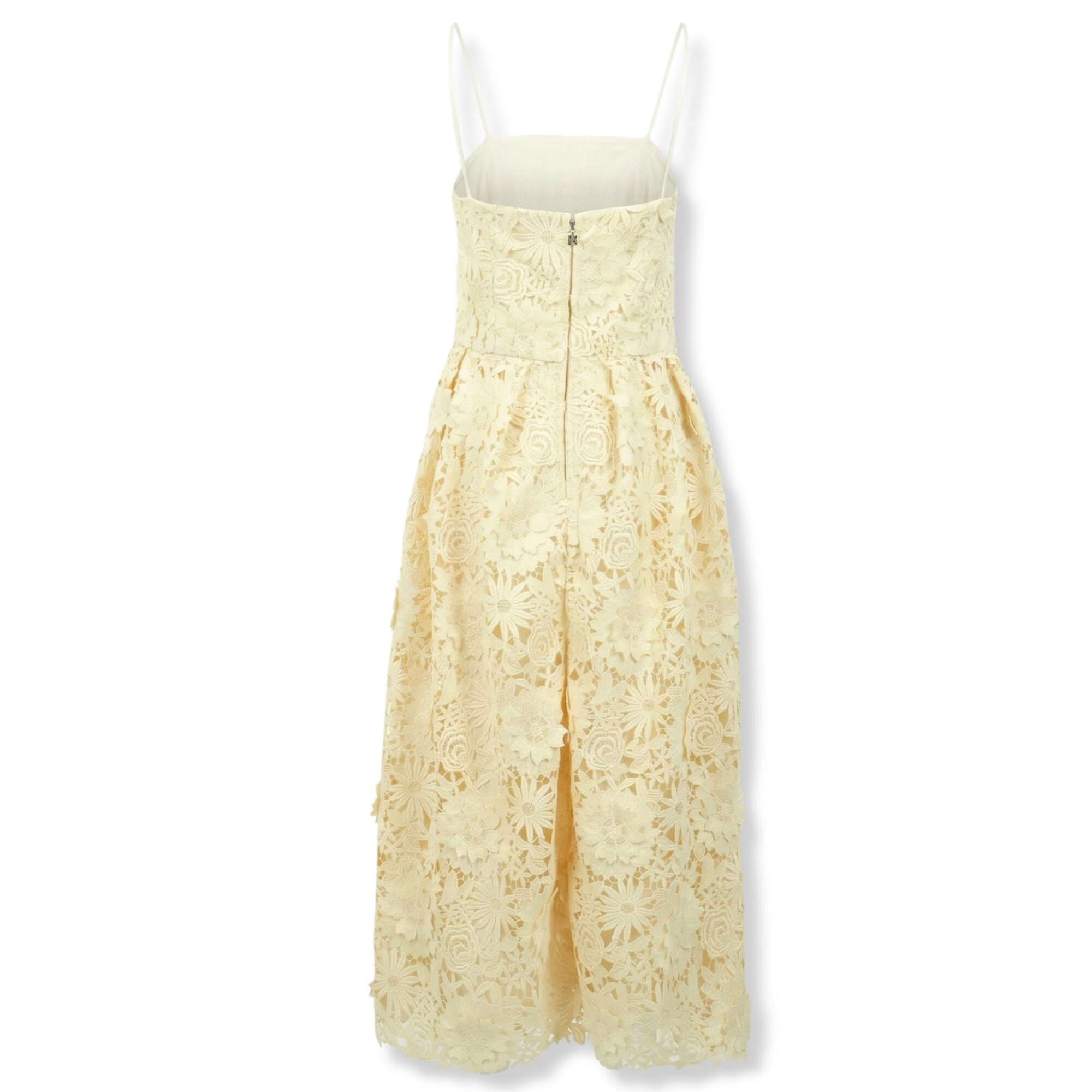 3D Lace Flared Midi Dress Rotate. Design in pizzo con dettagli floreali, corpetto con scollo quadrato e spalline sottili, gonna con orlo smerlato.