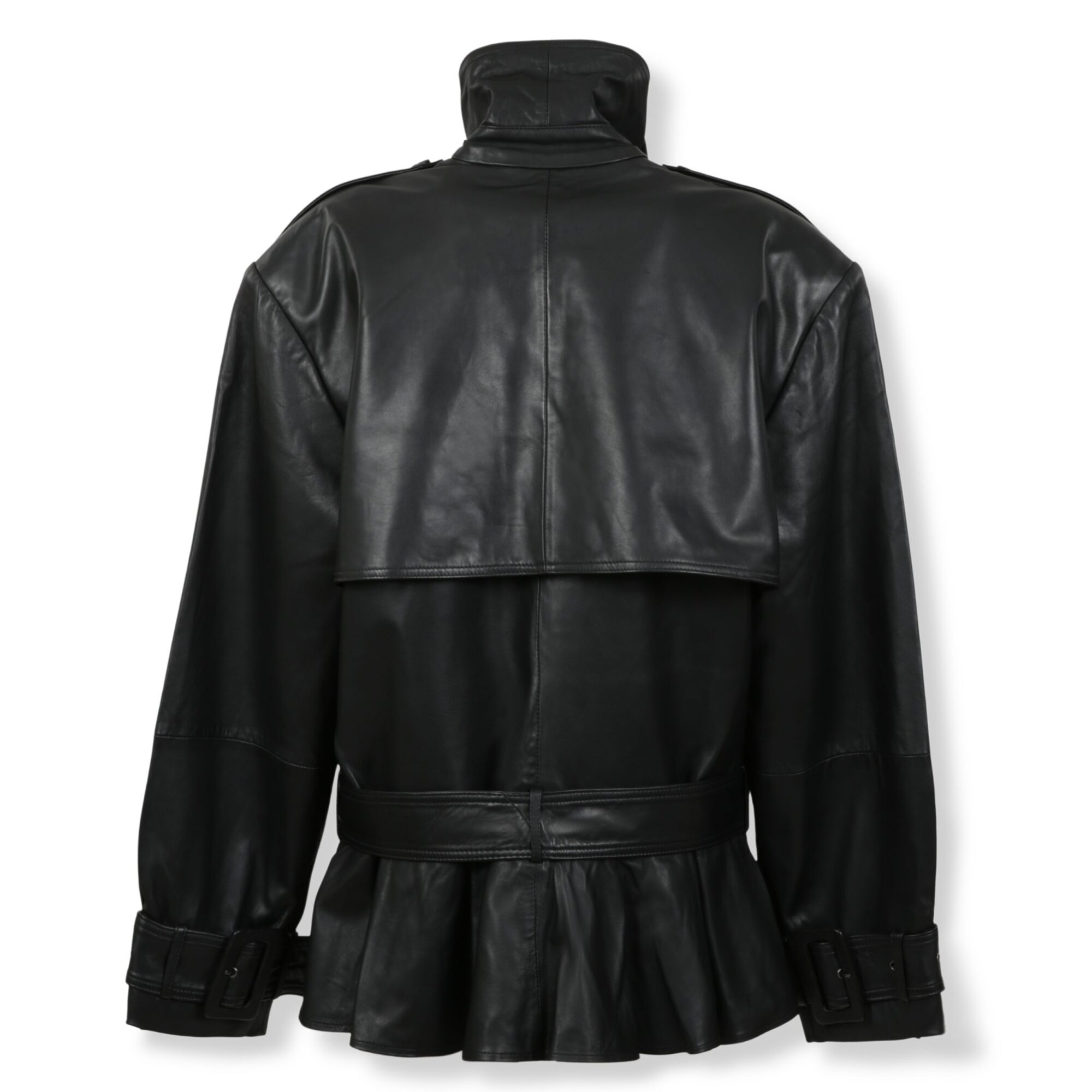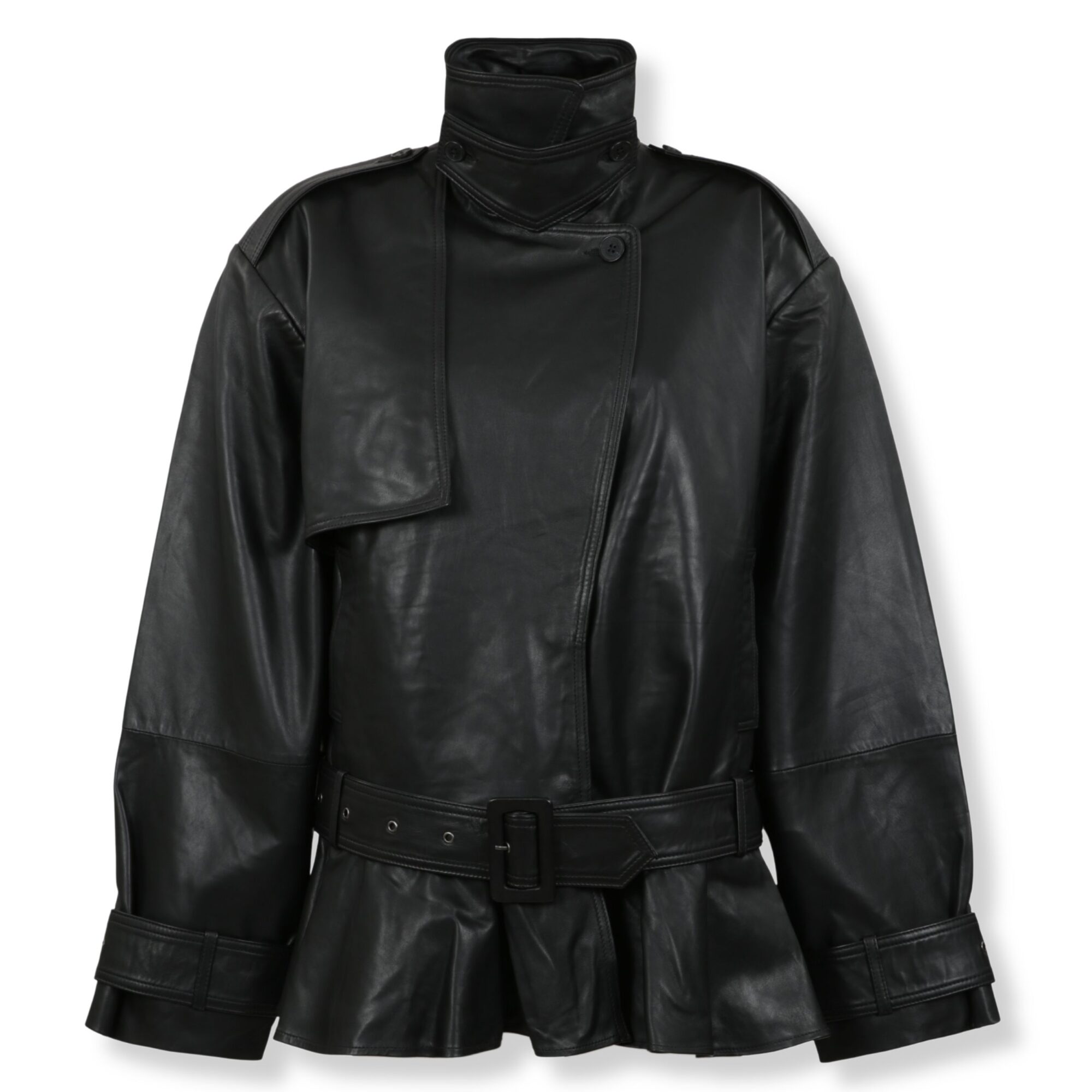 Biker Leather Jacket Rotate. Design con collo alto strutturato, chiusura frontale con bottoni asimmetrica. Cintura coordinata con fibbia e orlo inferiore arricciato.