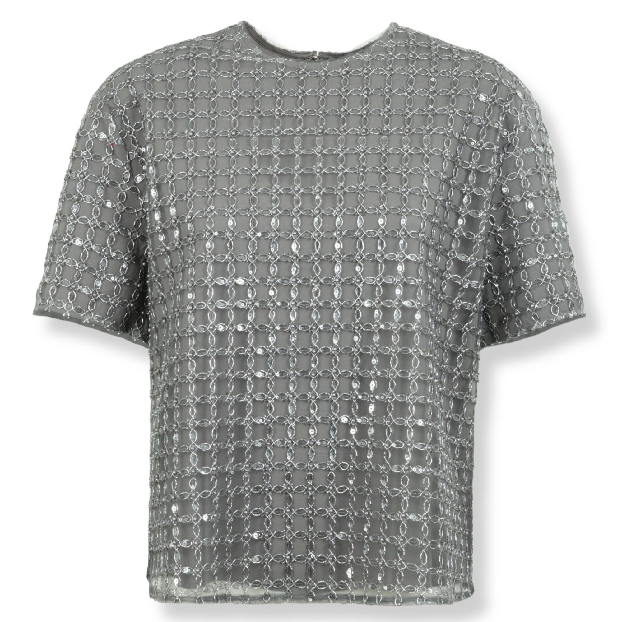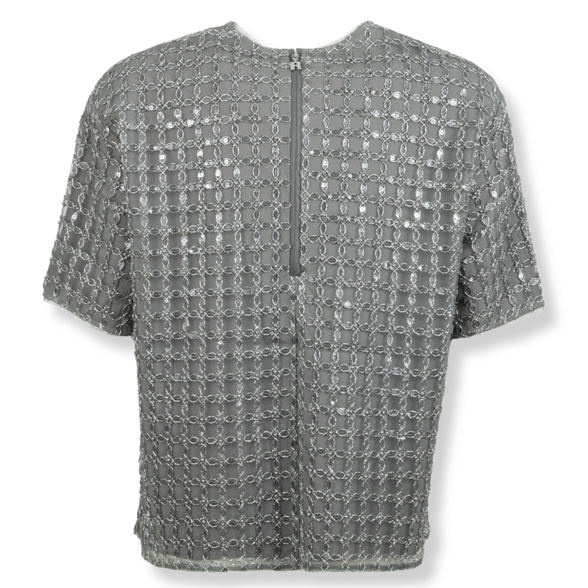 Beaded Top Rotate. Vestibilità oversize, interamente decorato con paillettes, girocollo e chiusura sul retro con zip.