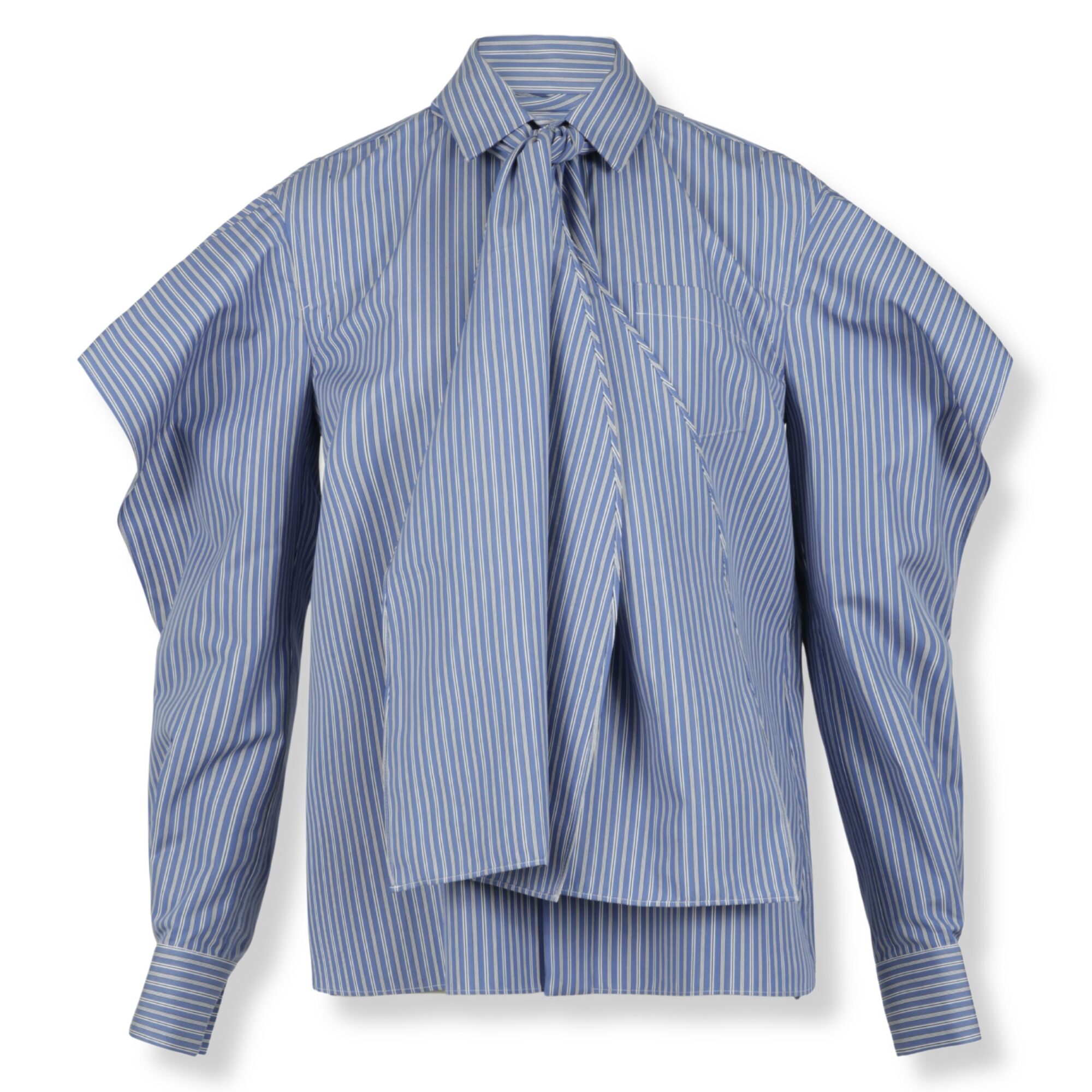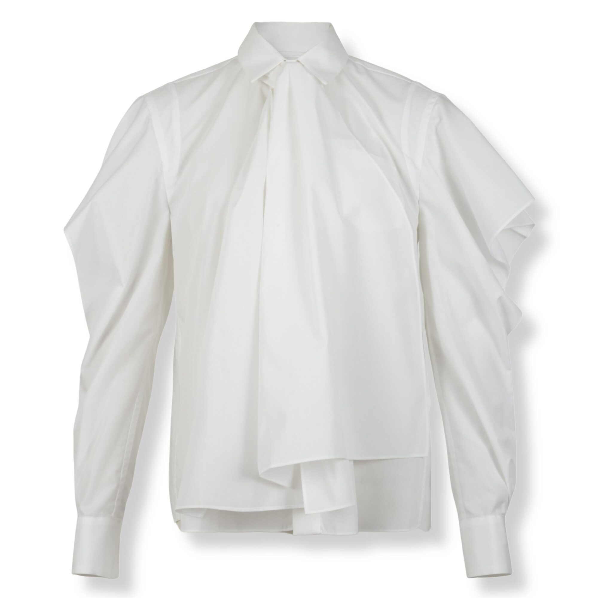 Camicia Sacai. Linea fluida, colletto classico con fascia annodata e maniche con ampi volant.