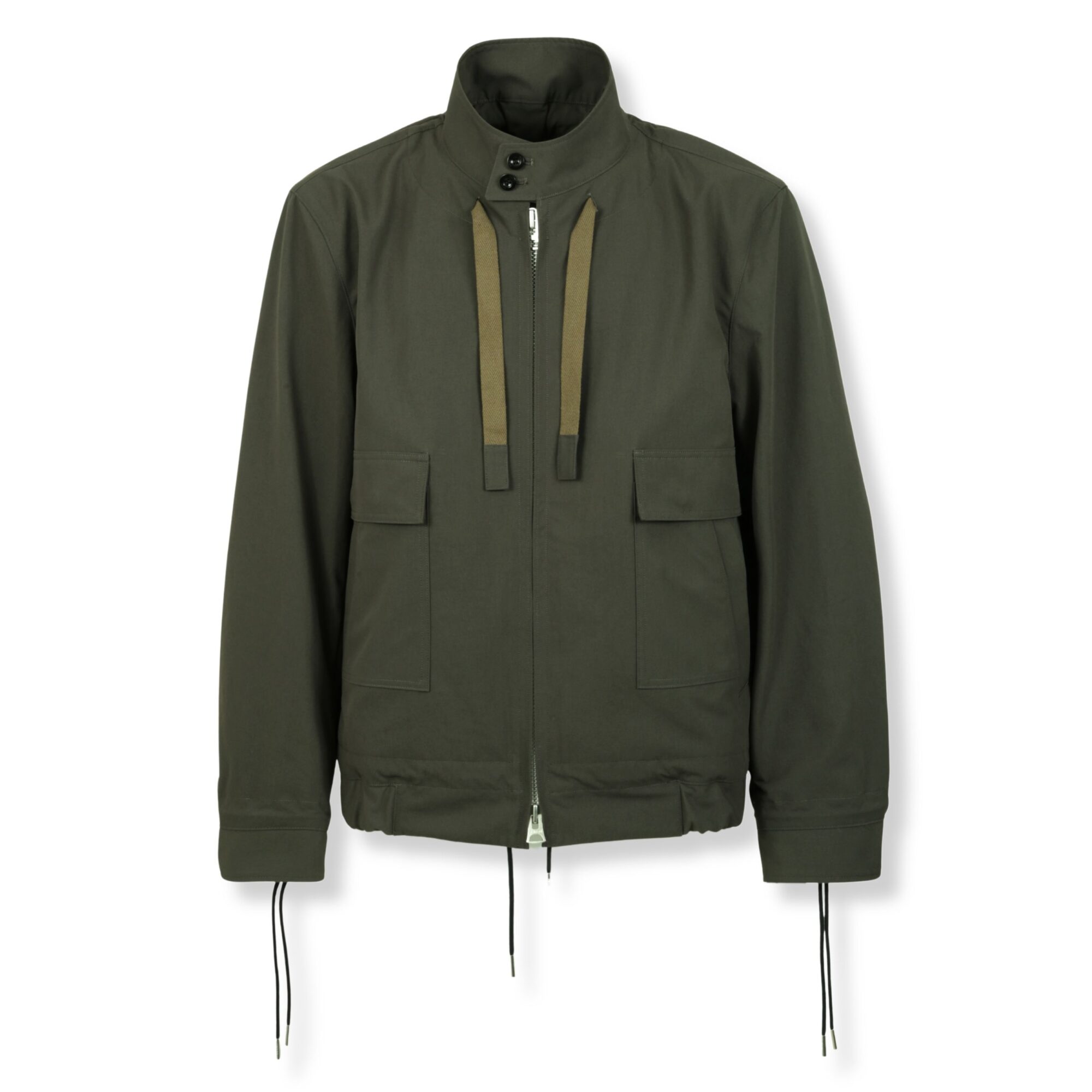 Weathercloth Blouson Sacai. Colletto alto regolabile e chiusura frontale con zip, orlo inferiore e polsini regolabili con coulisse. Retro con mantellina in stile trench e due tasche con patta sul davanti.