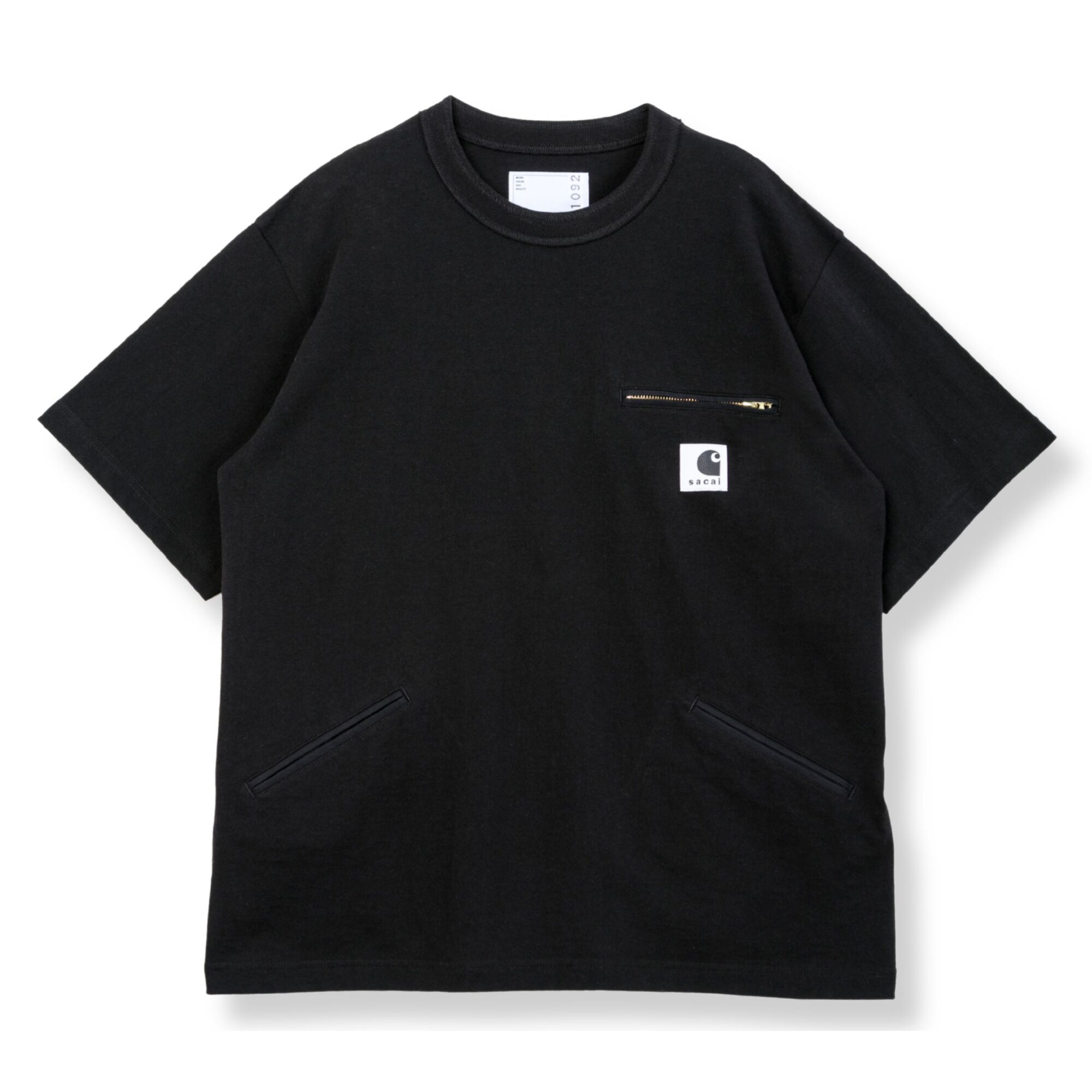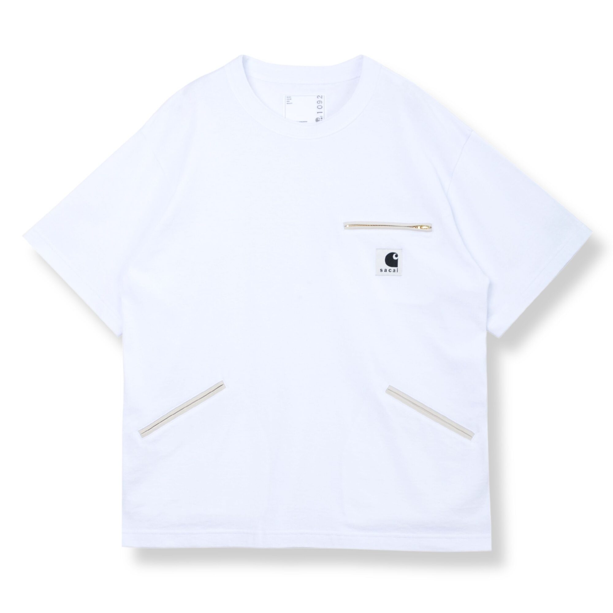 T-Shirt Sacai X Carhatt Wip. Vestibilità rilassata, girocollo, due tasche anteriori a filetto e un taschino con zip sul petto.