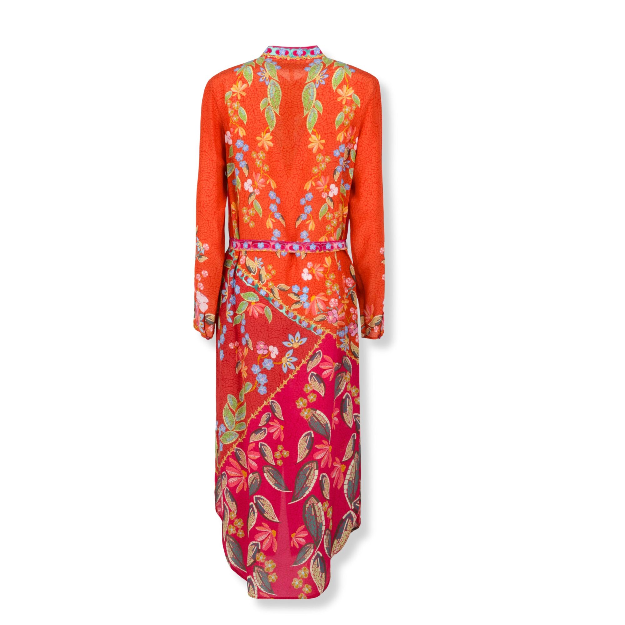 Molly D Dress Saloni. Vestibilità morbida e stampa su tutta la superficie, girocollo e abbottonatura frontale, cintura coordinata in vita e gonna con cadenza fluida.