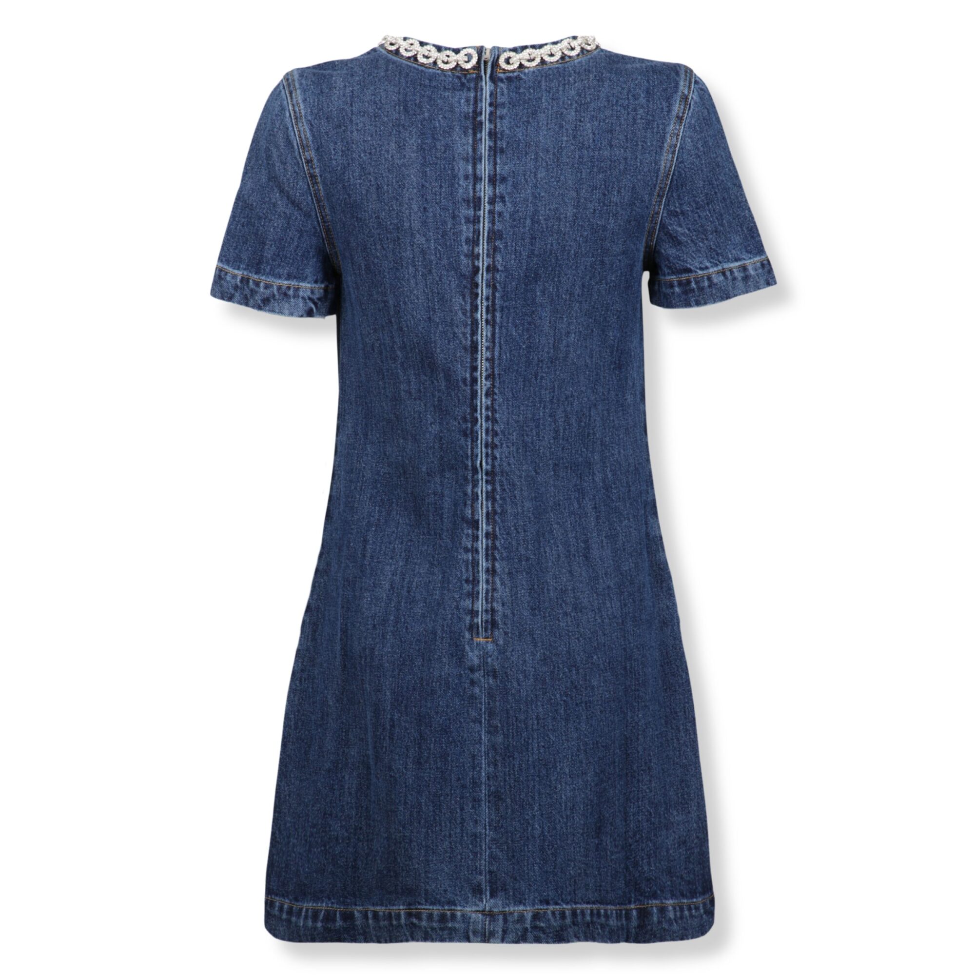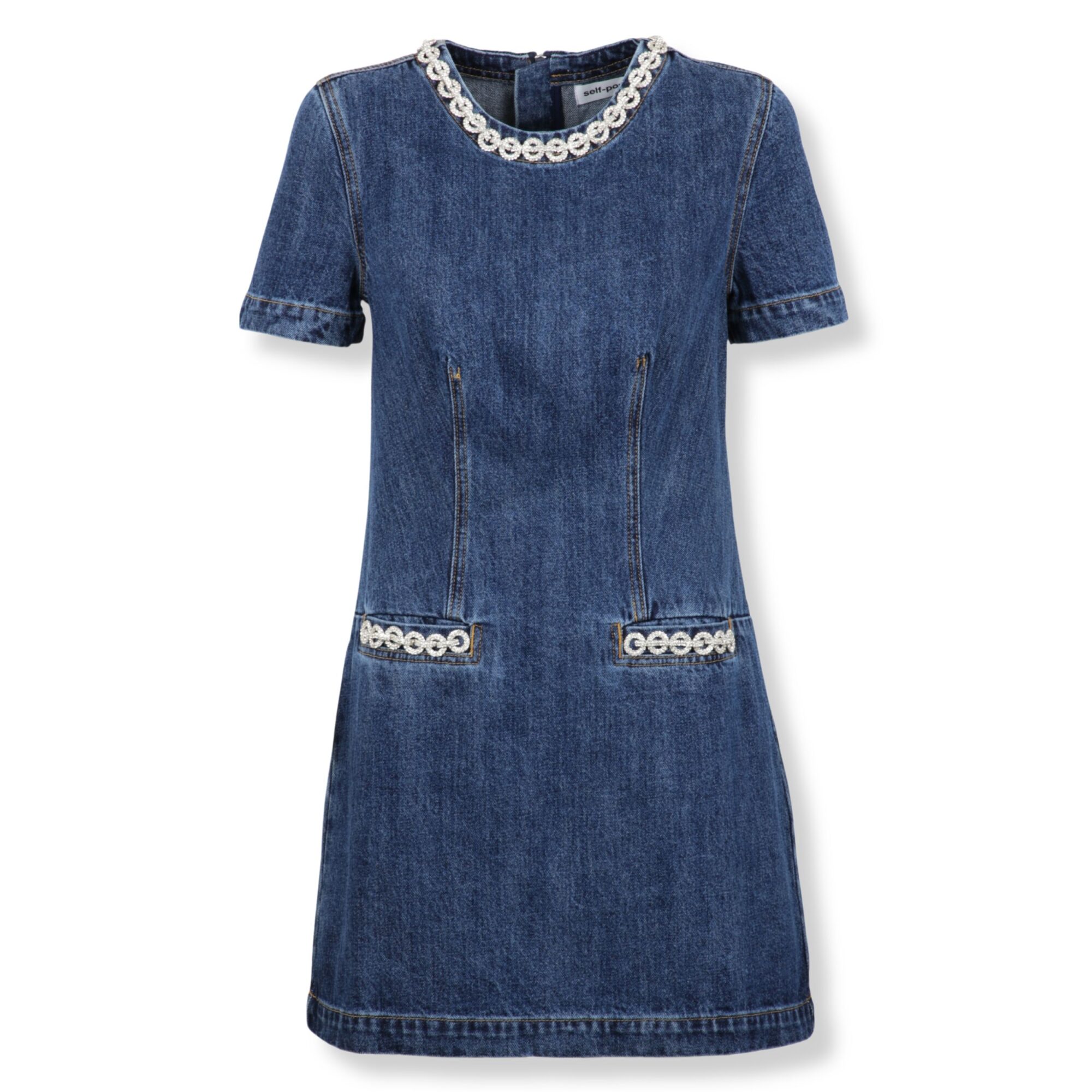 Blue Embellished Wide Leg Jeans Self-Portrait. Girocollo, maniche corte e vestibilità ampia. Impreziosito con fiori in cristallo su collo e tasche a filetto sul davanti. Chiusura a zip sul retro.