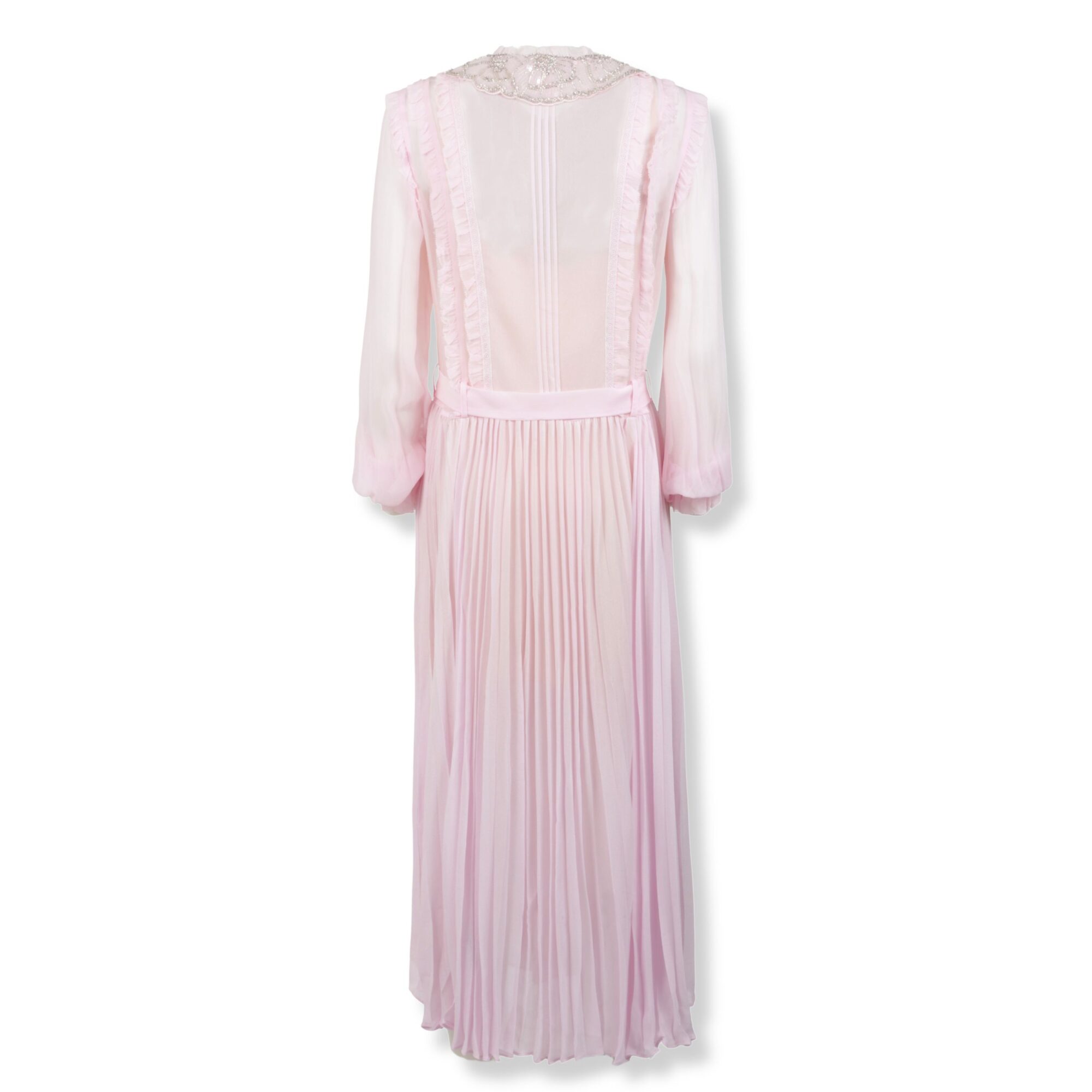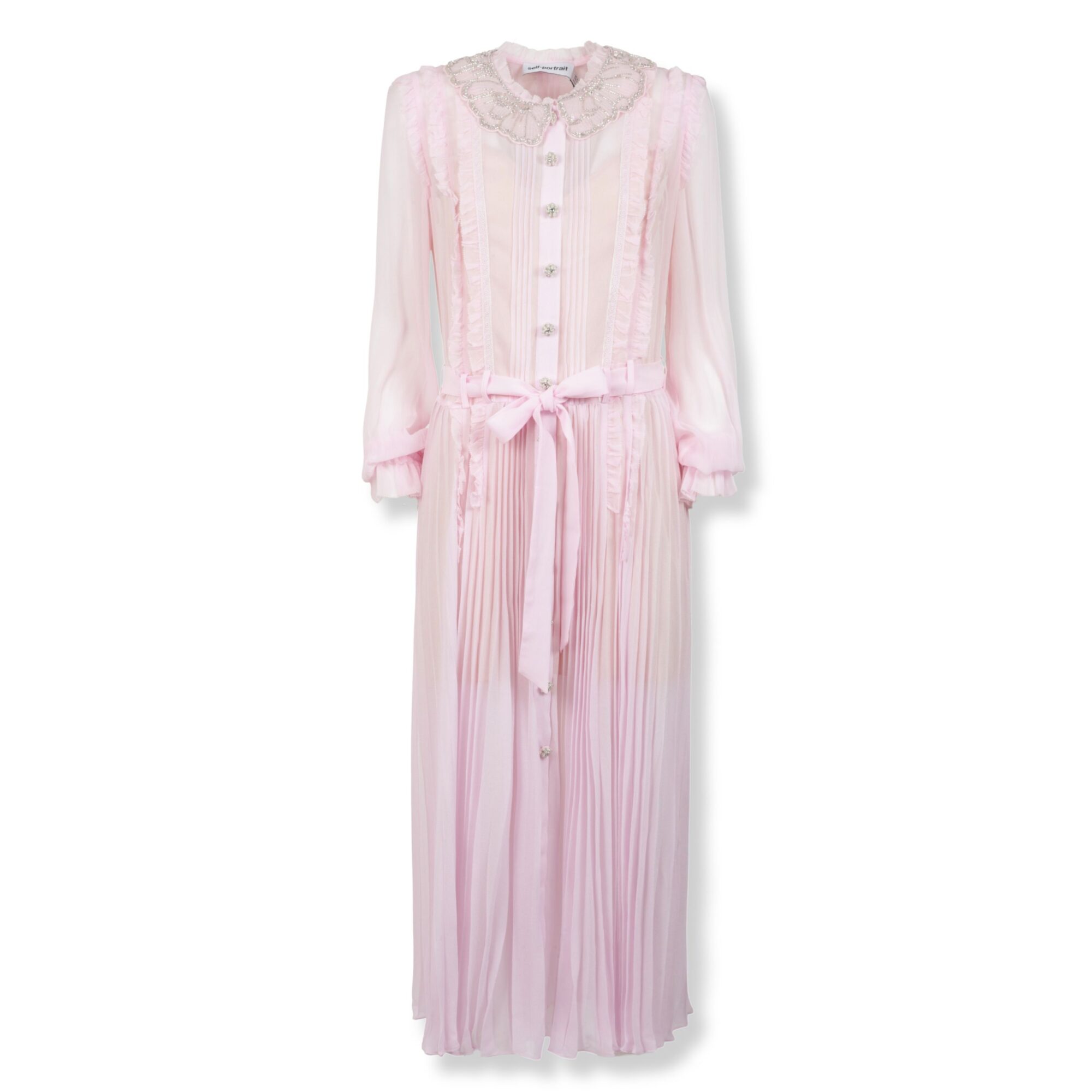 Pleated Georgette Midi Dress Self-Portrait. Design con lavorazione plissé e volant, colletto decorato con ricami in cristalli e abbottonatura frontale, maniche semi-trasparenti e gonna con orlo svasato.