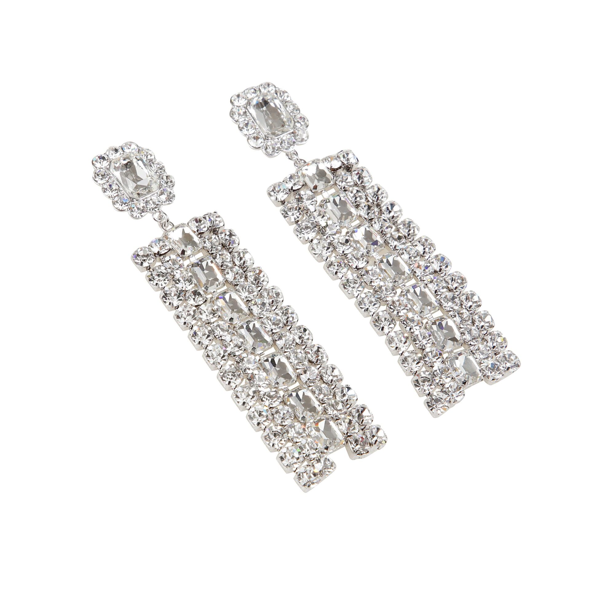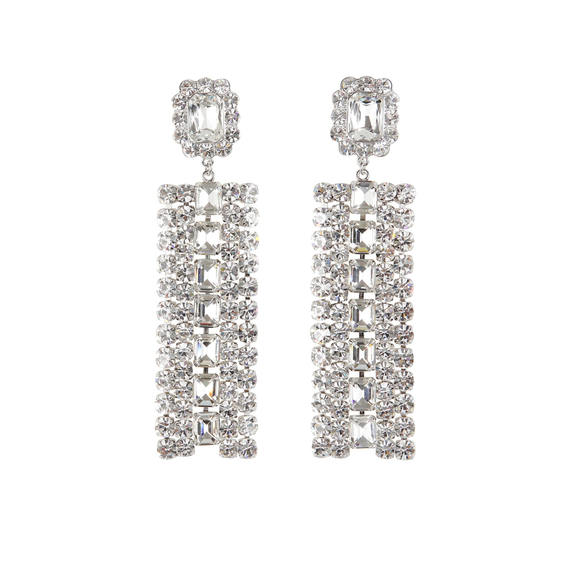 Orecchini con lungo pendente rettangolare con cristalli. Pietre centrali taglio baguette e laterali taglio brillante.