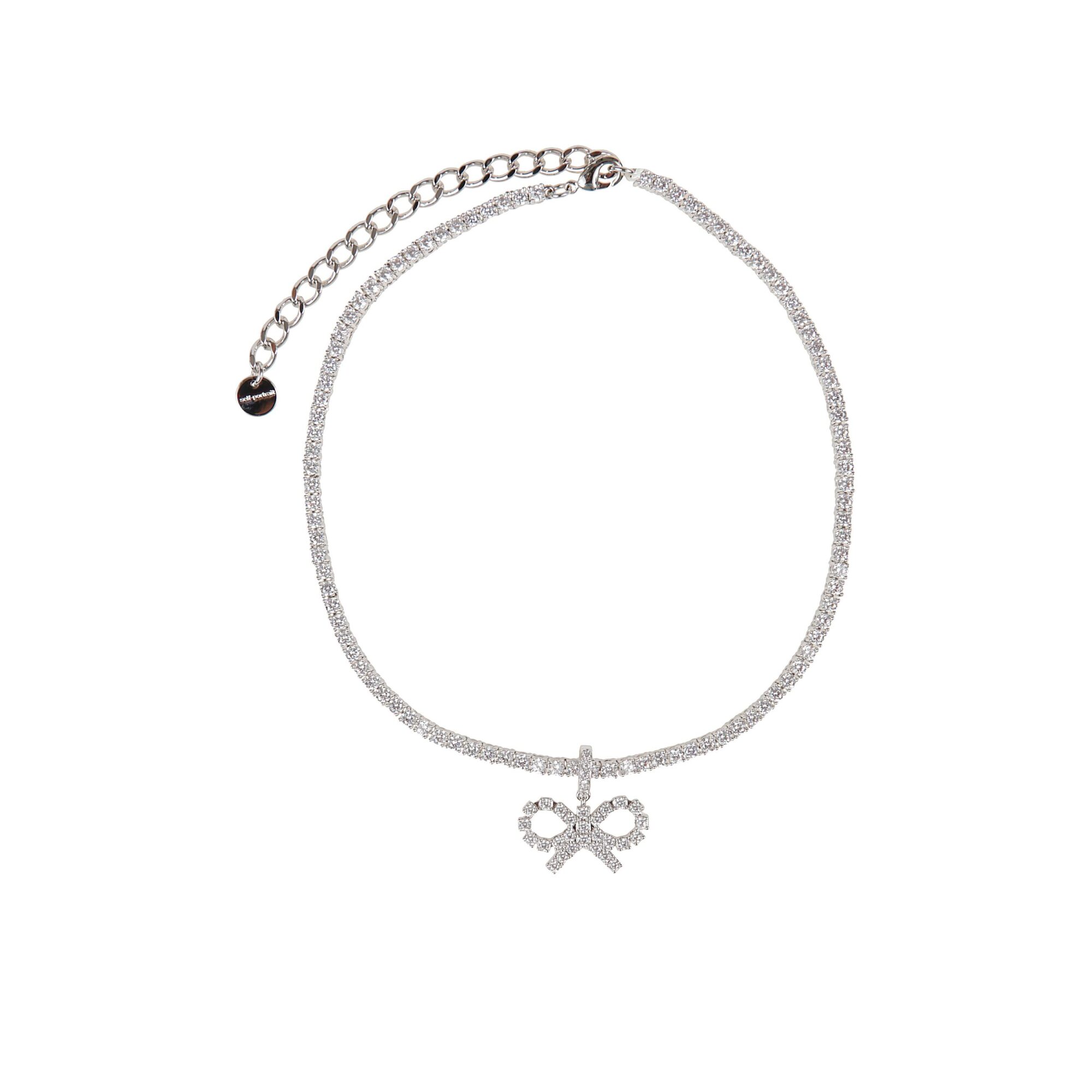 Collana sottile in pavé di cristalli con pendente a fiocco, decorato con cristalli. Chiusura con catenina metallica regolabile.
