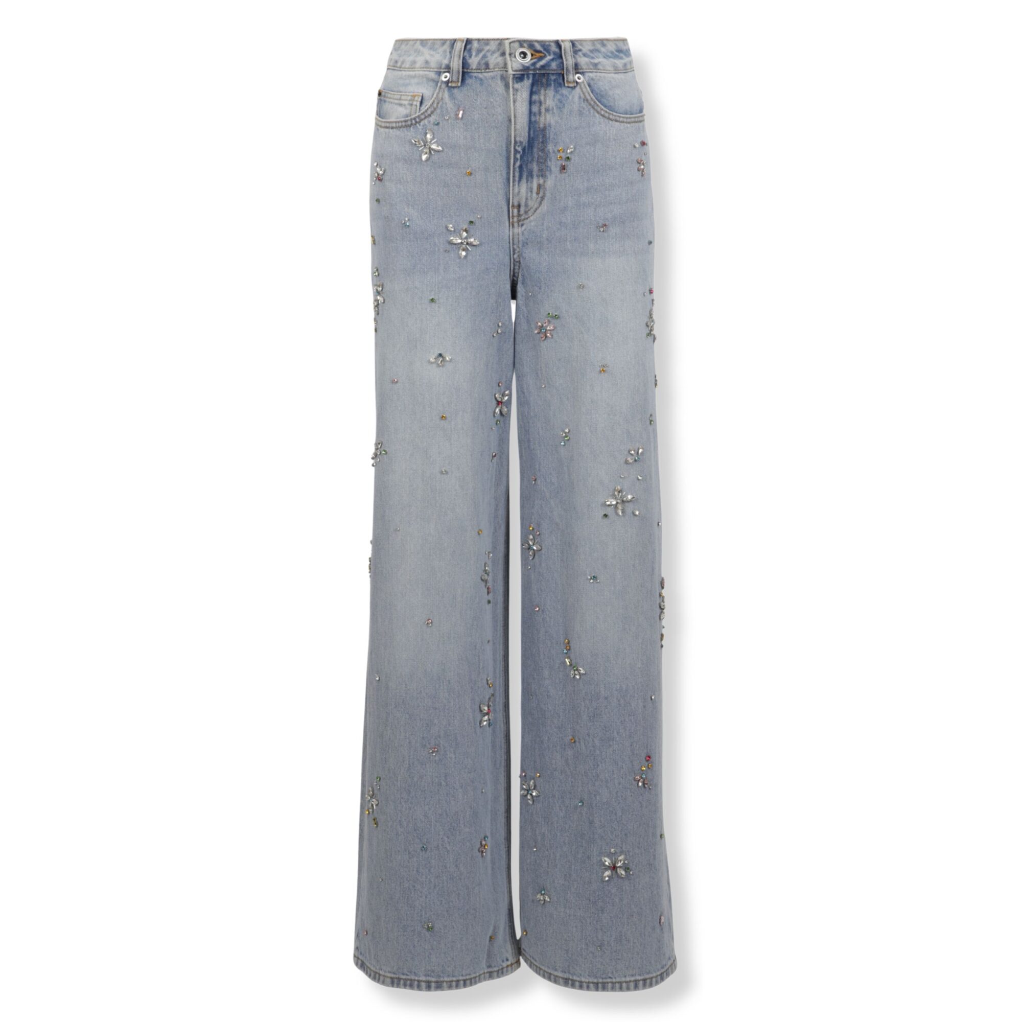 Light Blue Embellished Wide Leg Jeans Self-Portrait. Design con vestibilità ampia, impreziositi da fiori di strass su tutto il corpo. Cinque tasche, chiusura frontale con zip nascosta e bottone.