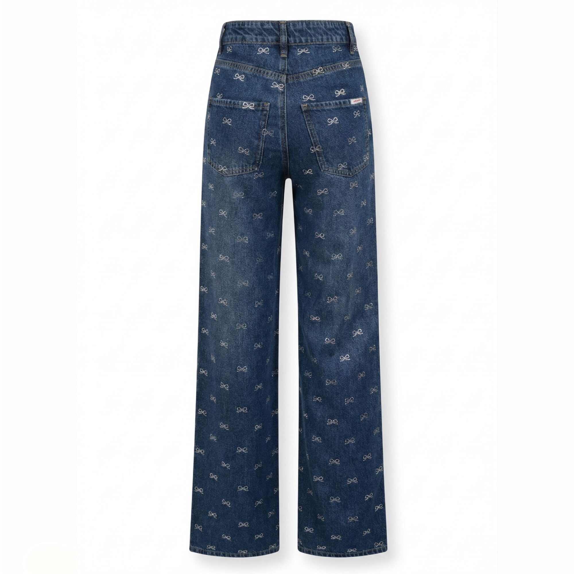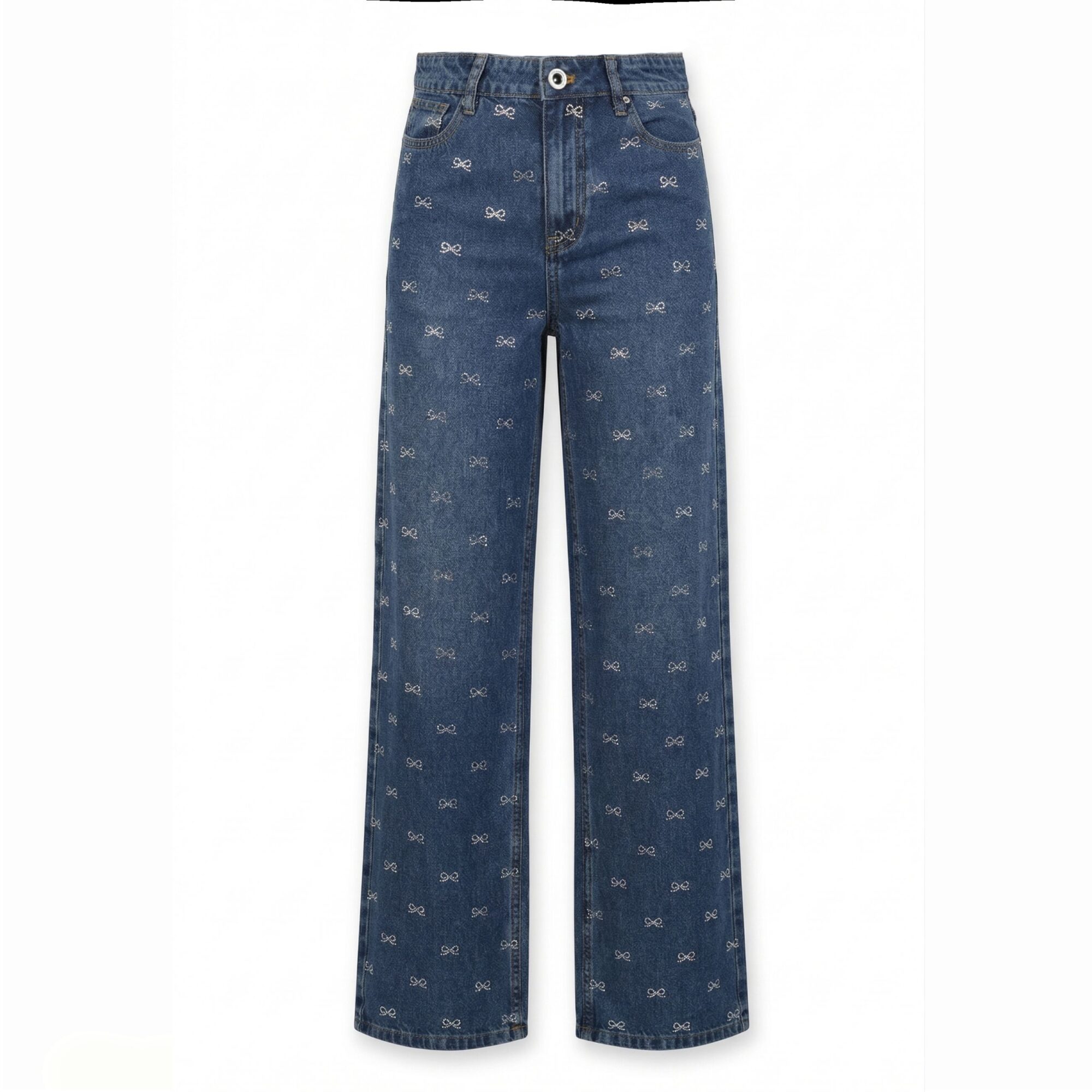 Bow Embellished Jeans. Design in denim leggero, vita alta, decorazioni con fiocchi impreziositi da strass, linea dritta.