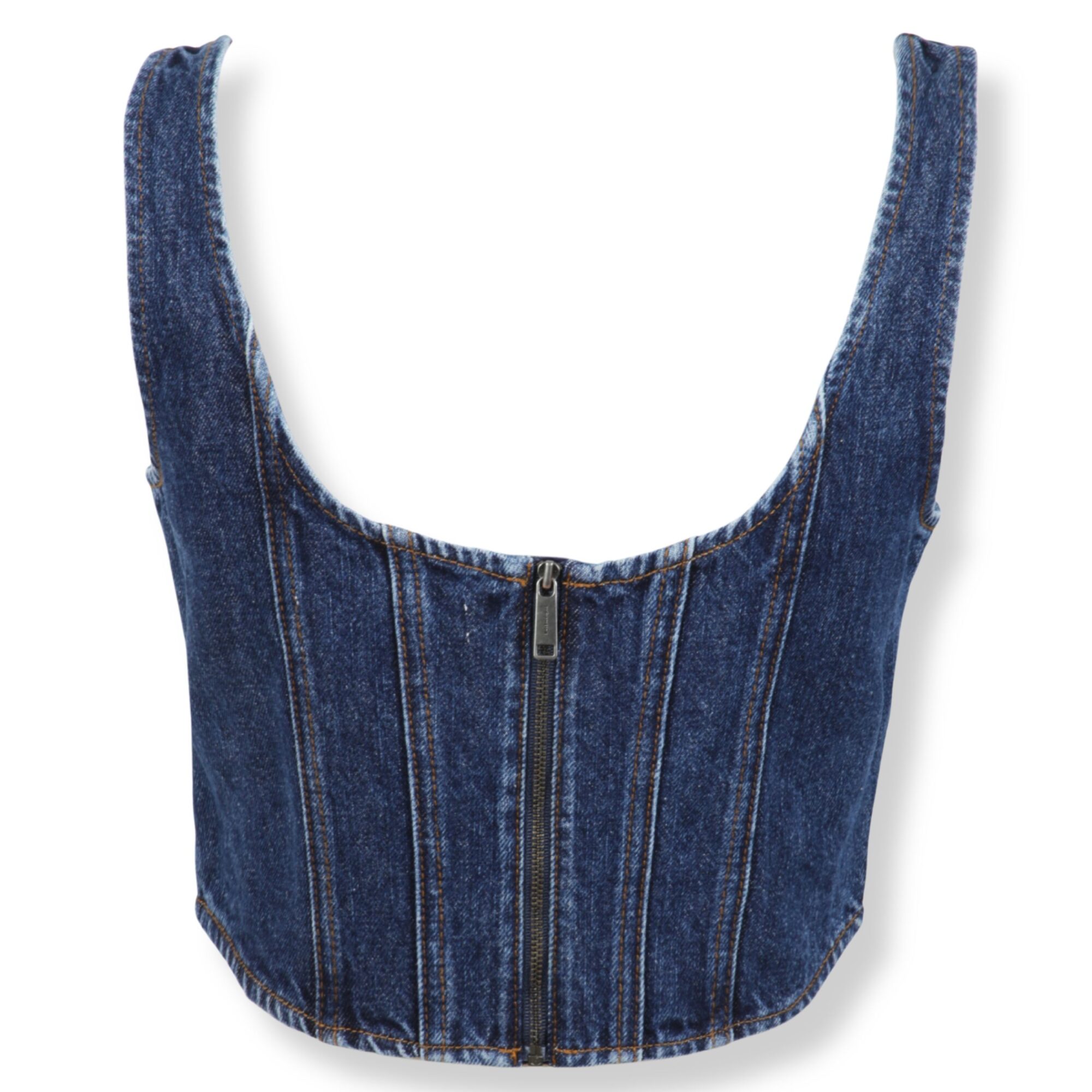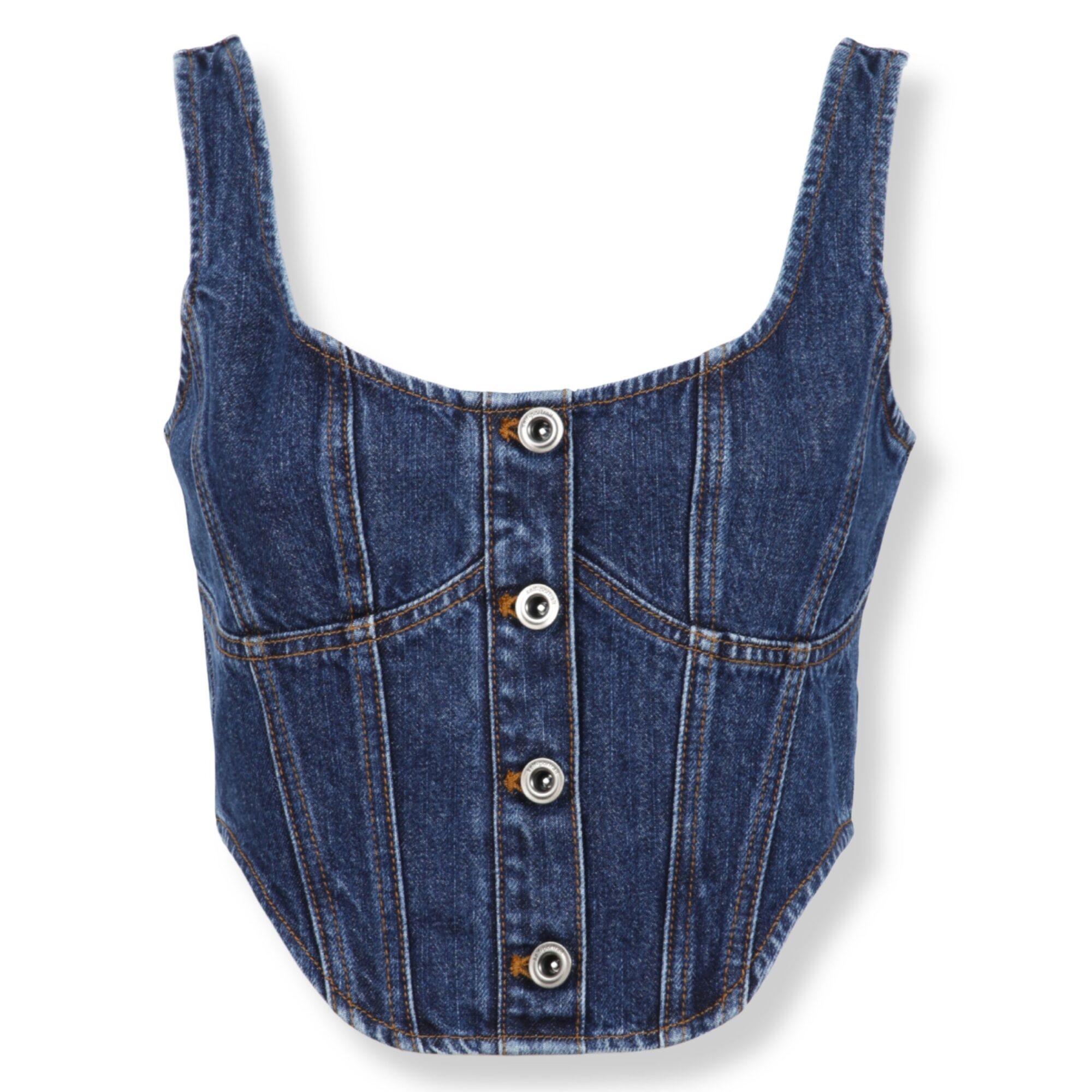 Denim Corset Top Self-Portrait. Vestibilità aderente, scollo squadrato e orlo inferiore curvo con bottoni frontali e chiusura a zip sul retro.