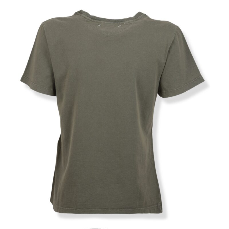 Maglia a maniche corte con motivo a righe orrizzontali in colorazione verdino chiaro e bianco. Decorazione di perle e diamanté sullo scollo. Retro con chiusura a goccia con bottone.