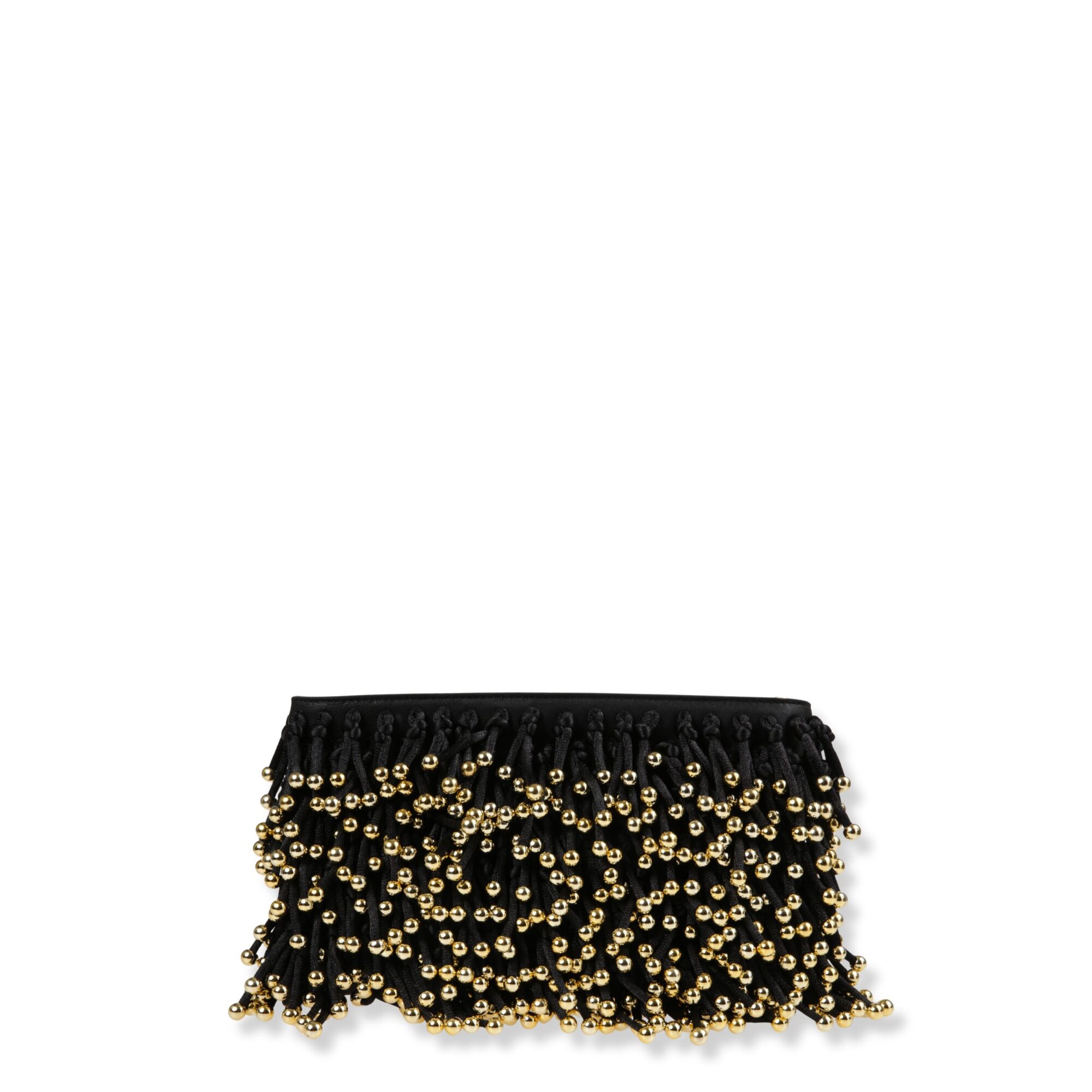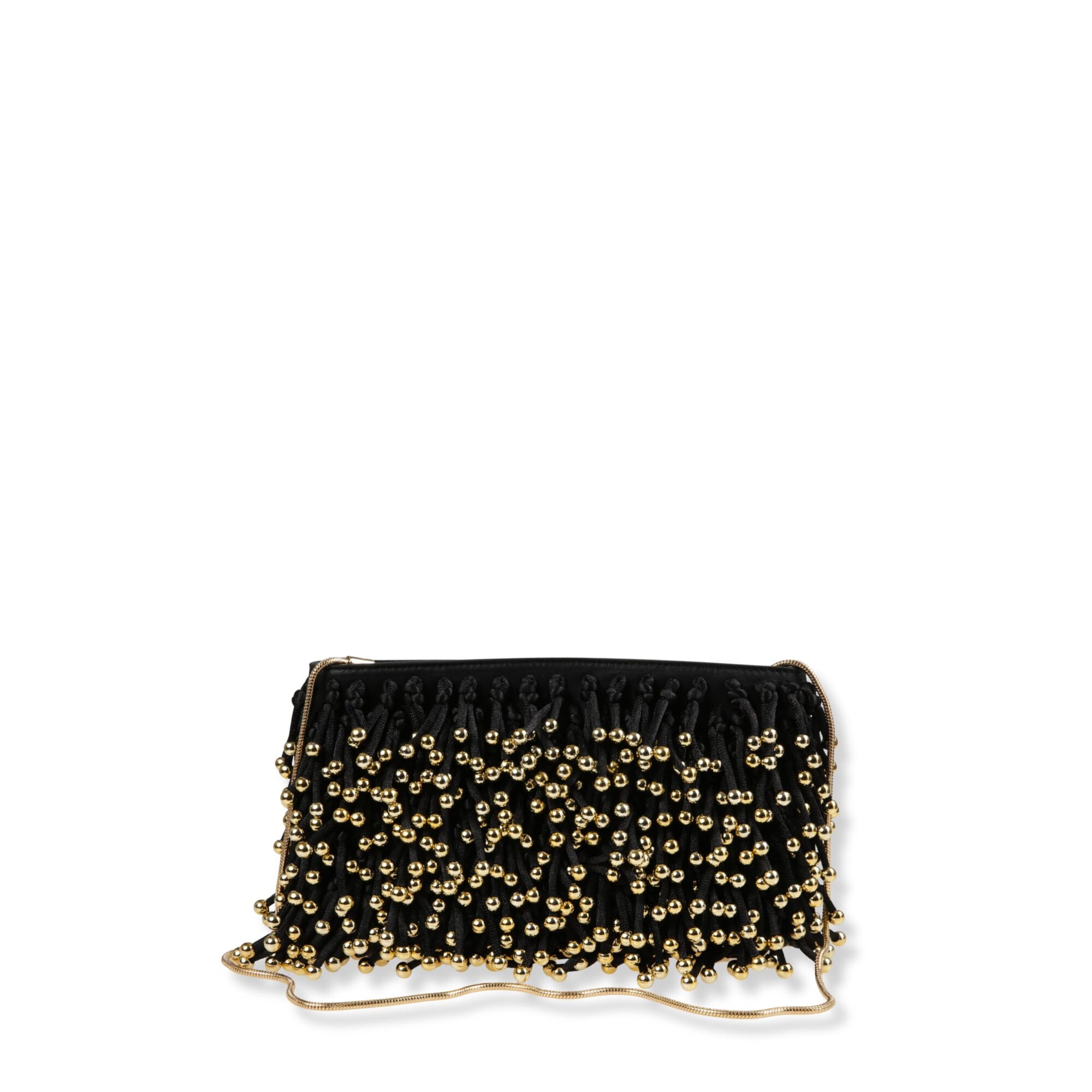 Rese Beeded Fringe Clutch Simkhai. Decorata con frange e perline su tutta la superficie, chiusura superiore con zip e tracolla removibile.