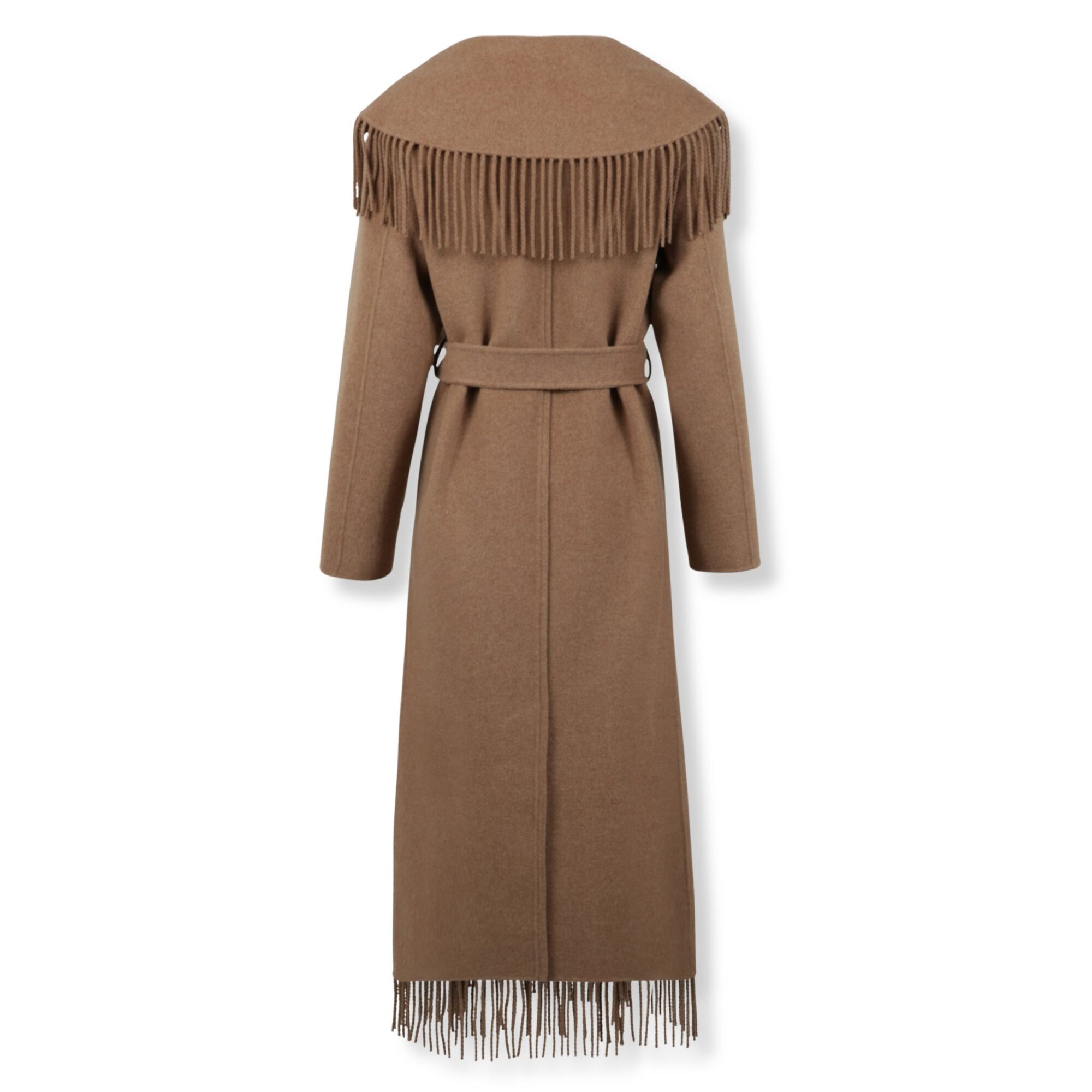 Carrie Fringe Coat Simkhai. Ampio collo ripiegato e cintura coordinata. Design stile vestaglia, con frange sui bordi.