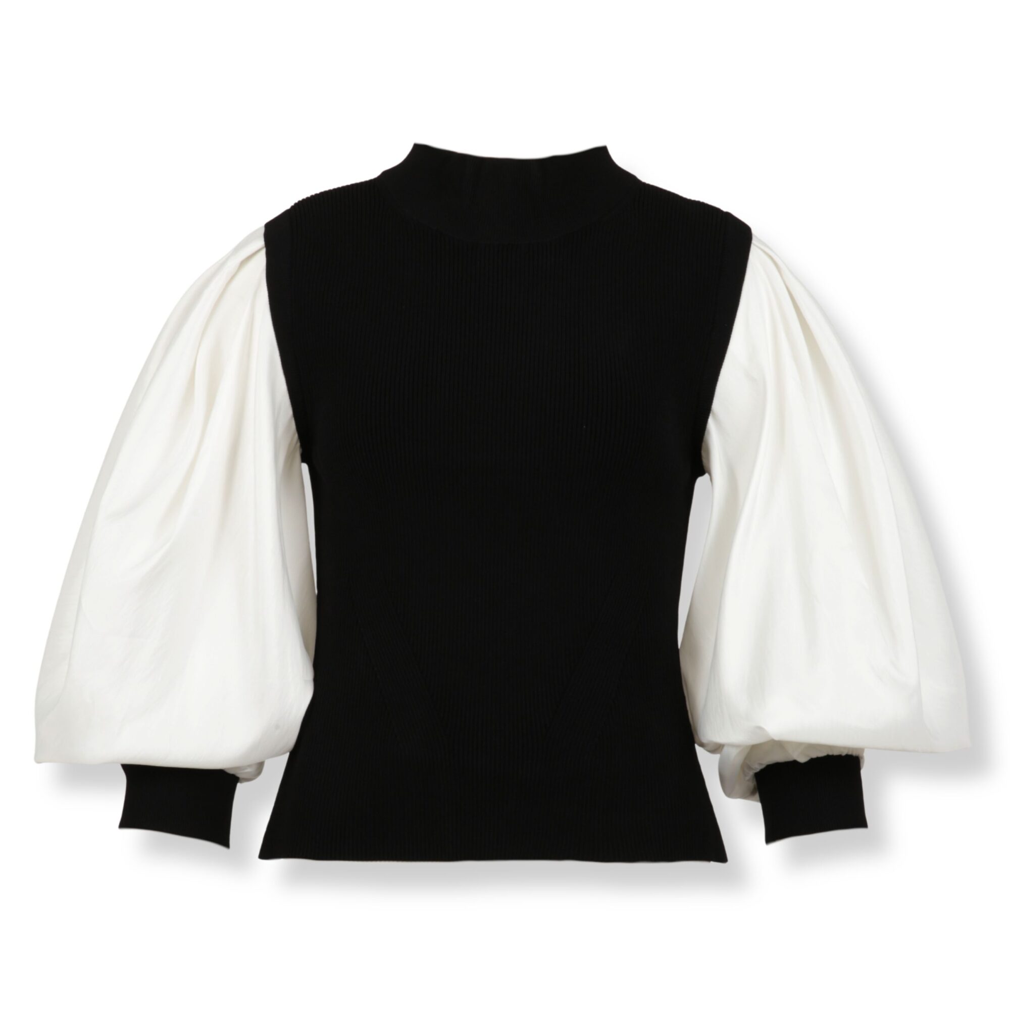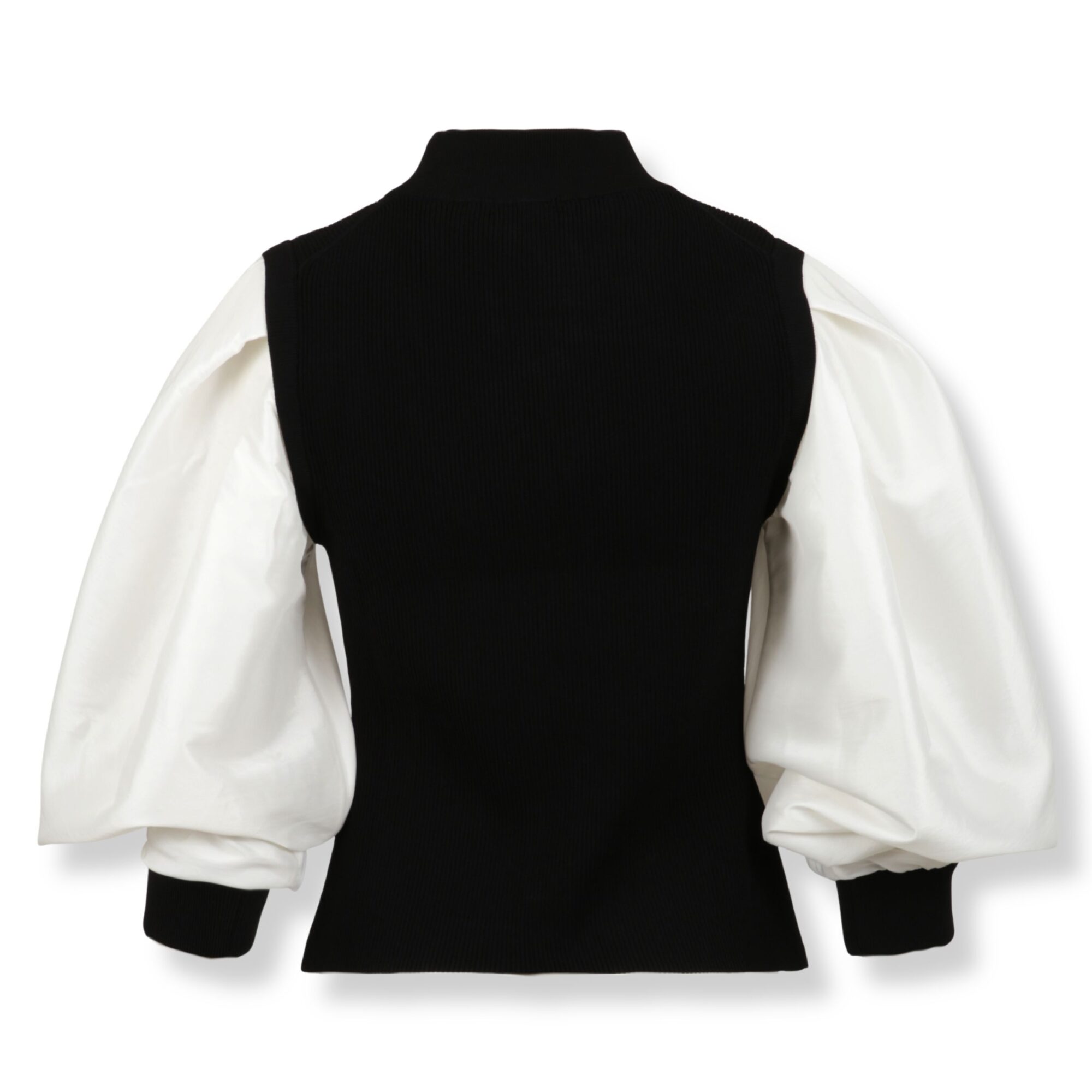 Jackie Top Simkhai. Collo alto, corpo in maglia aderente lavorata a costine e maniche voluminose in taffetà con polsini elasticizzati.