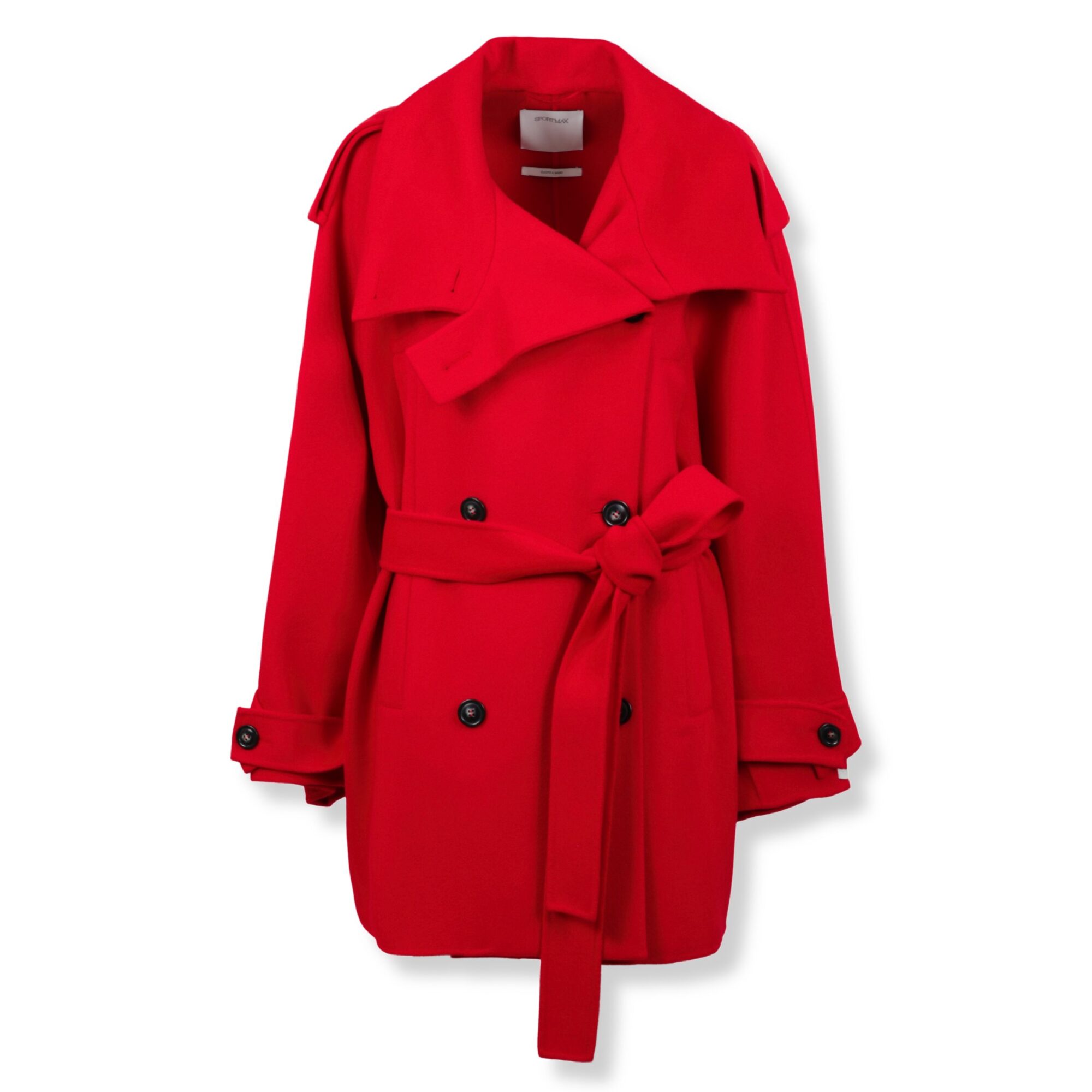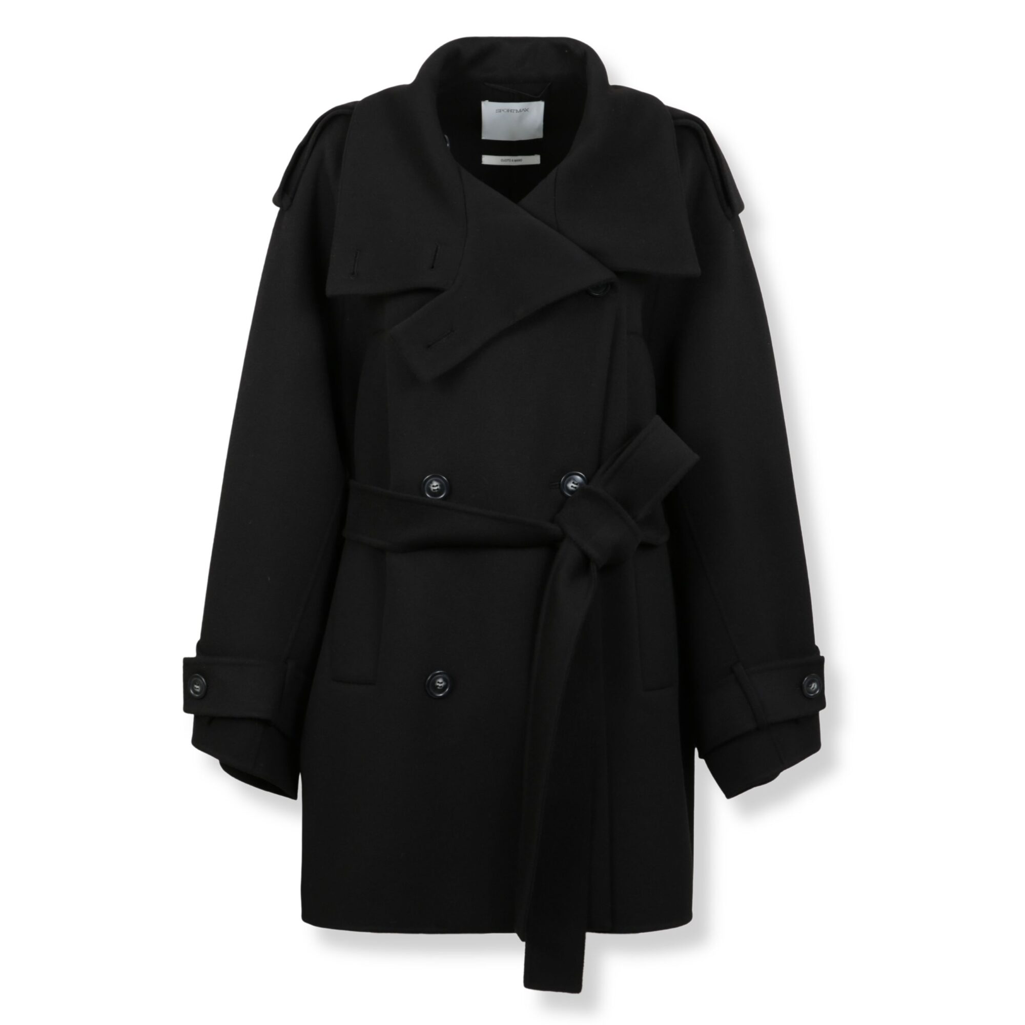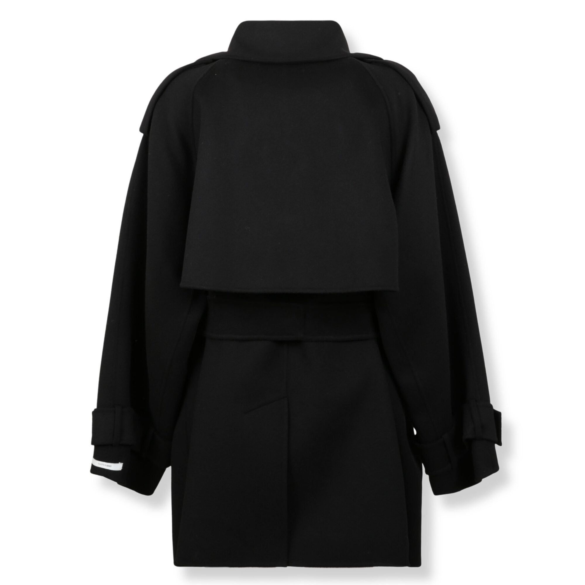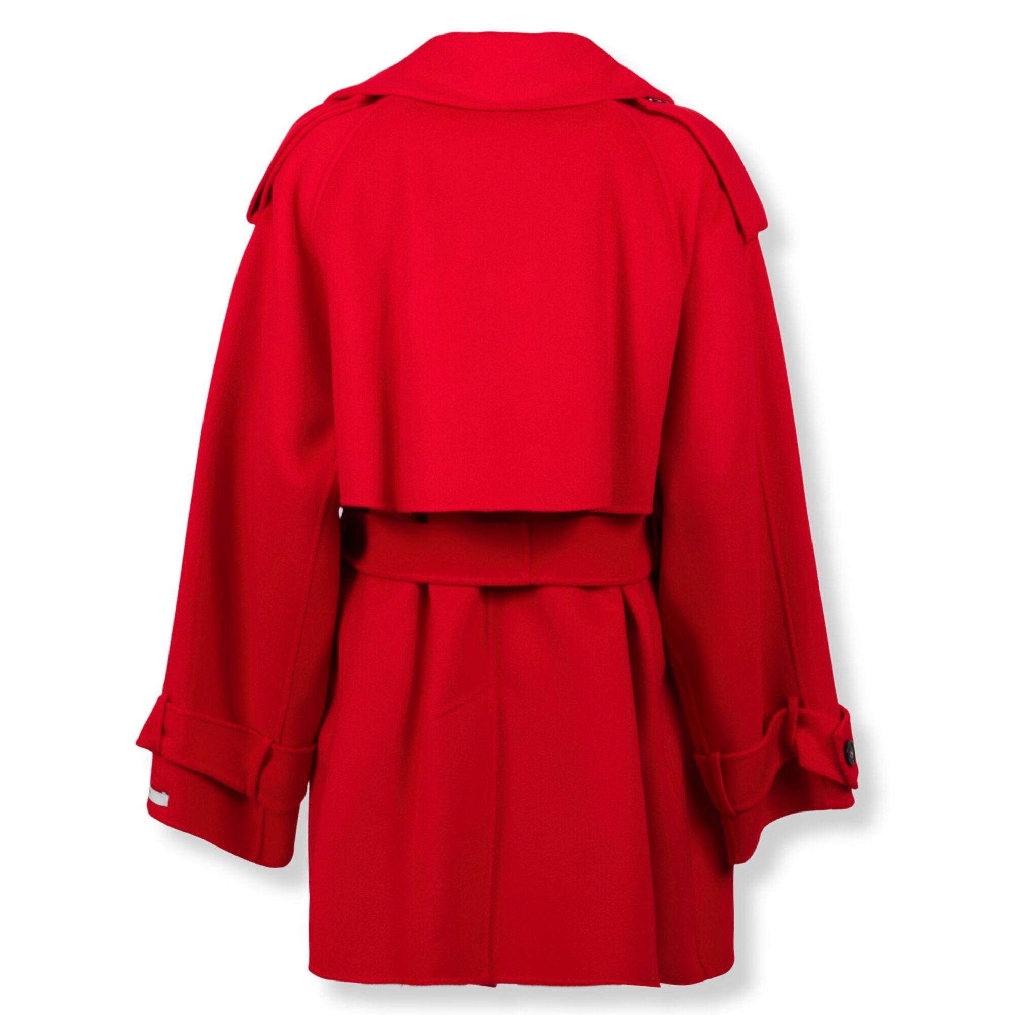 Trench corto Sportmax. Linea oversize, collo rialzato con doppio bottone e polsini con alamari. Tasche a filetto verticali e chiusura con cintura coordinata in vita.