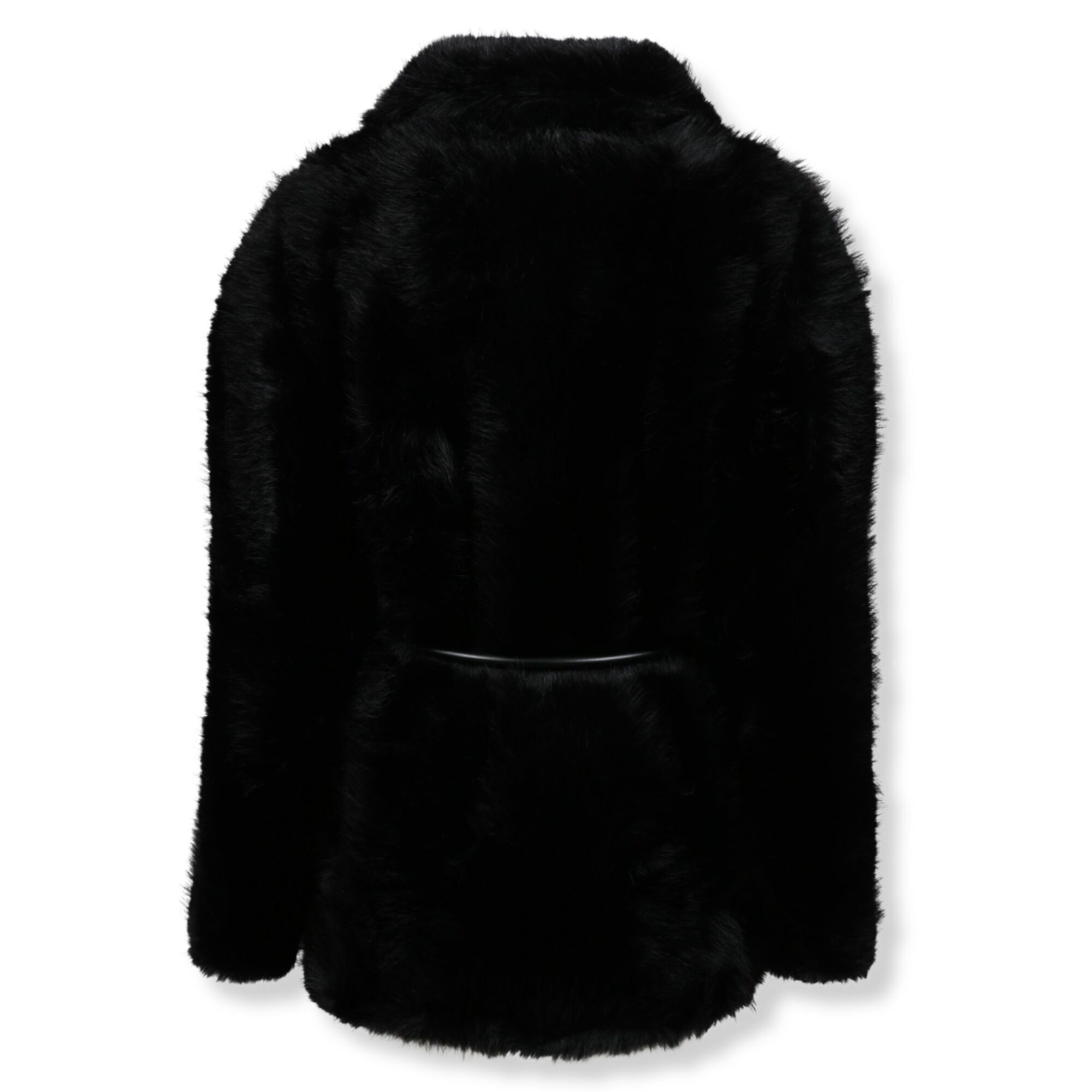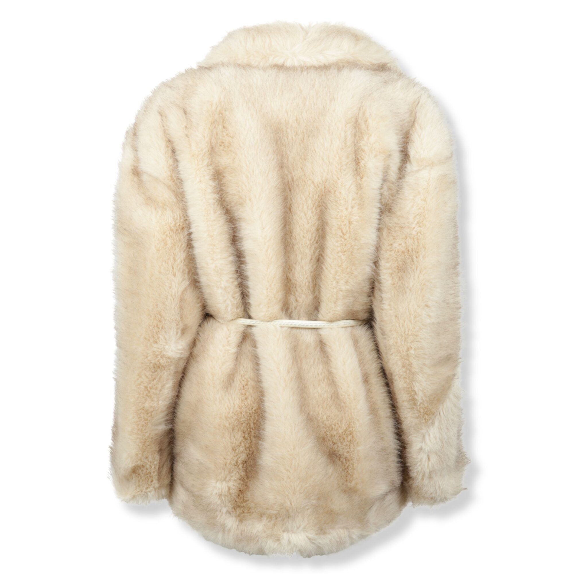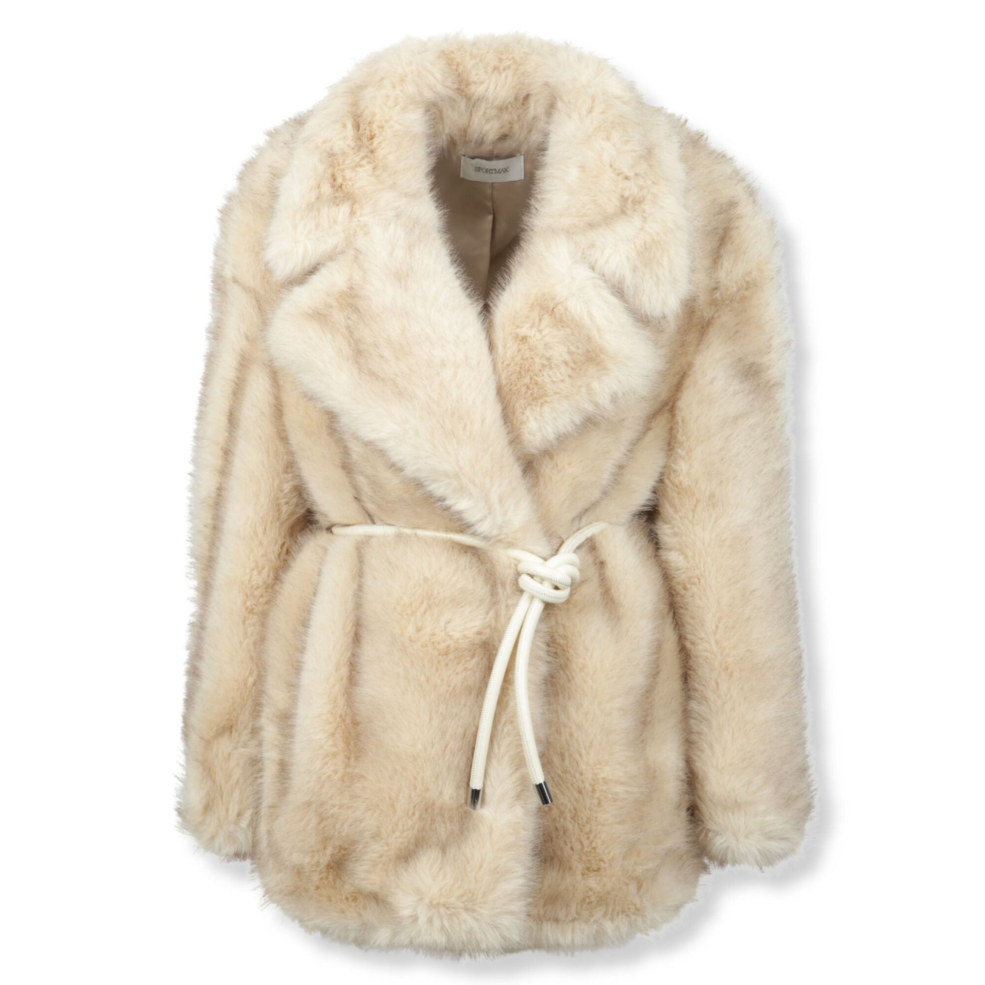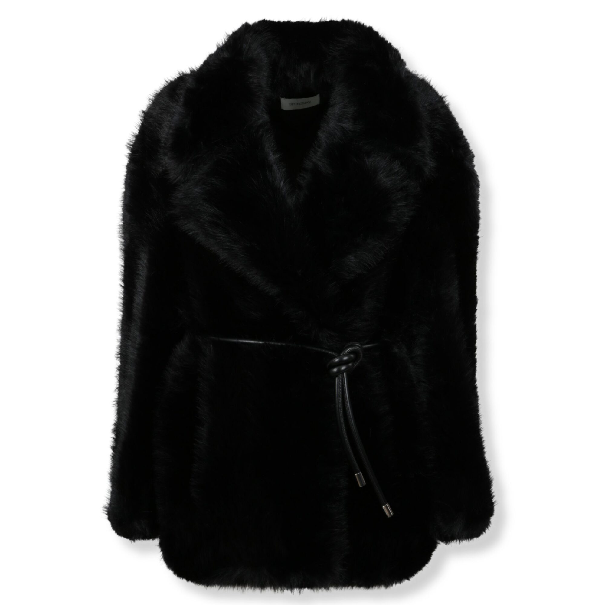 Giaccone Rosaria. Design in tessuto effetto furry, vestibilità ampia. Collo rever largo e chiusura con cintura coordinata in vita.