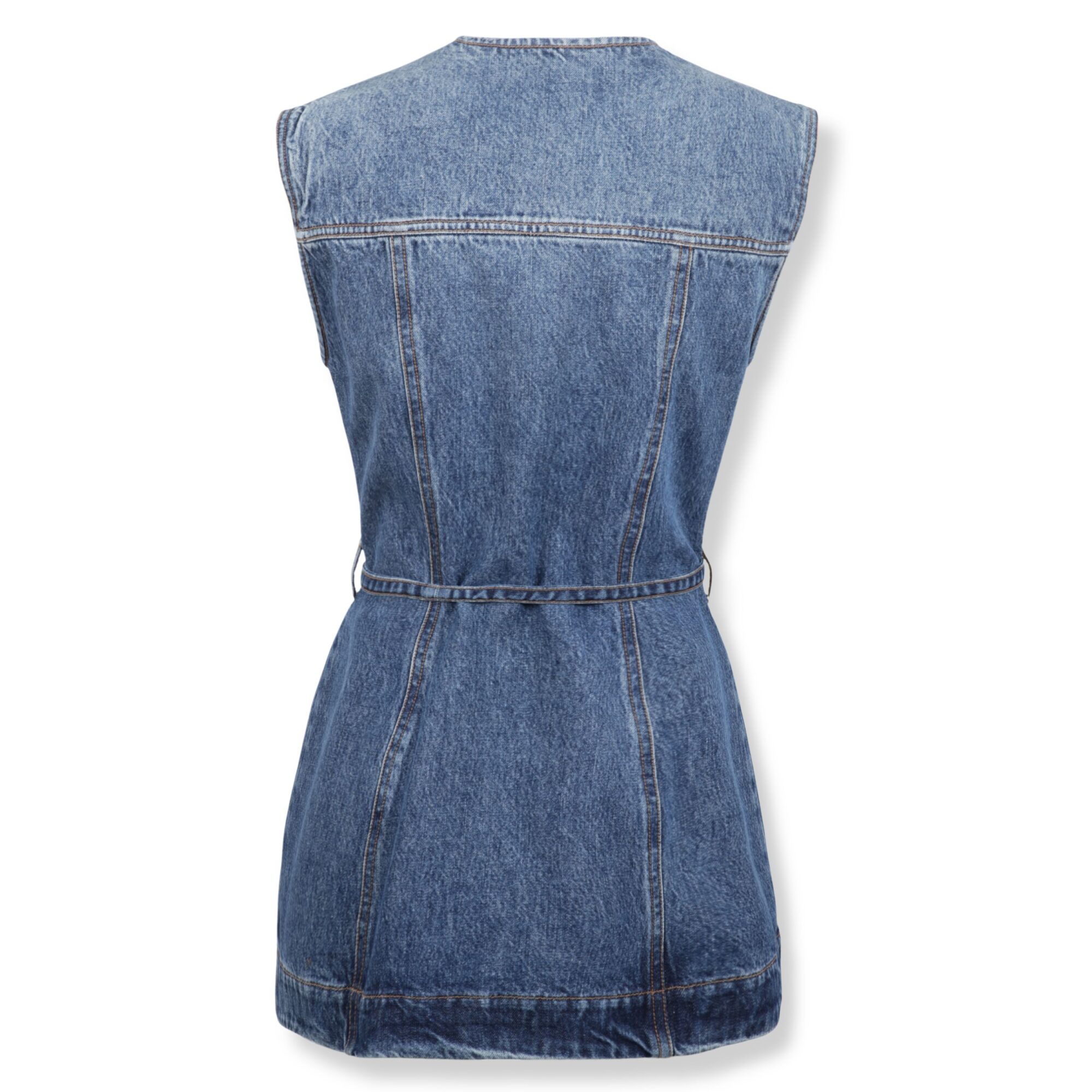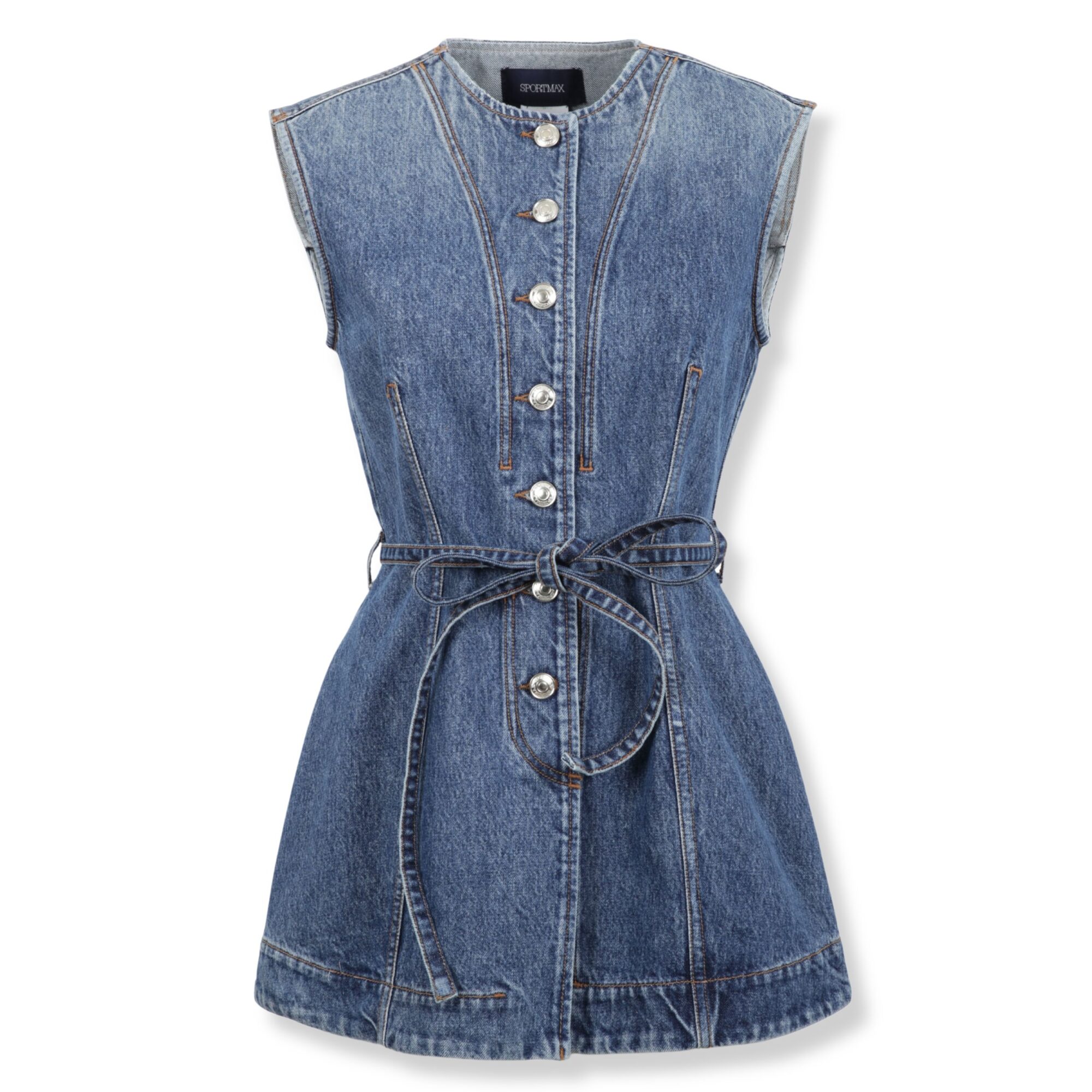 Top Sportmax. In denim, aderente in vita e svasato al fondo. Girocollo e abbottonatura frontale con cintura coordinata in vita.