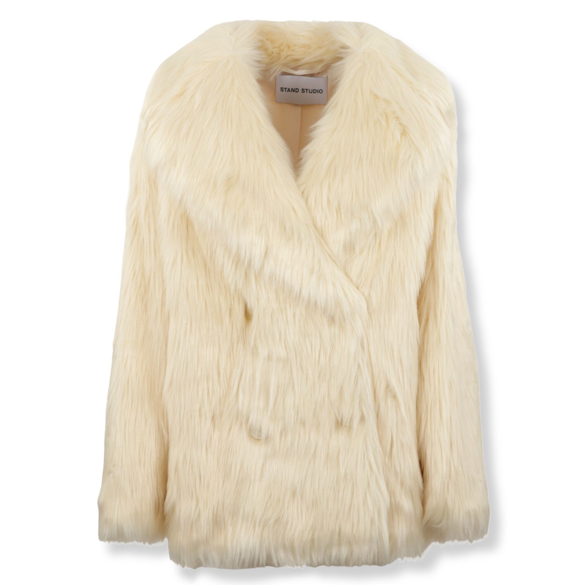 Katalina Coat Stand Studio. In ecopelliccia morbida, con collo a rever. Chiusura doppiopetto con bottoni frontali.