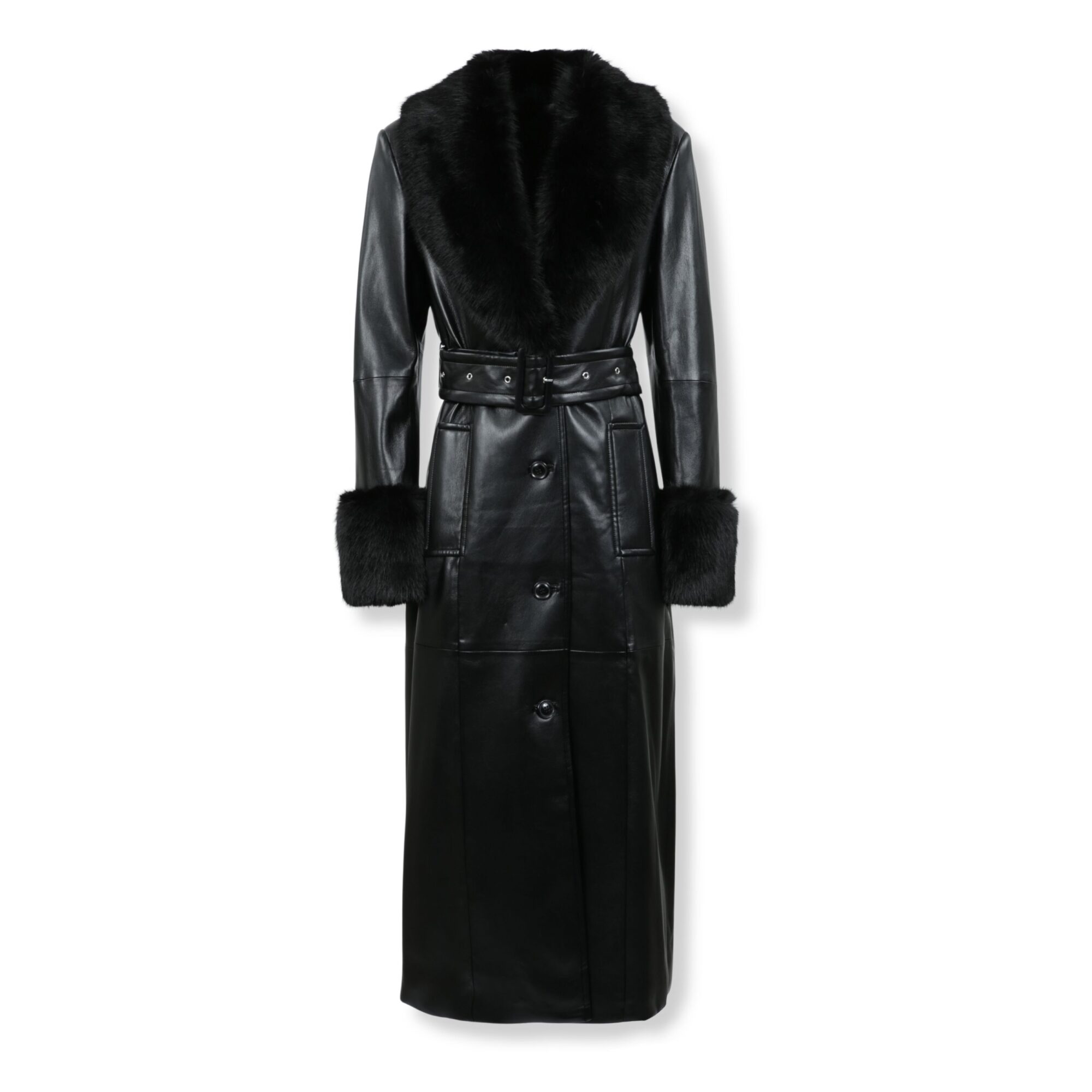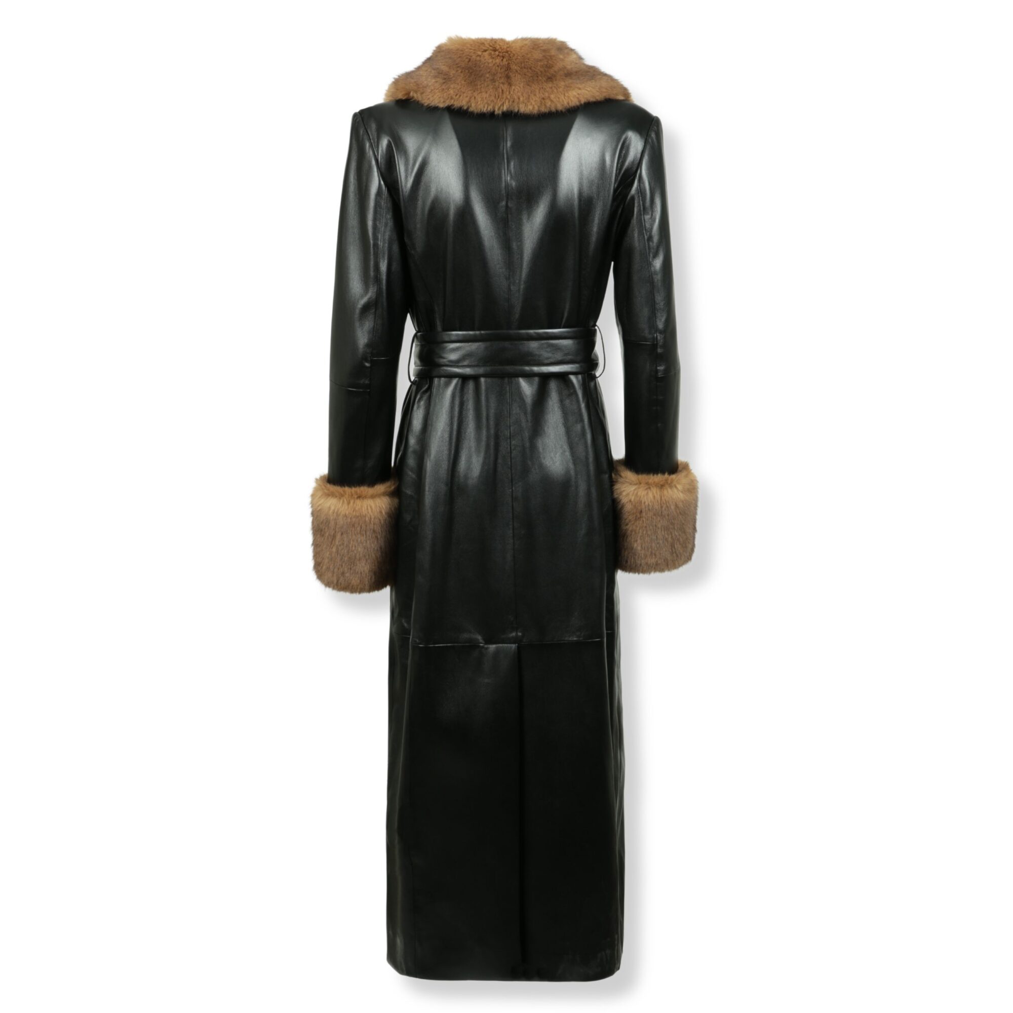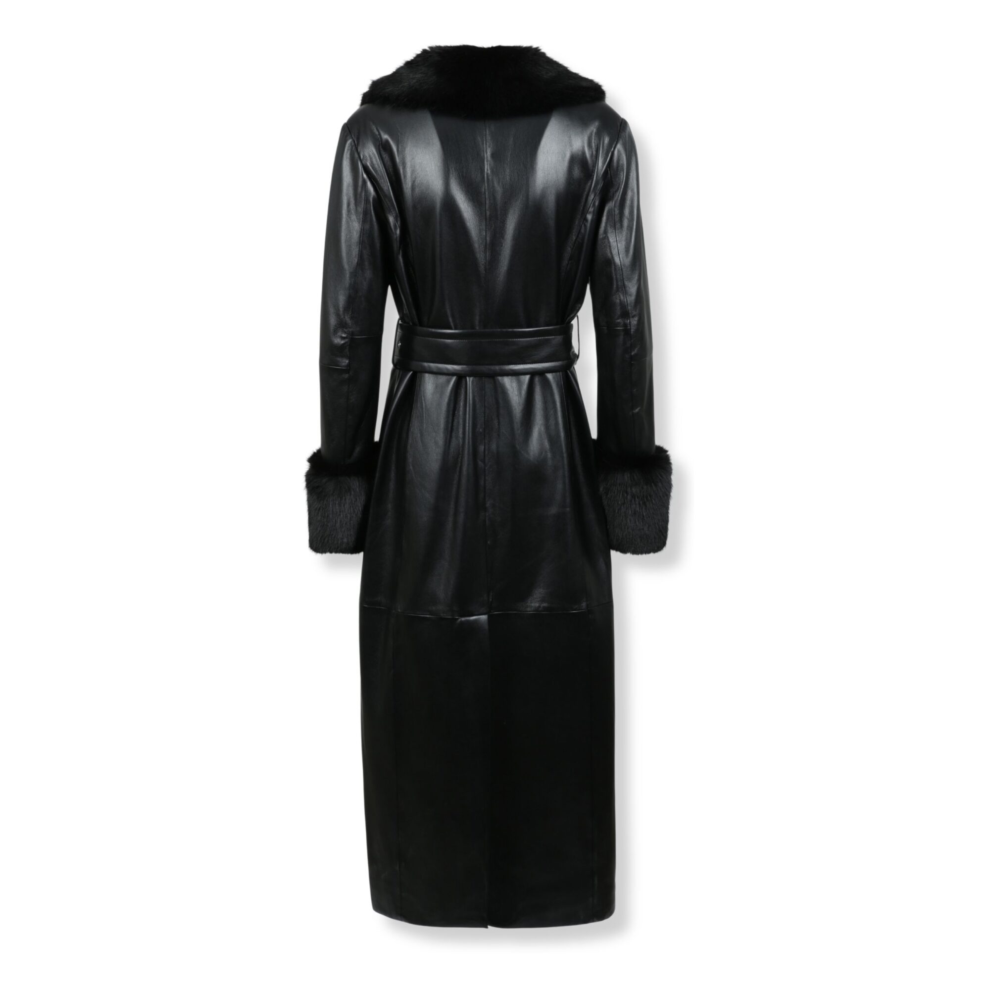 Estella Coat Stand Studio. Linea dritta e lunga, in pelle, con collo a scialle e polsini in pelliccia. Bottoni tono su tono e cintura abbinata, con tasche a filetto frontali.