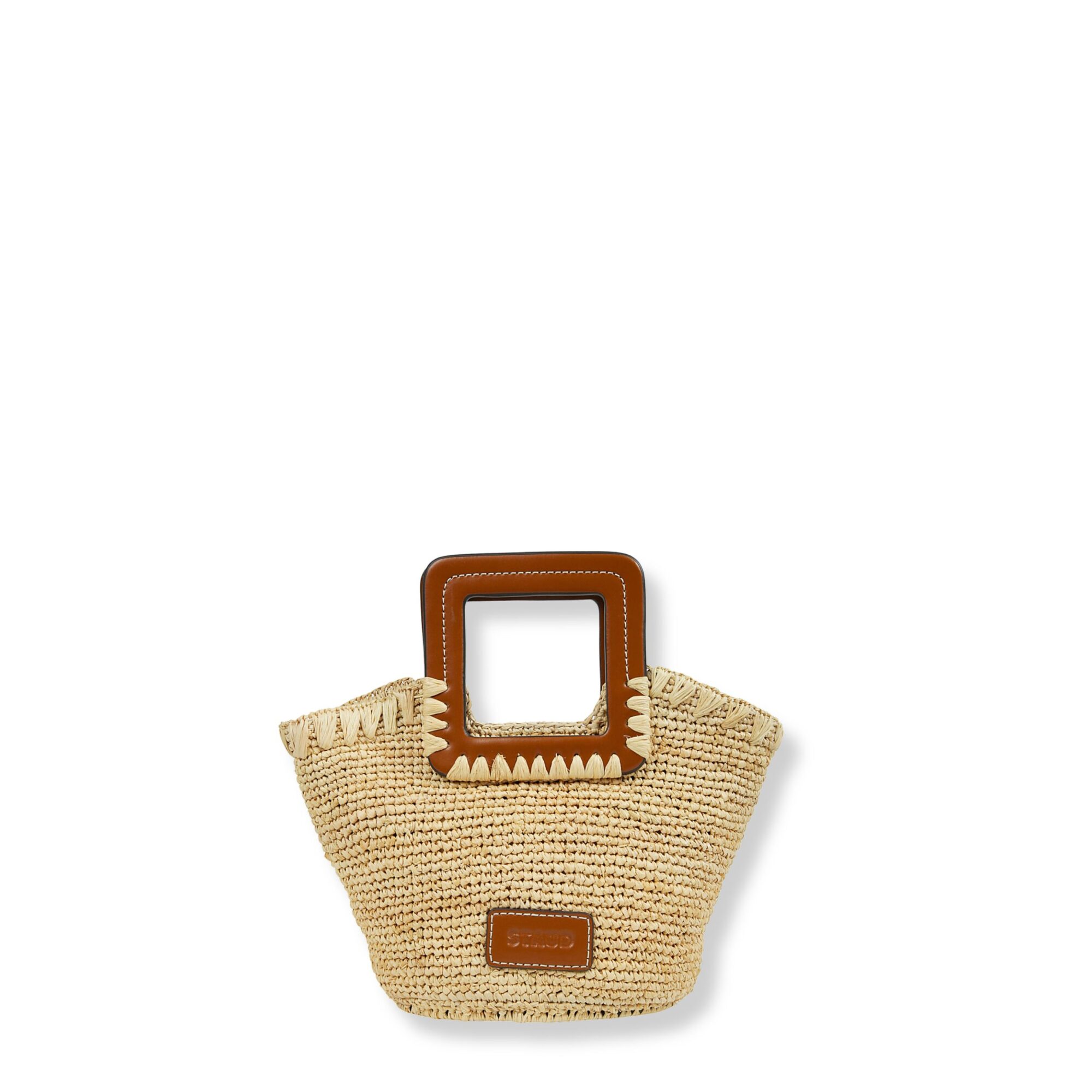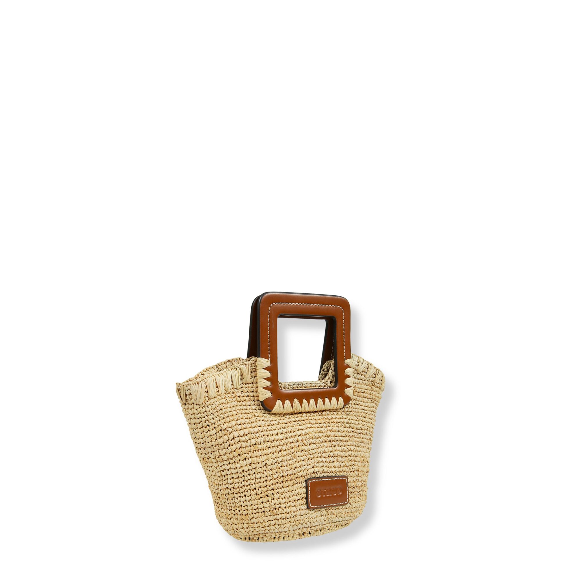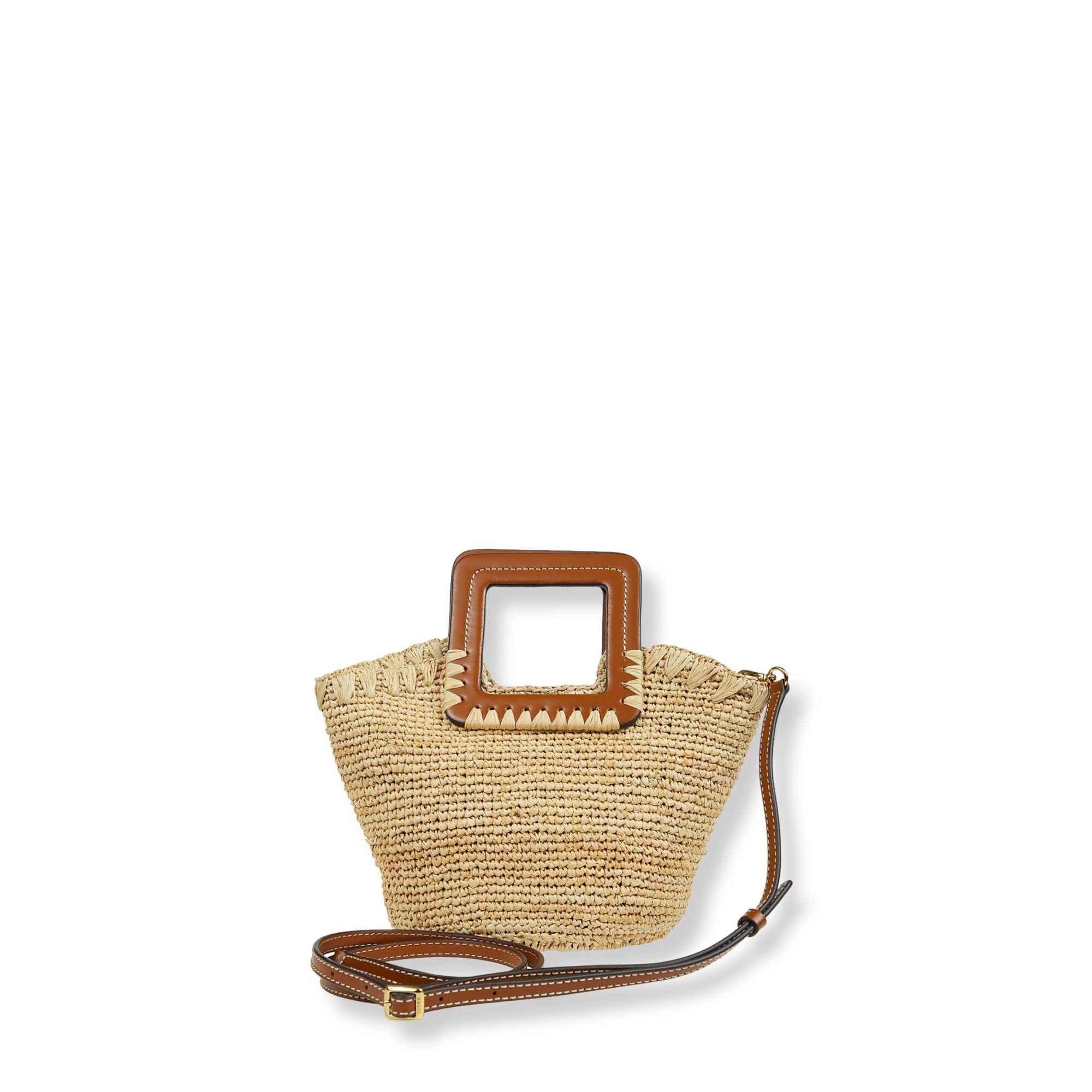 Shirley Raffia Mini Bucket Staud. Design in rafia intrecciata, manico quadrato in pelle, tracolla coordinata, chiusura magnetica.