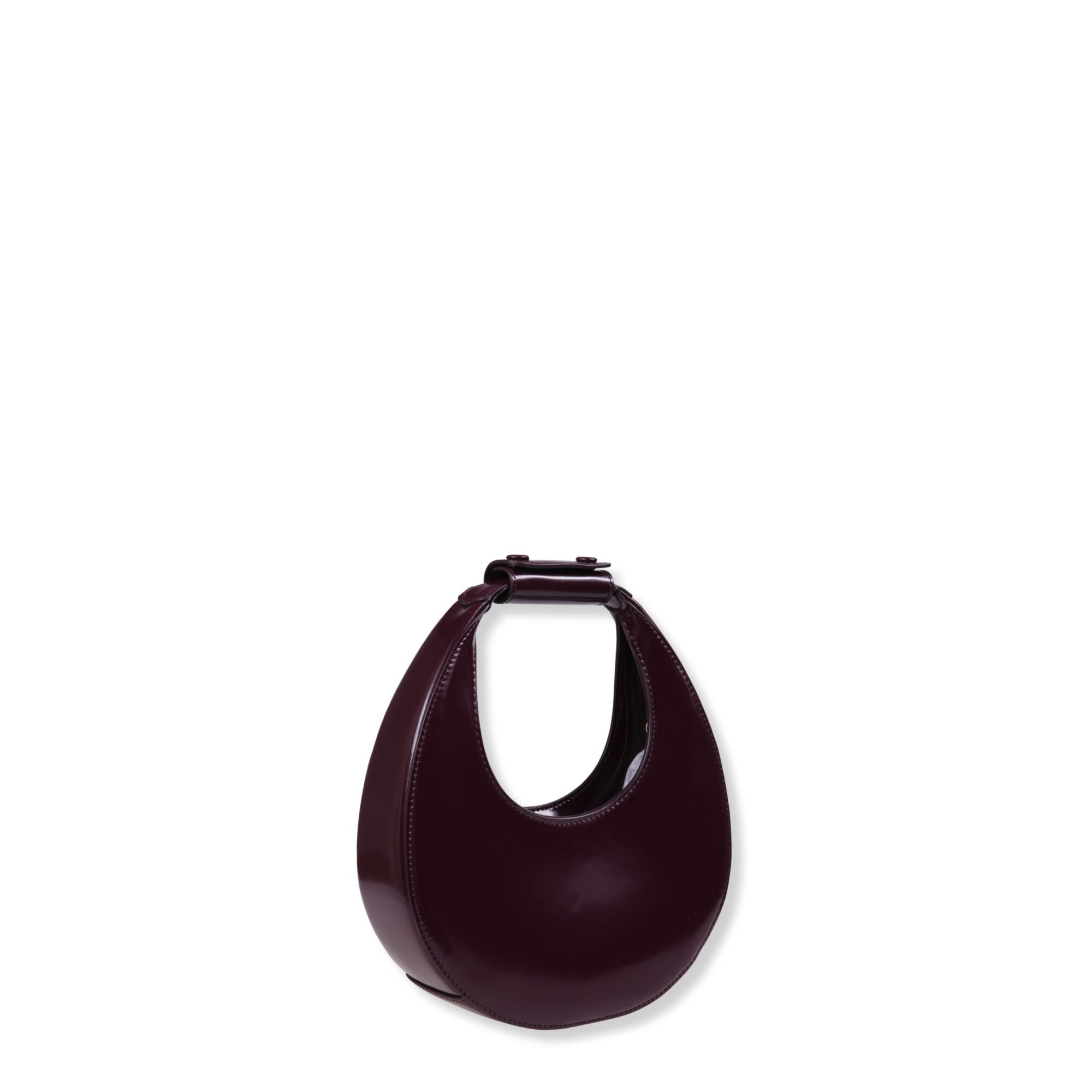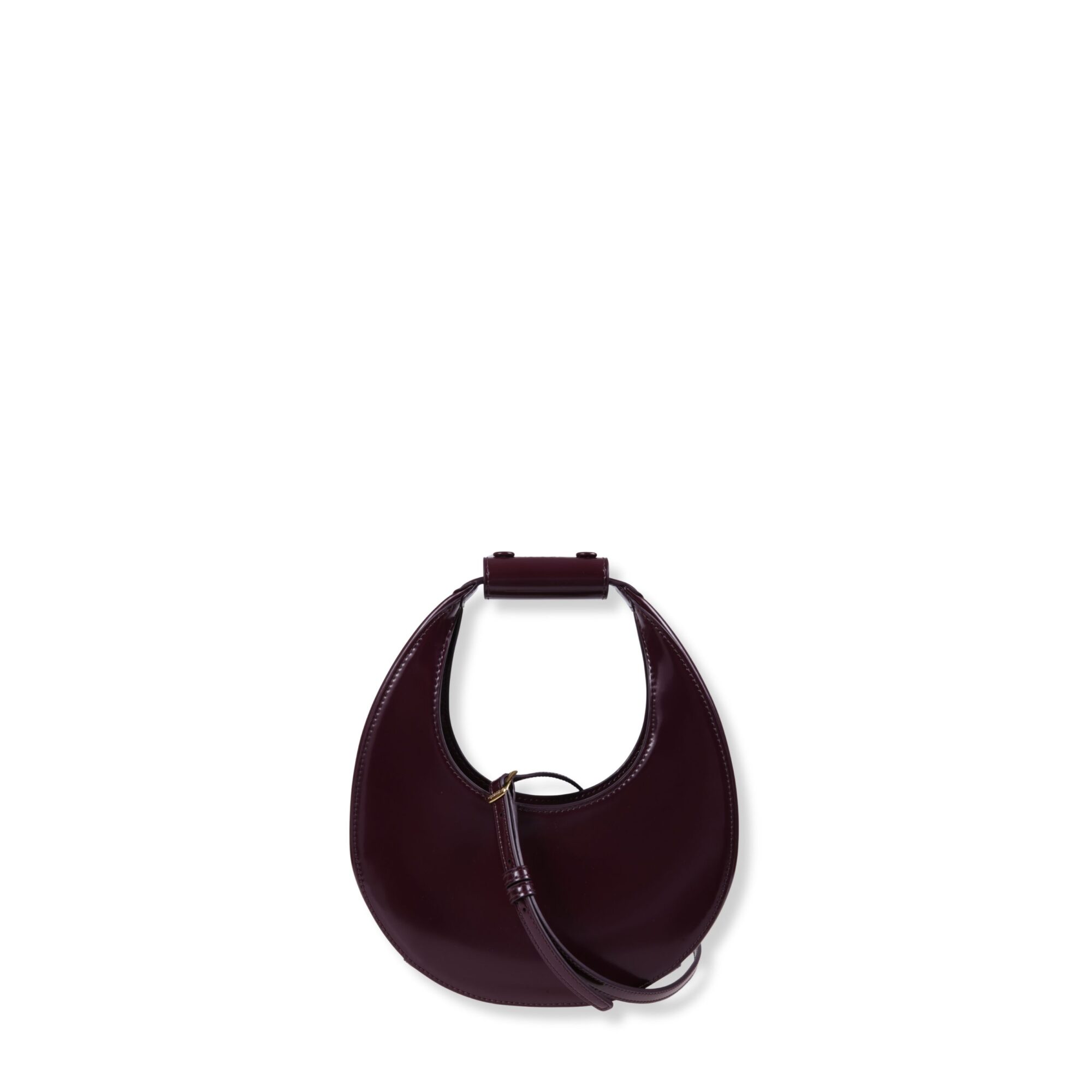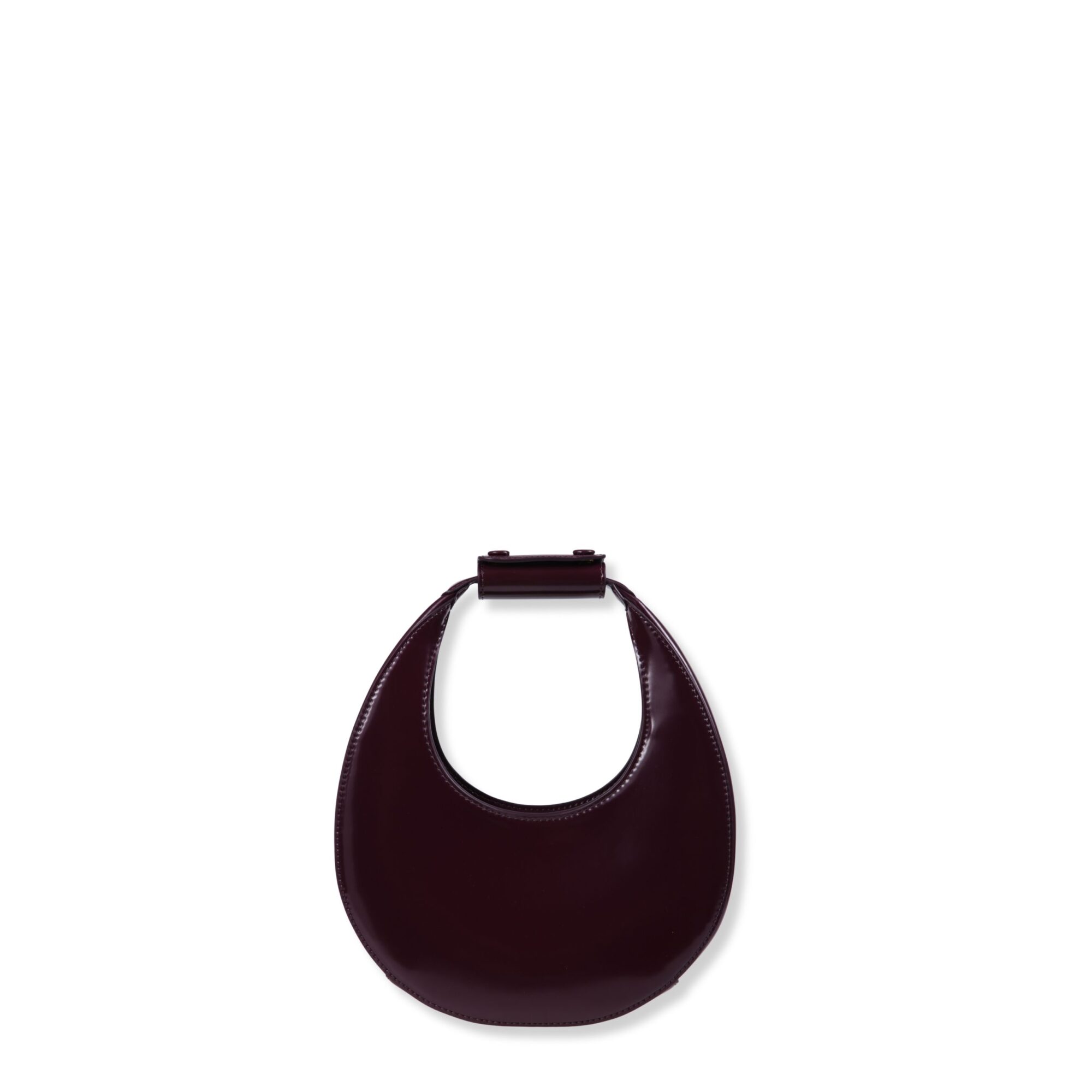 Mini Moon Bag Staud. Design in pelle spazzolata, con impunture a vista sui bordi. Manico curvo con dettaglio rimovibile e chiusura magnetica superiore.