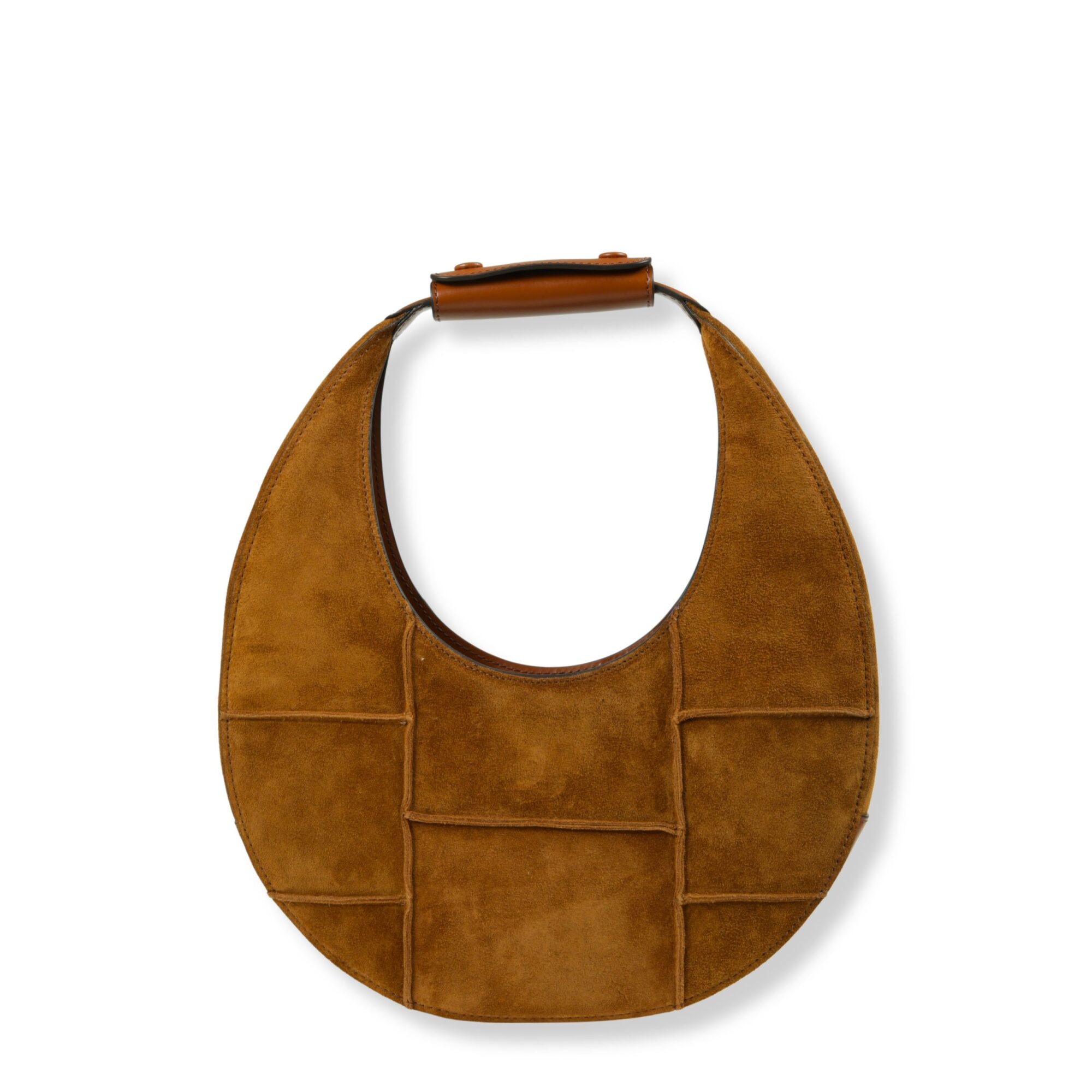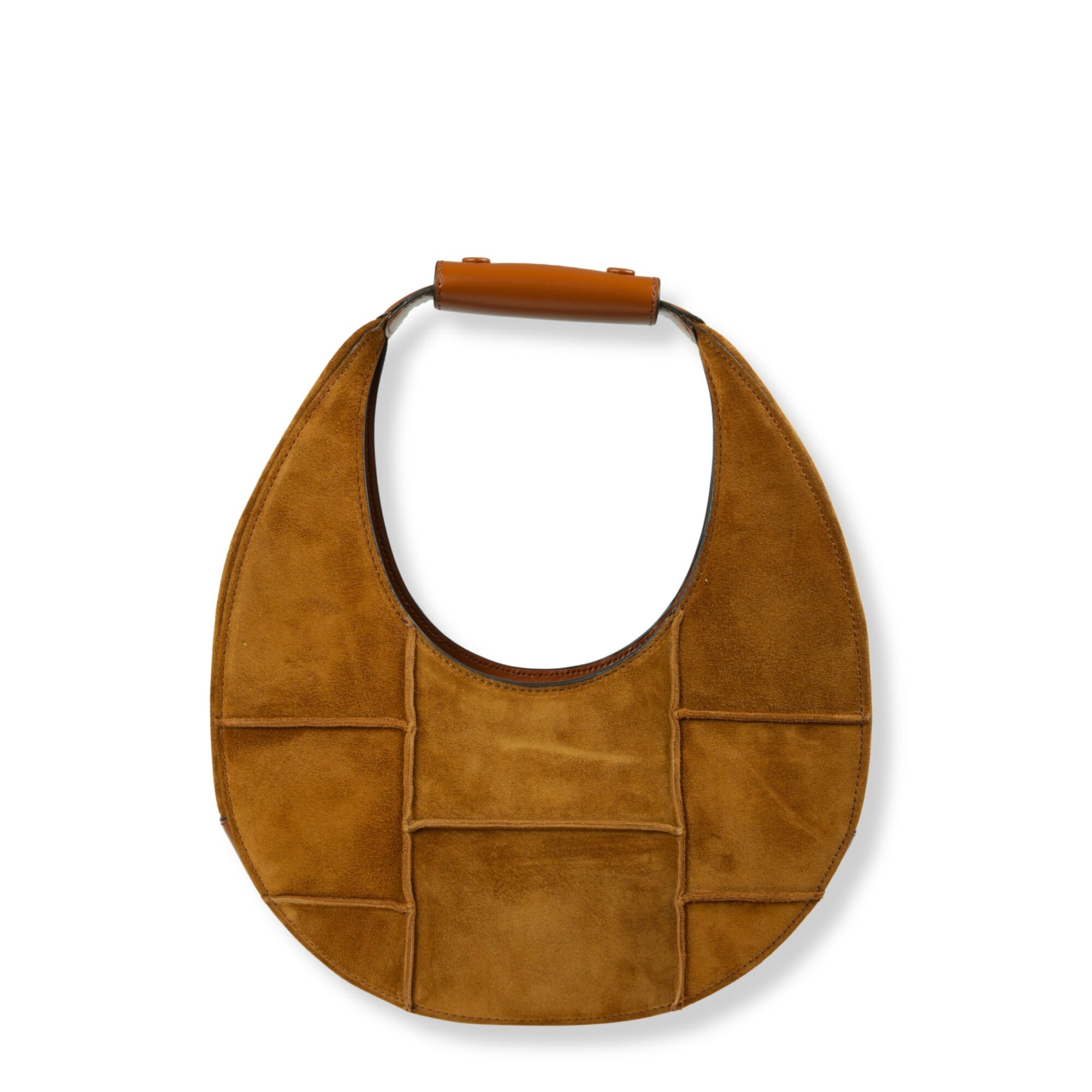 Moon Bag Staud. Design in pelle scamosciata con patchwork su tutto il corpo. Manico curvo con dettaglio rimovibile e chiusura magnetica a scatto.