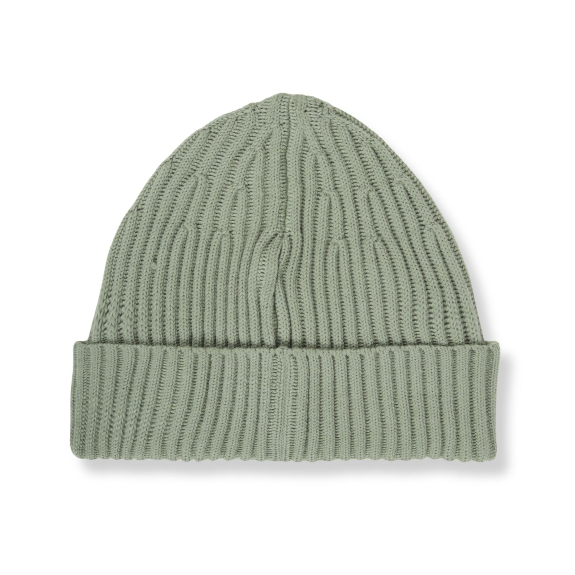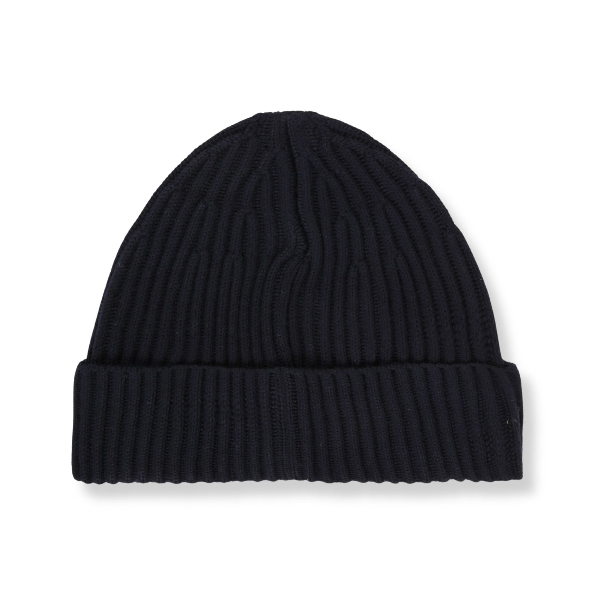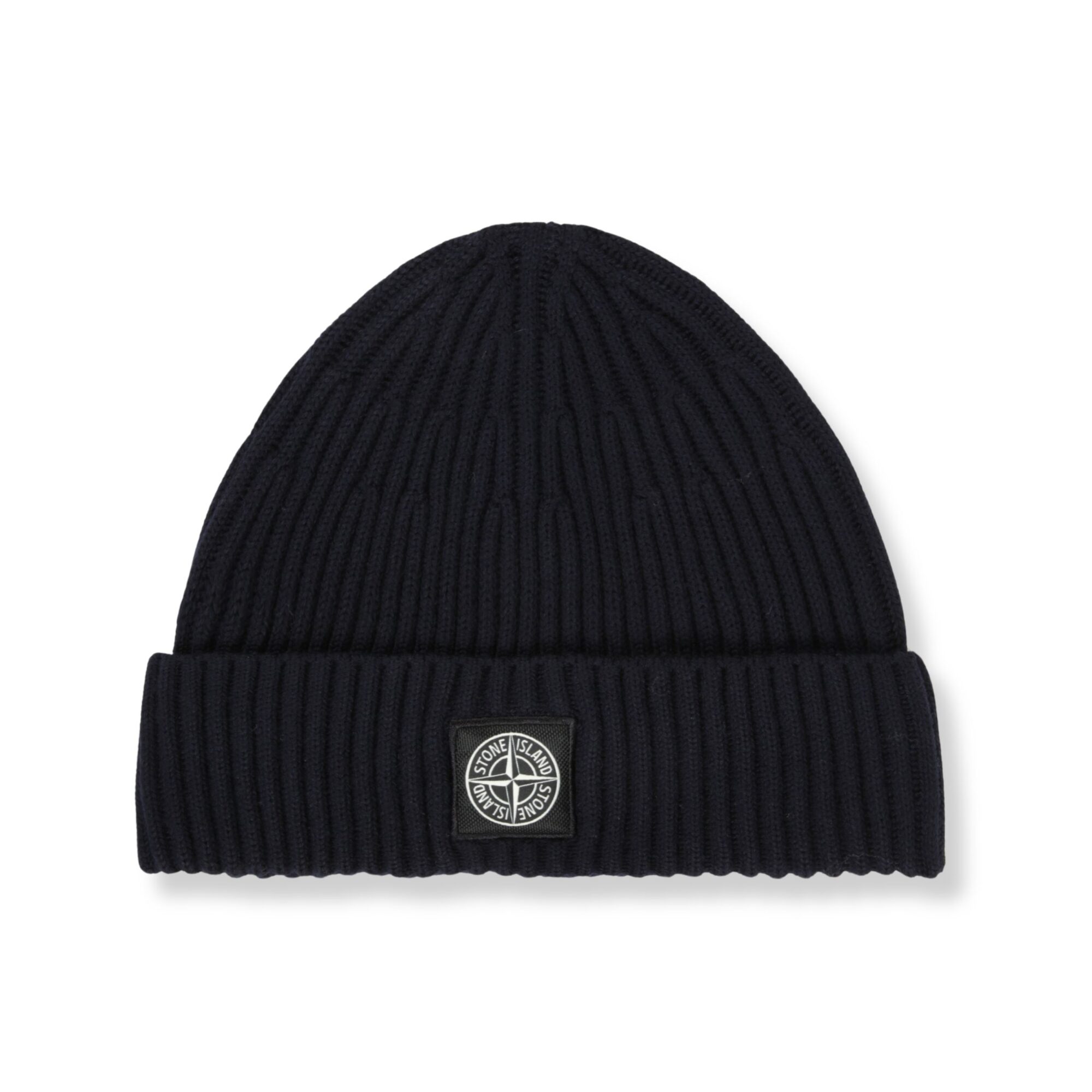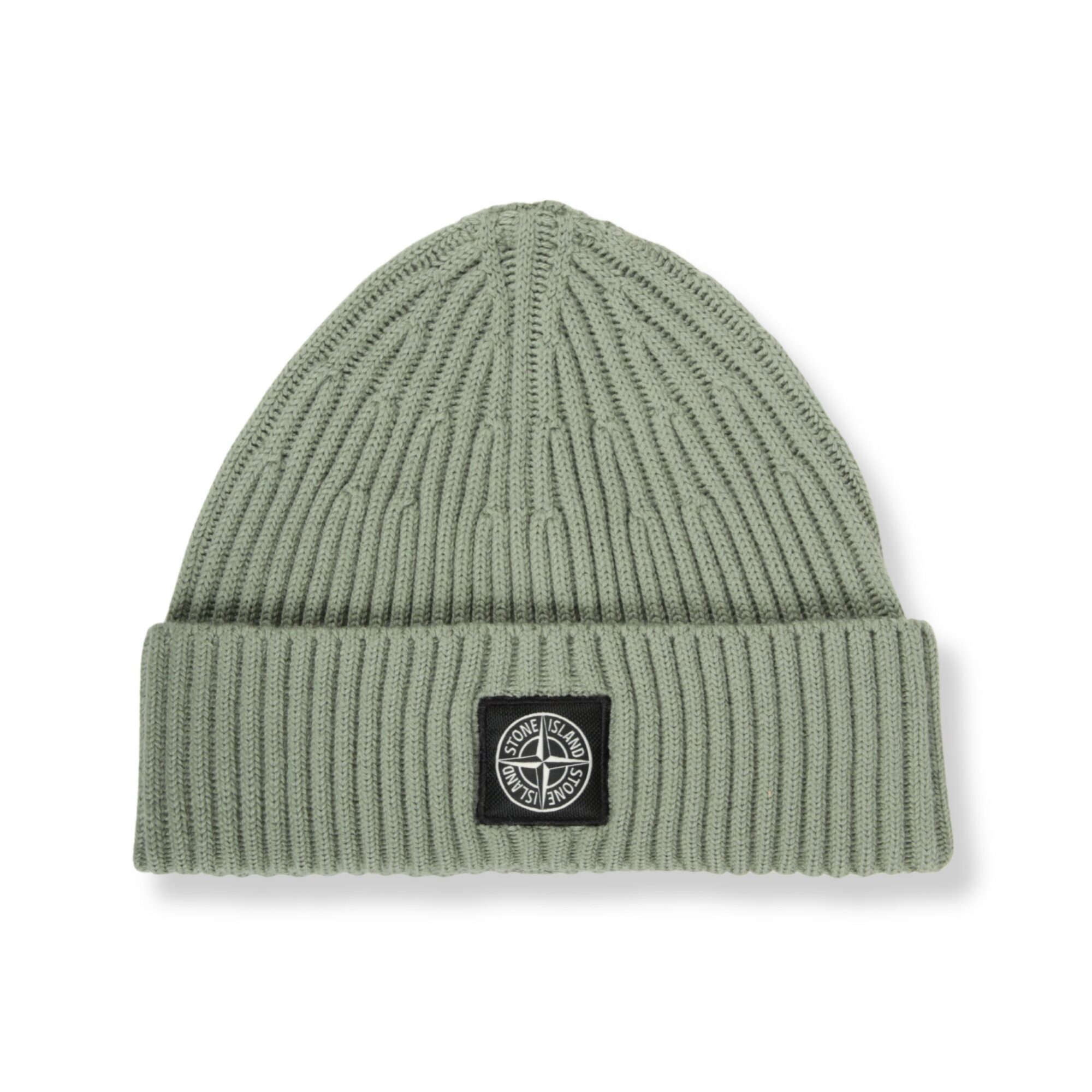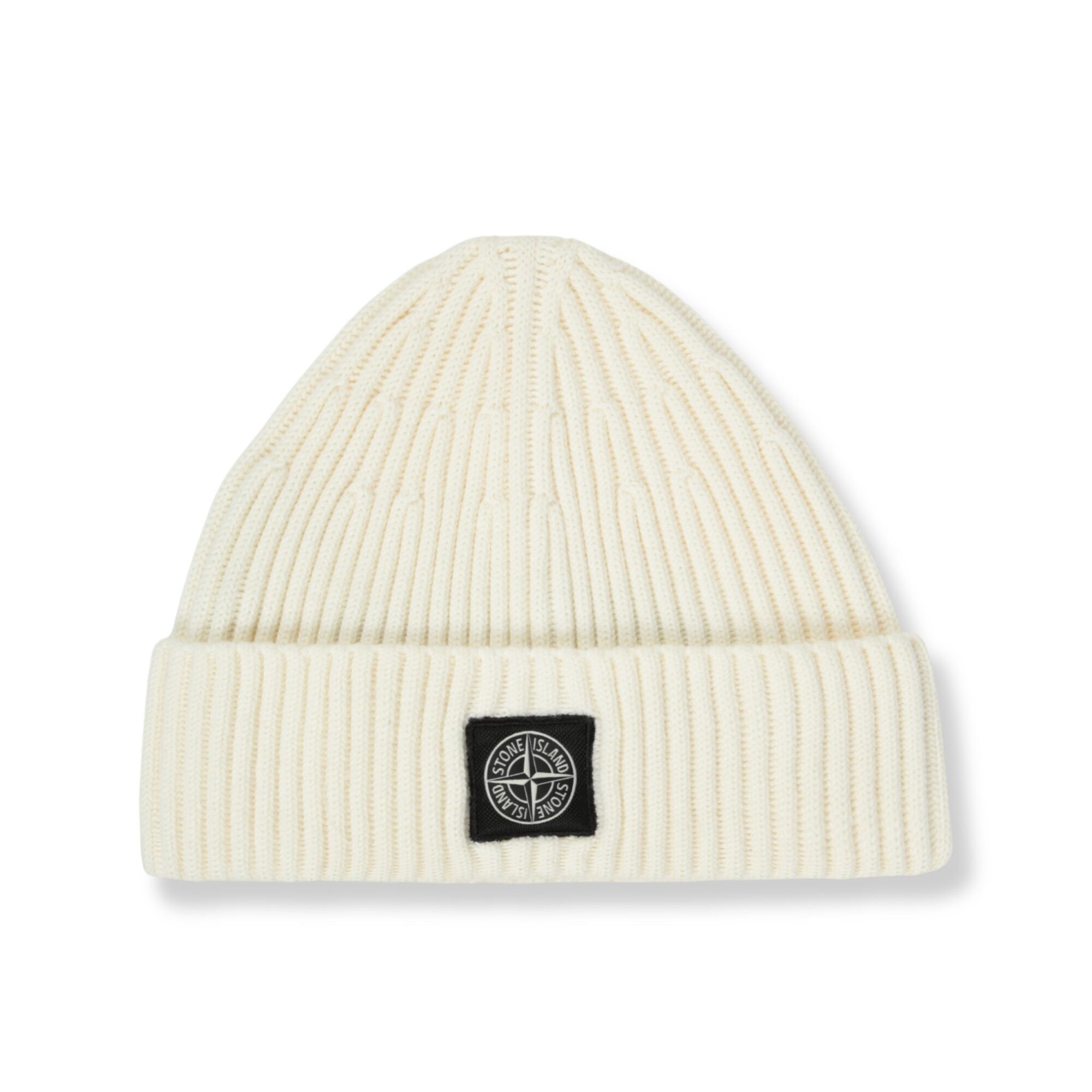 Cappelloin lana Stone Island. Desing con lavorazione a costine, risvolto frontale con logo del brand.