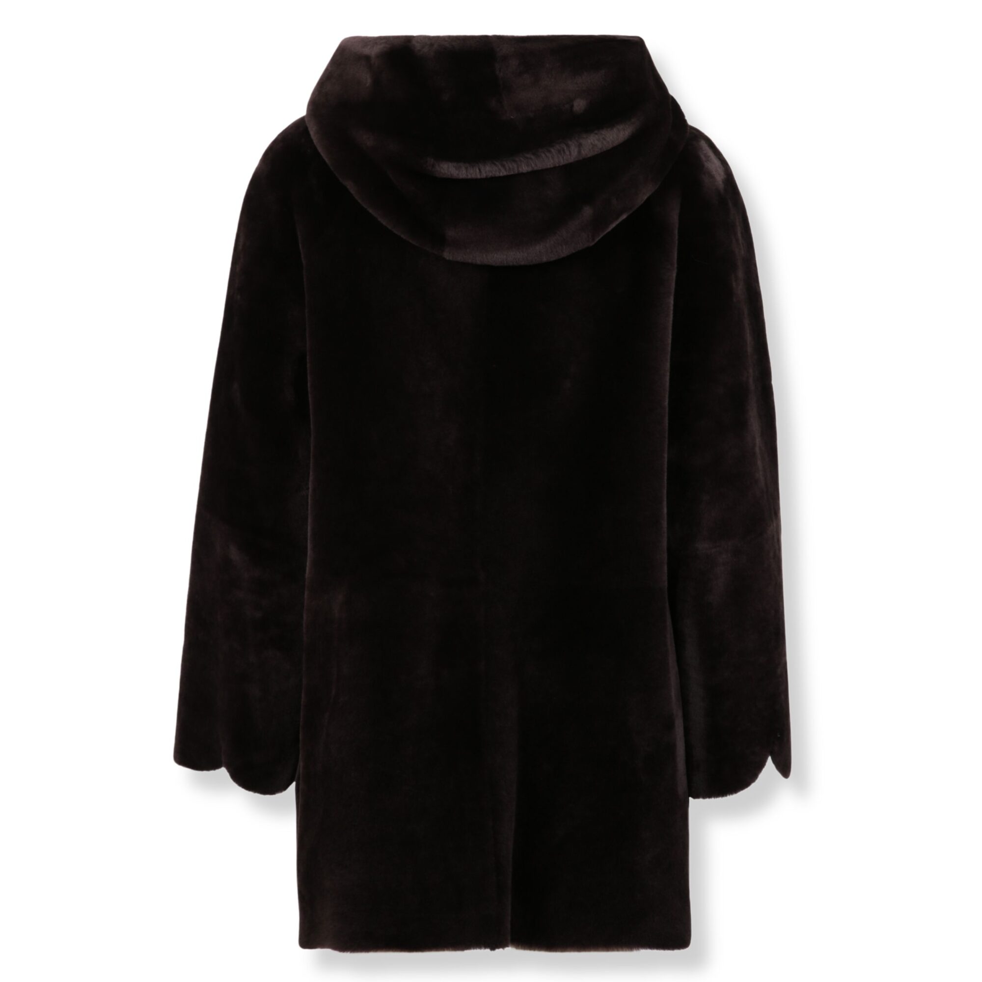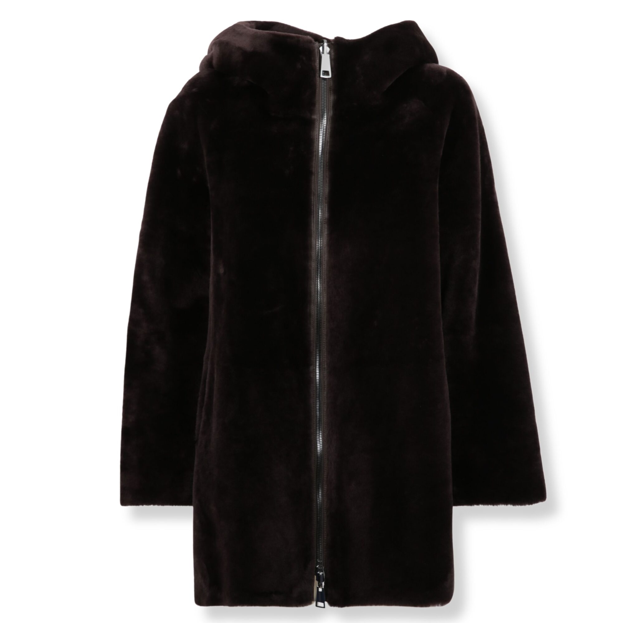 Cappotto Suprema, modello in montone con zip e cappuccio. Linea dritta, vestibilità rilassata.