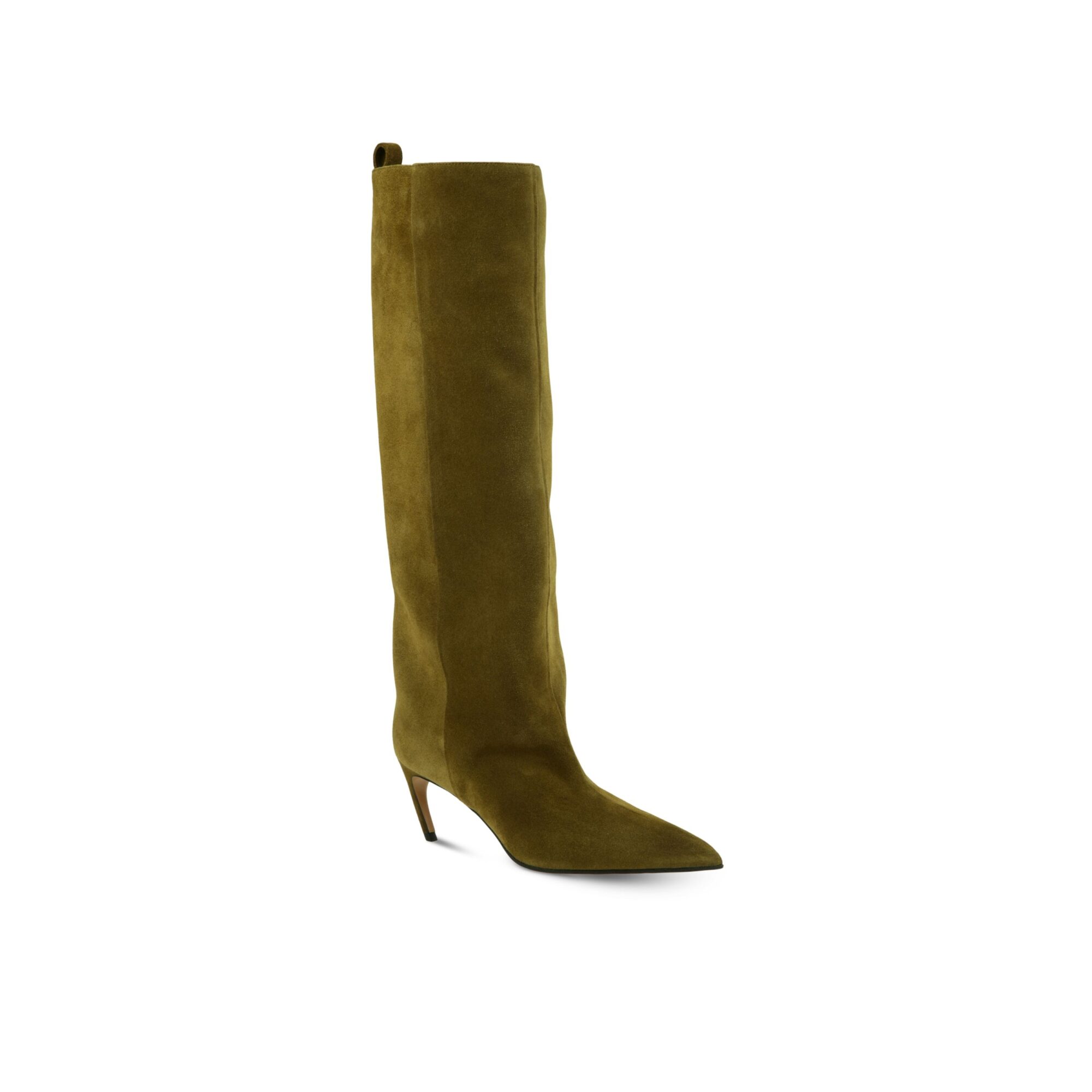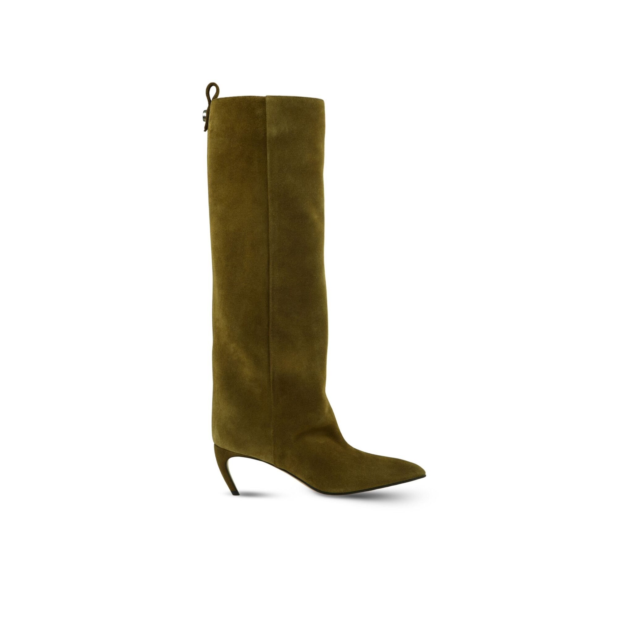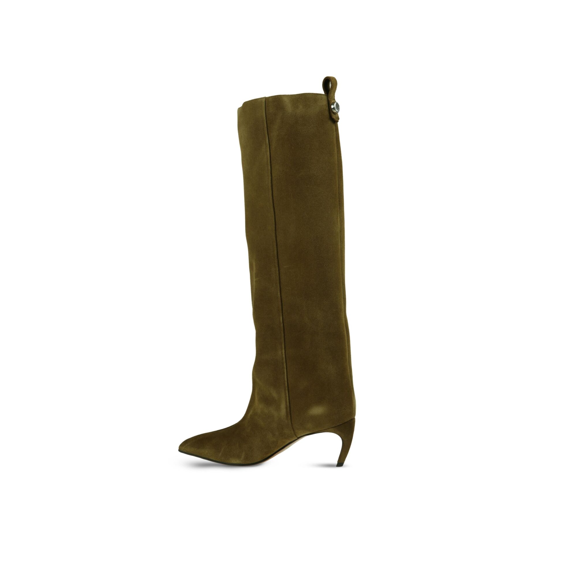 Stivale Lea The Attico. In suede, gambale ampio e dritto, punta affusolata ed iconico tacco ricurvo.