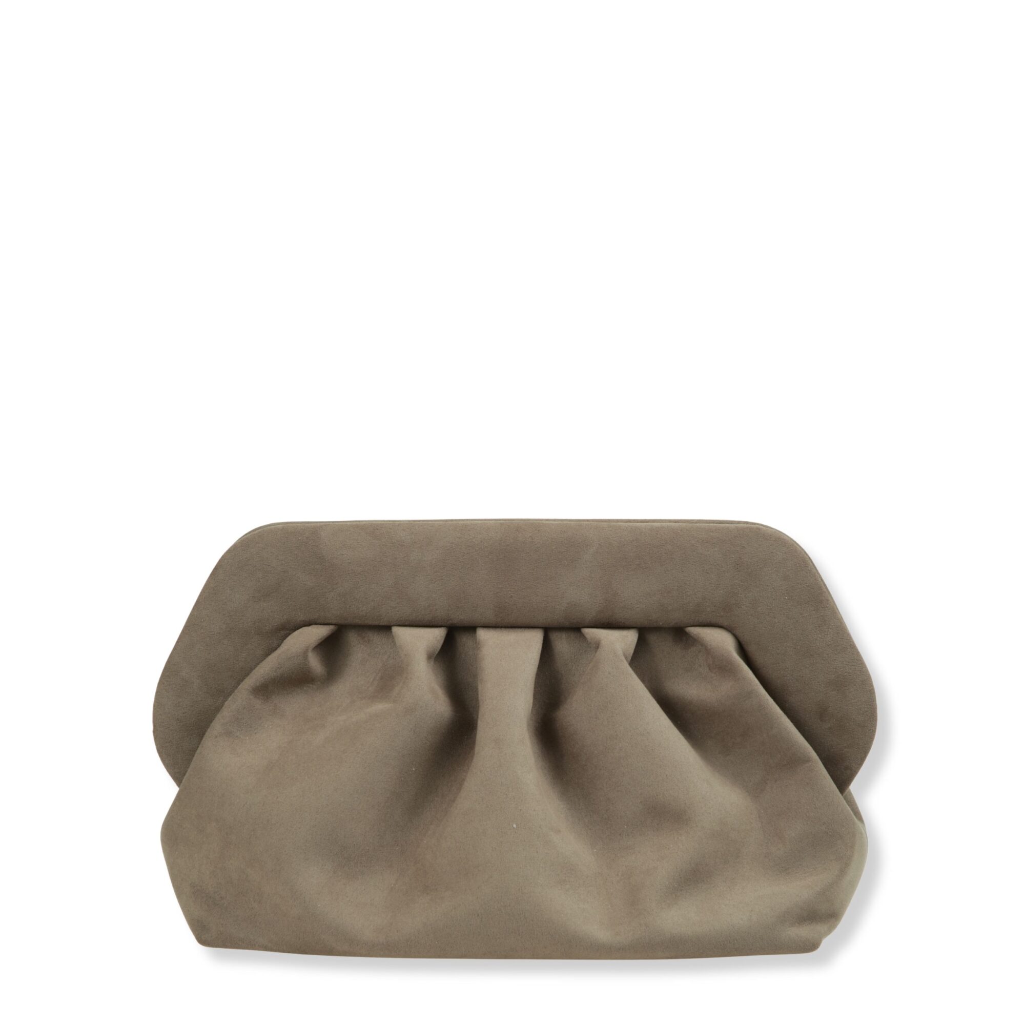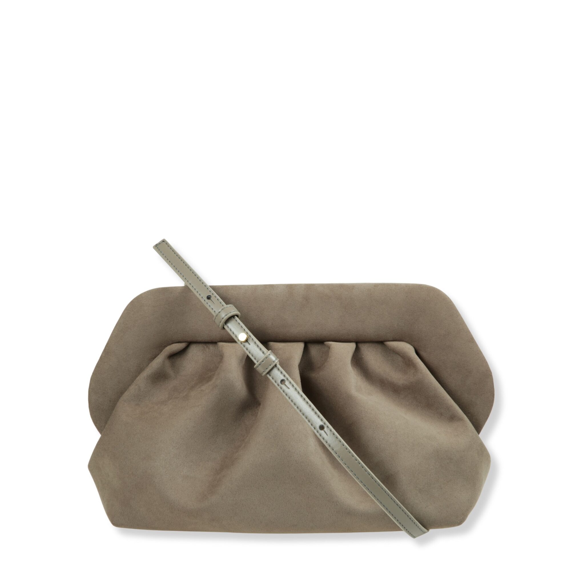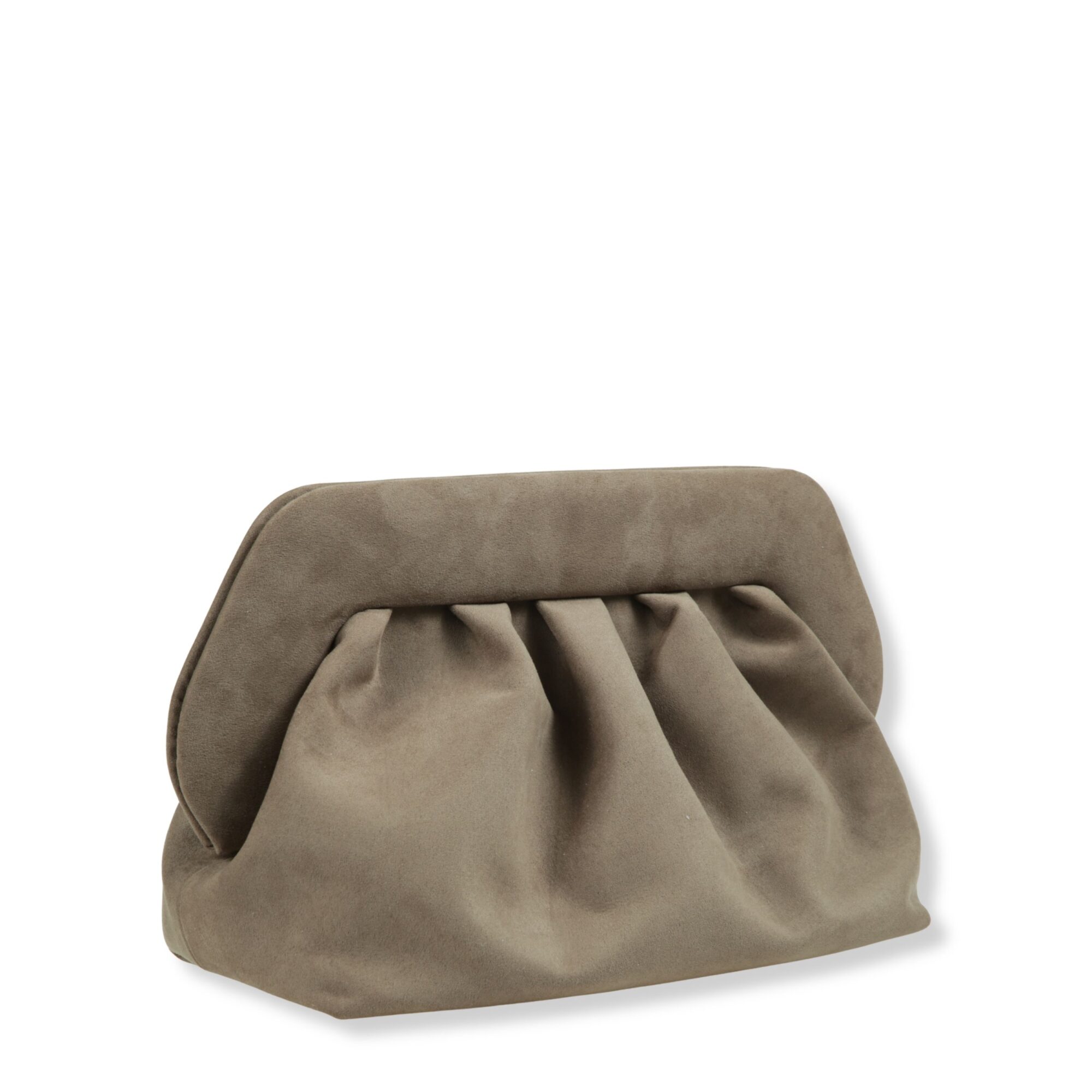 Bios Suede Finish Themoirè. Design iconico con finitura in suede, corpo drappeggiato e chiusura superiore magnetica. Tracolla rimovibile e regolabile.