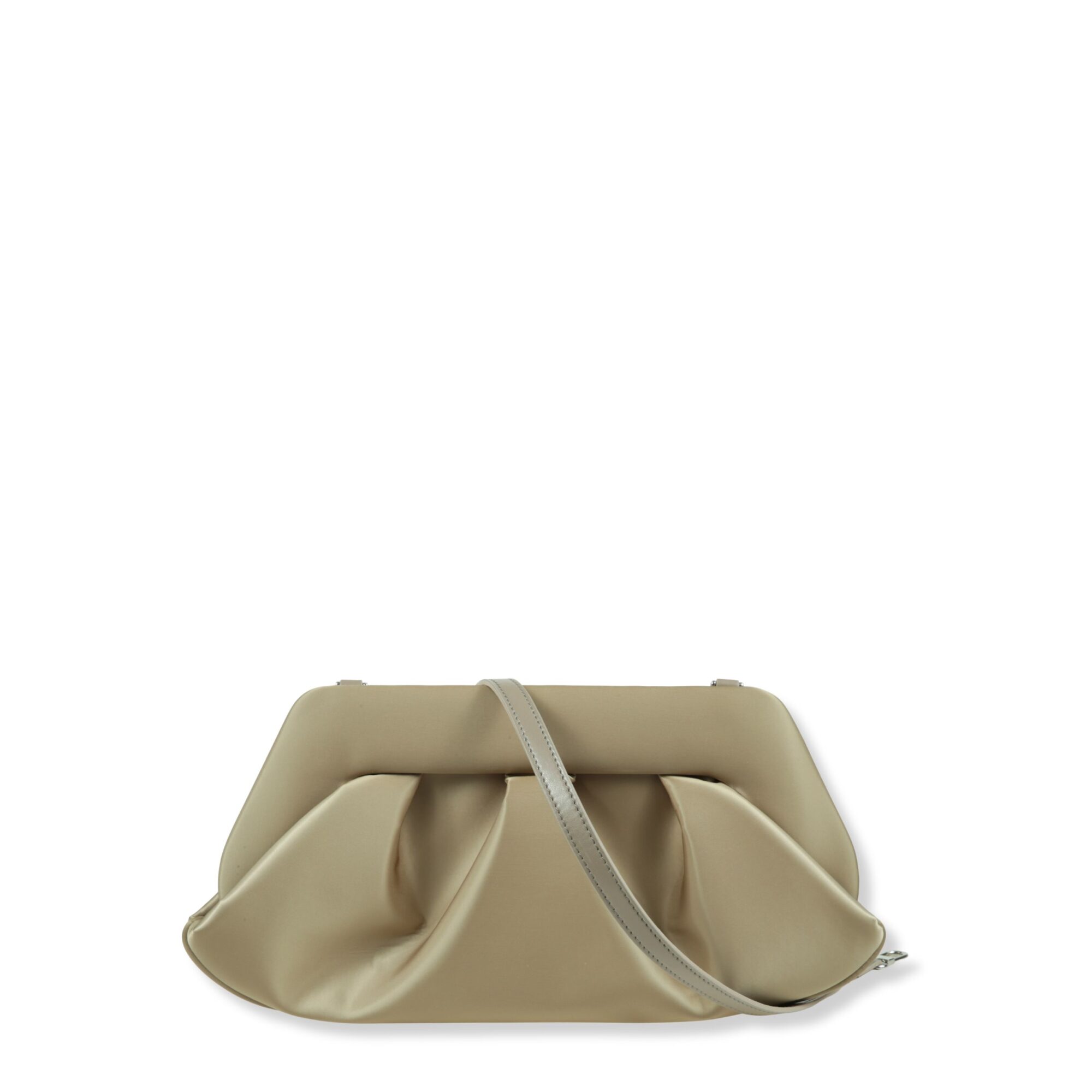 Emera Themoirè. Design iconico in raso, con corpo drappeggiato e chiusura superiore magnetica. Tracolla rimovibile e regolabile.