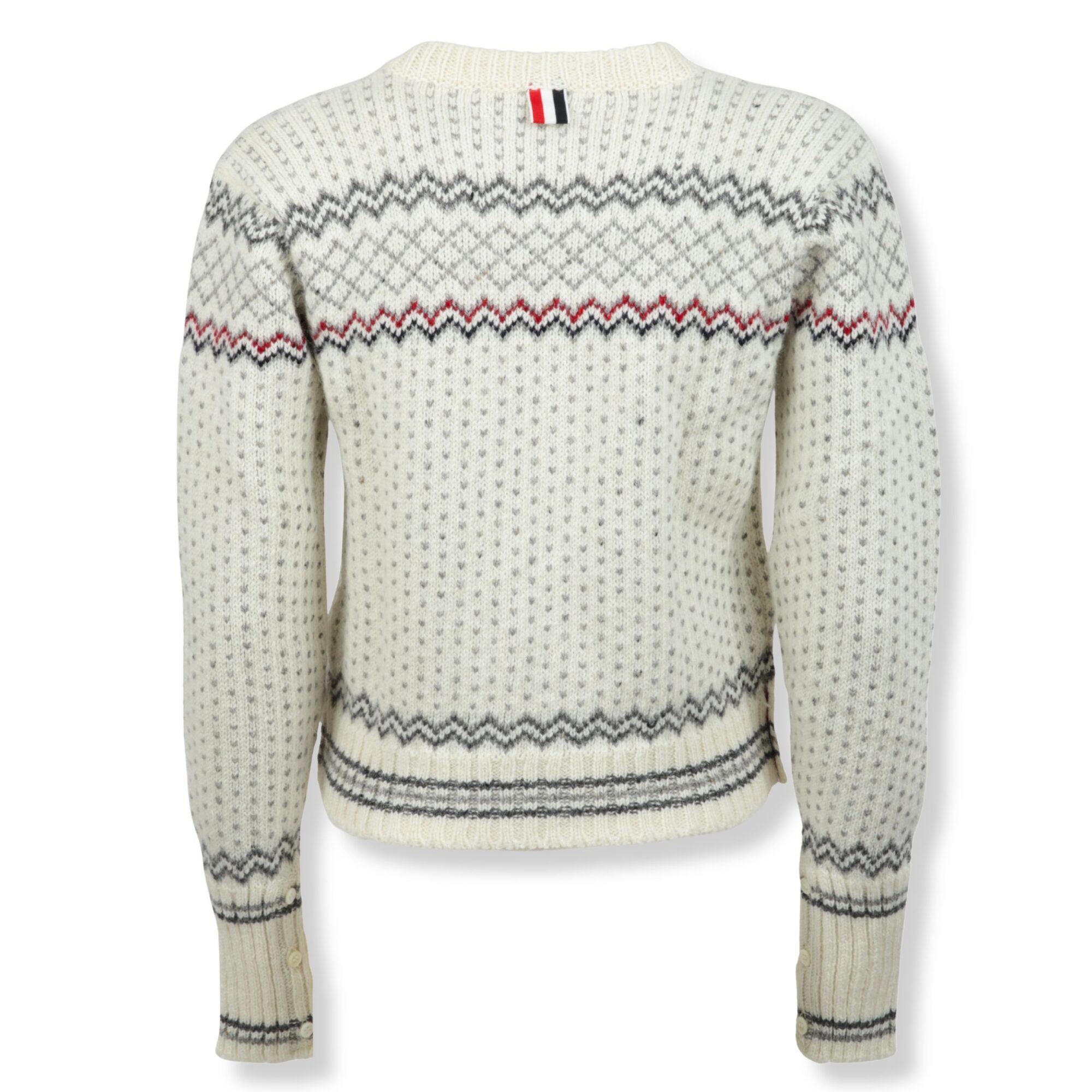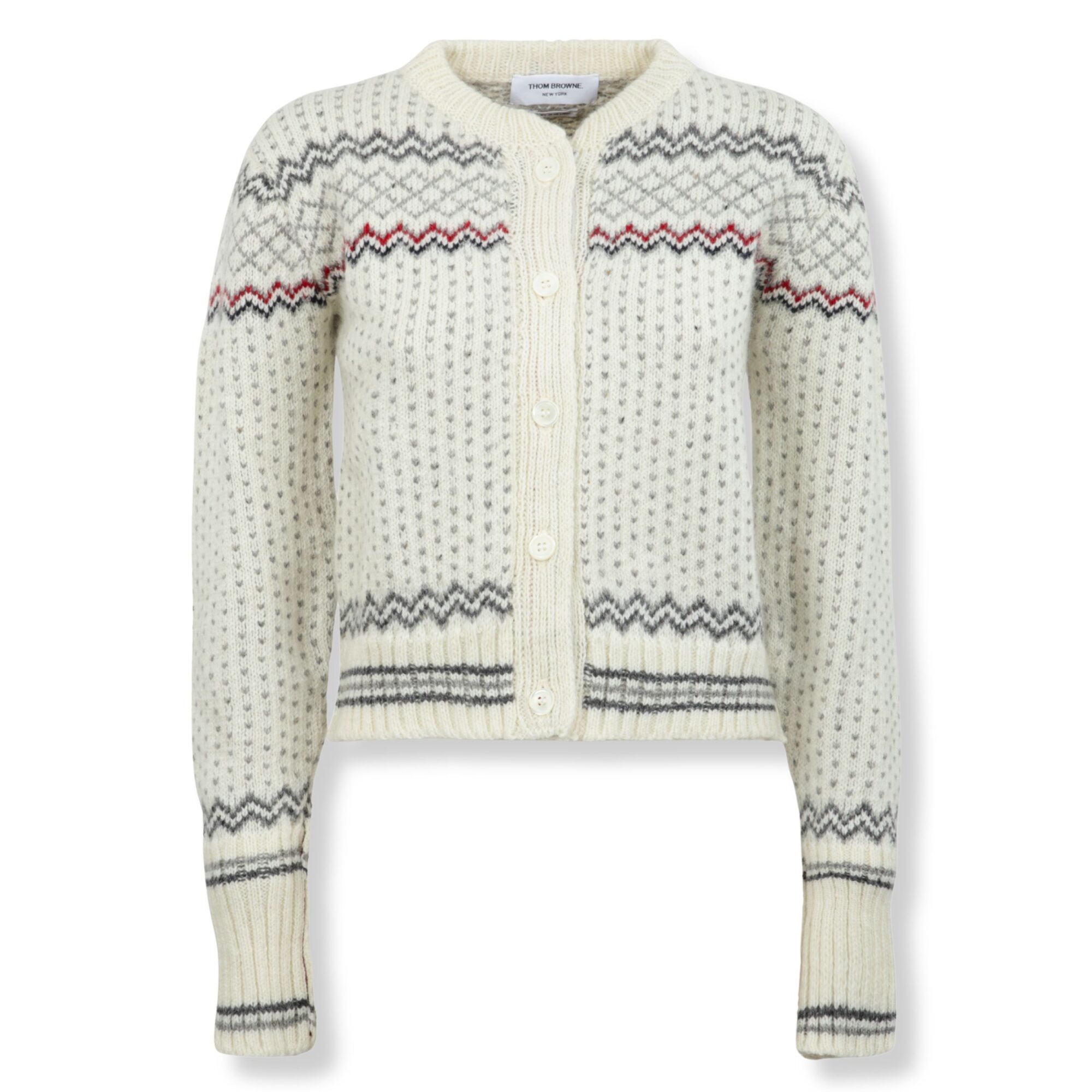 Fairisle Jacquard Donegal Cropped Cardigan Thom Browne. Design in tradizionale lavorazione a maglia Fair Isle e chiusura frontale con bottoni. Passante in gros-grain tricolore iconico del brand sul retro del collo.
