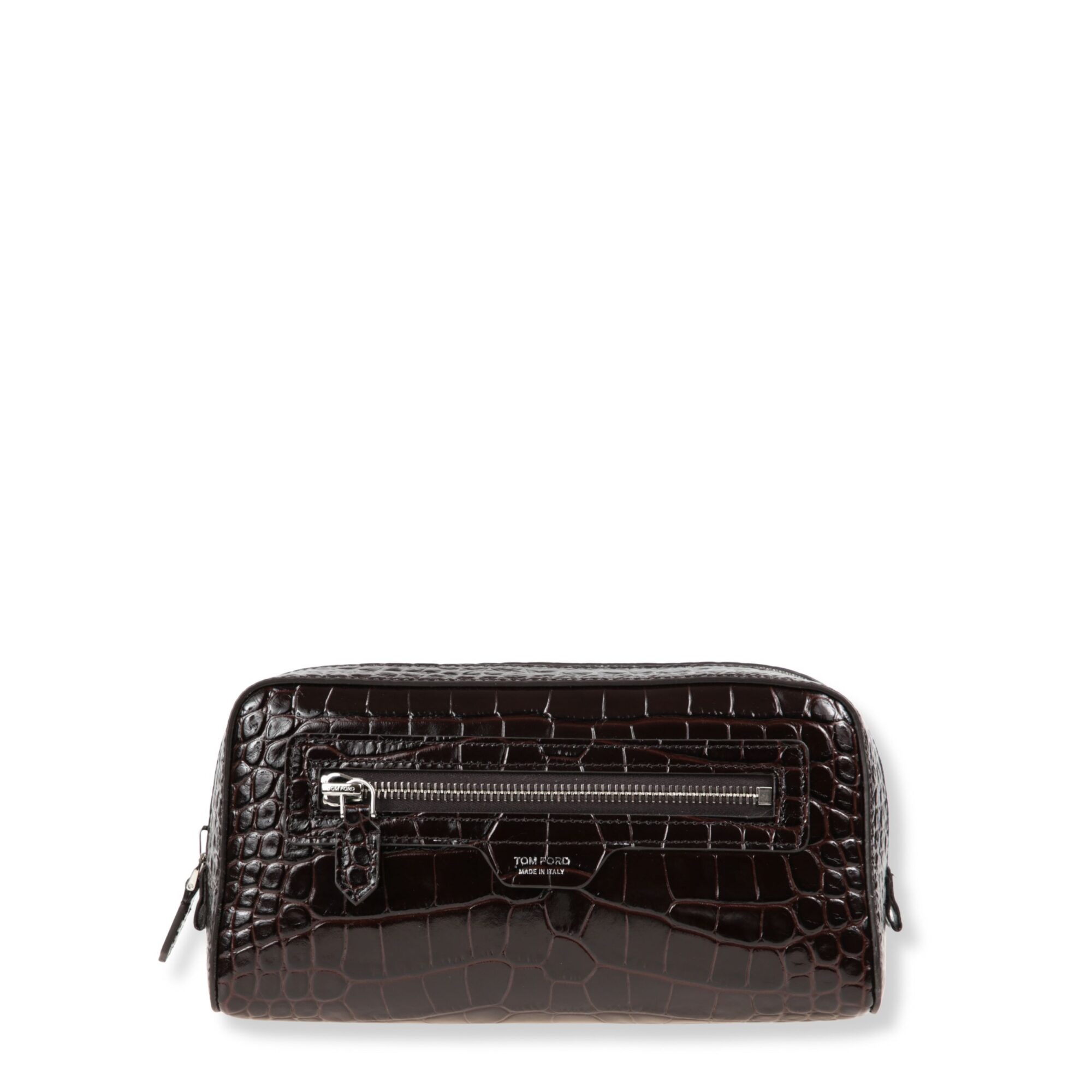 Pochette Tom Ford, in pelle effetto coccodrillo. Chiusura a zip superiore e tasca esterna con cerniera. Logo del brand sul davanti.
