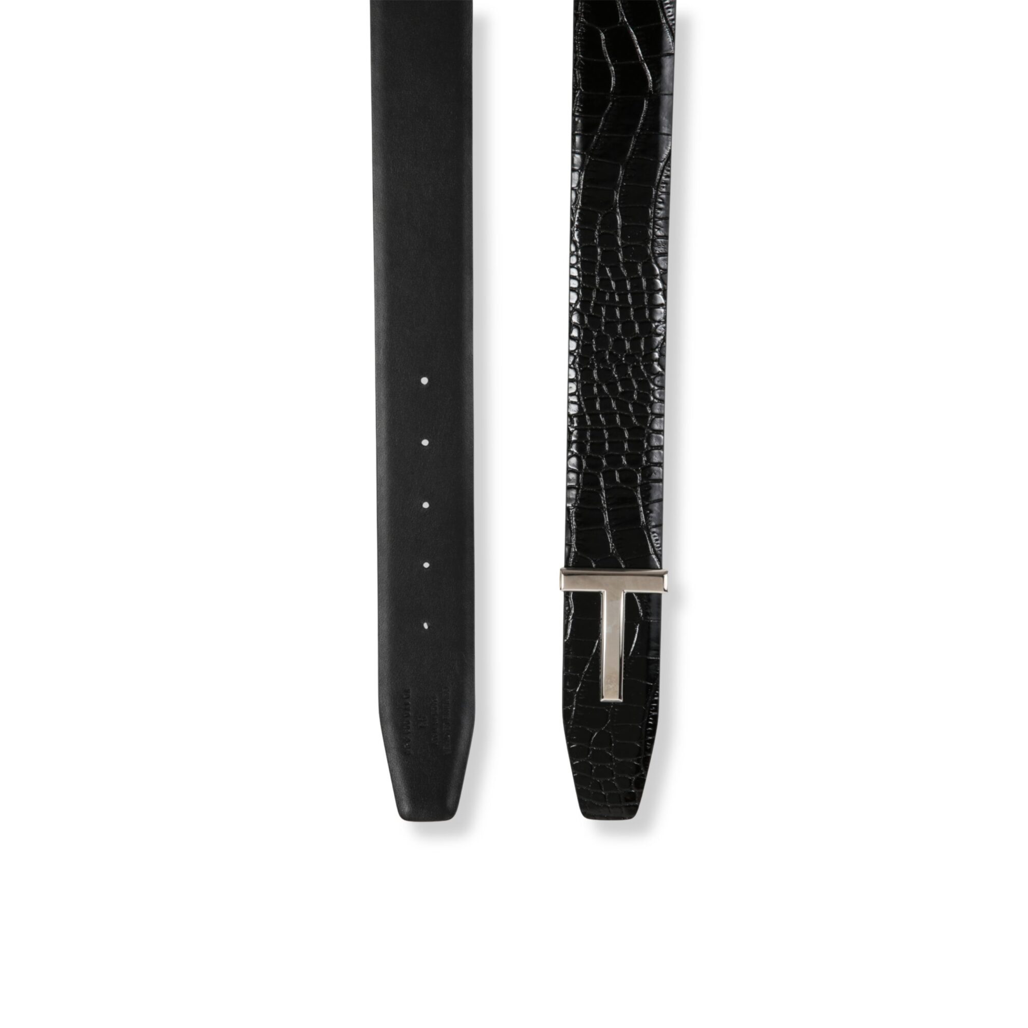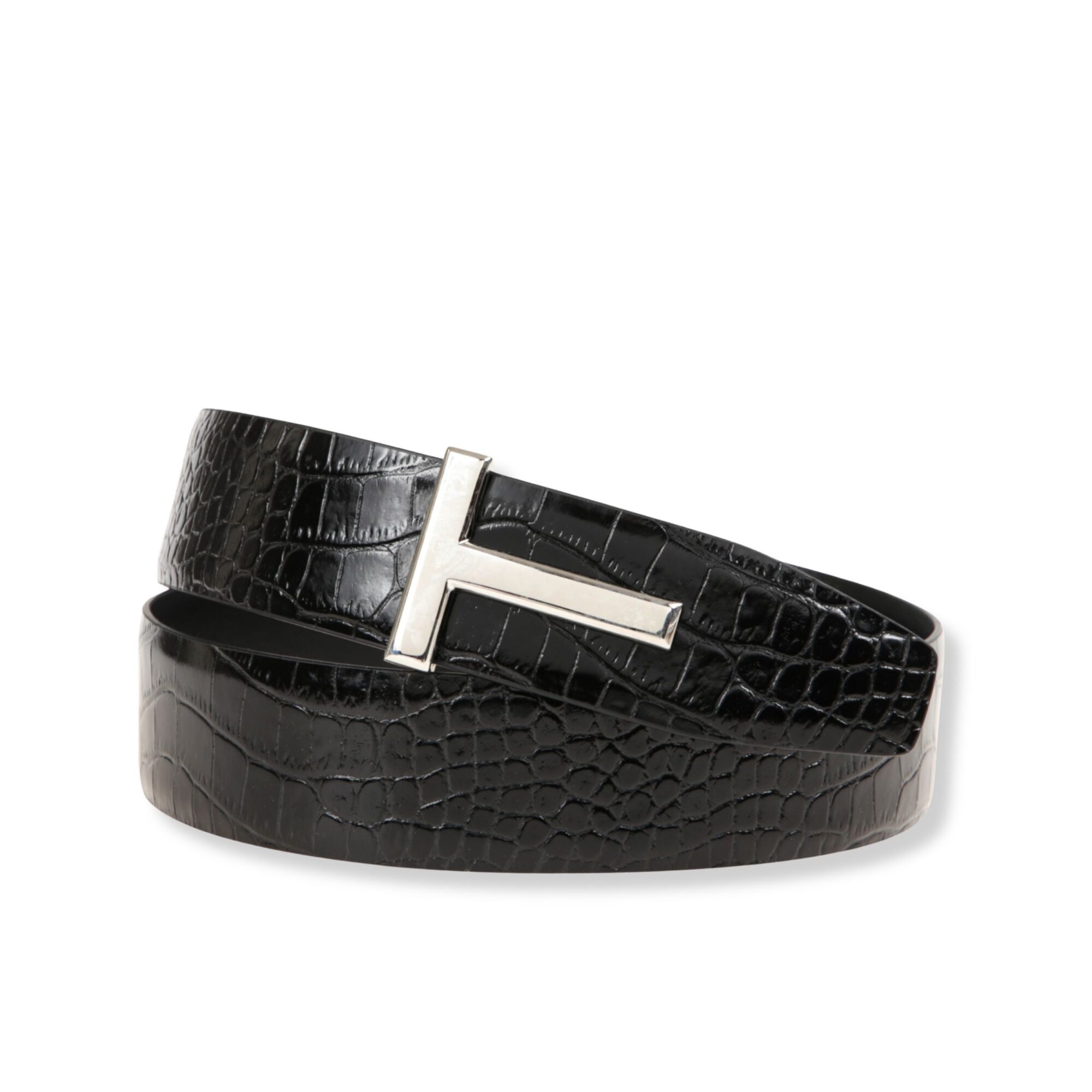 T Icon Belt Tom Ford. Design in pelle e fibbia personalizzata con logo del brand.