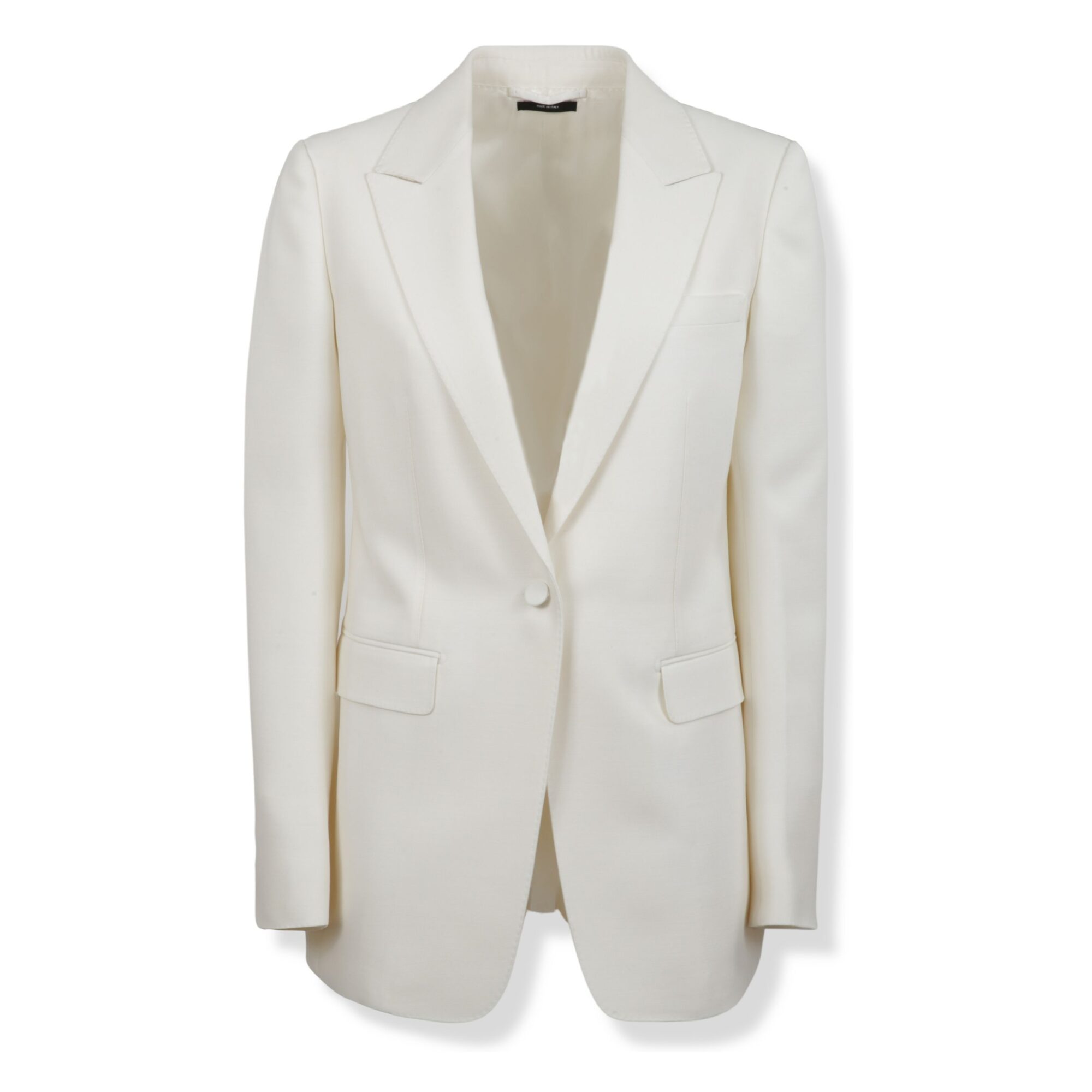 Peak Lapel Jacket Tom Ford. In lana e seta radzmir, chiusura monopetto con bottone, collo rever e due tasche con patta sul davanti.