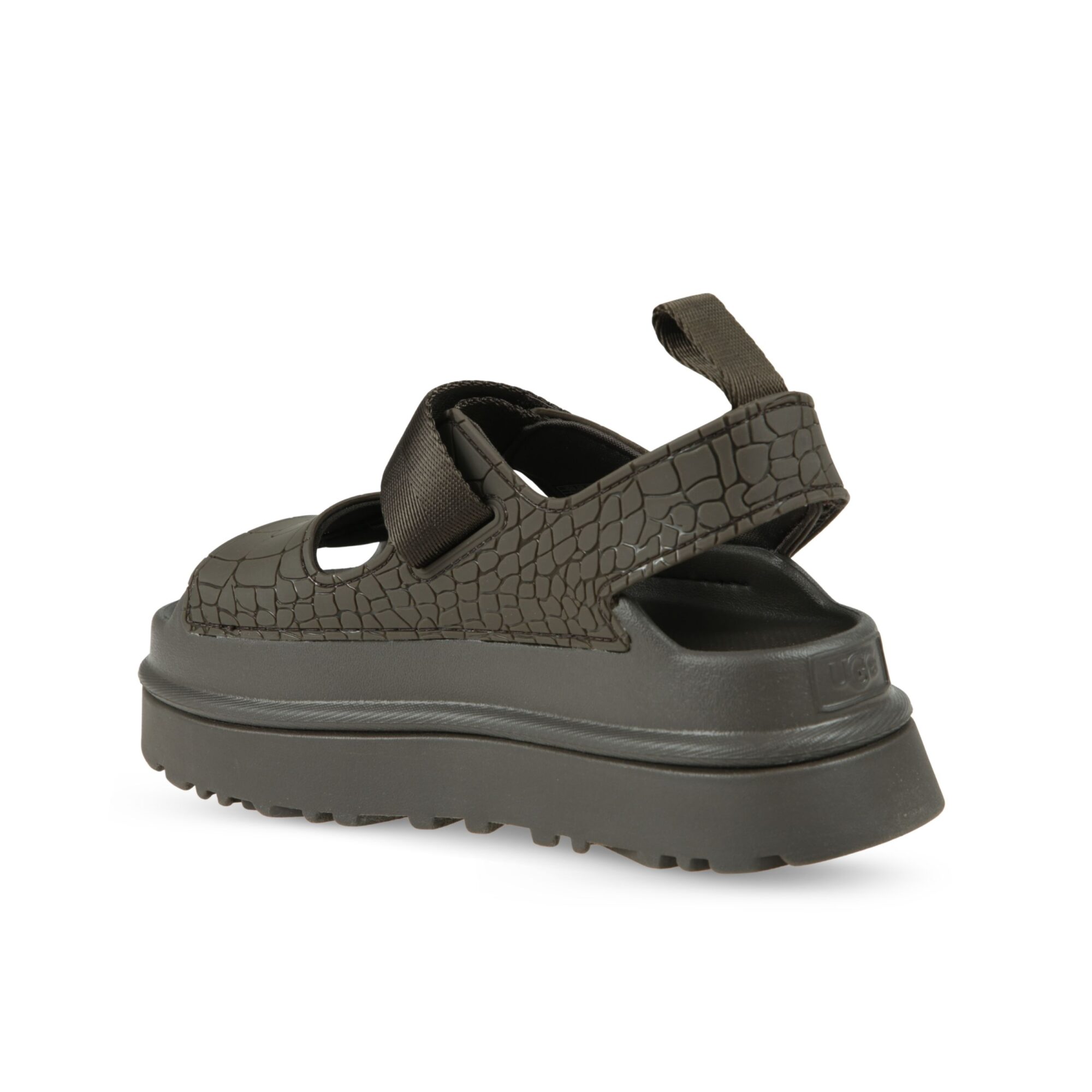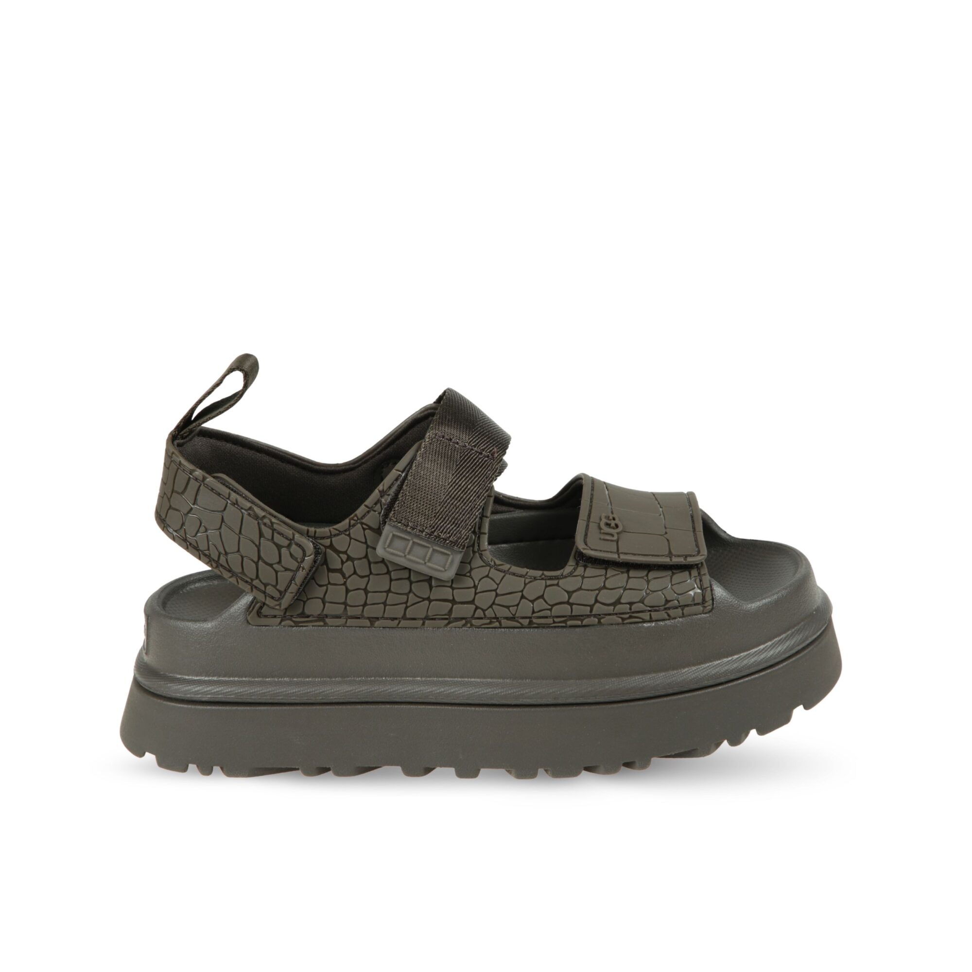 Sandali GoldenGlow Embossed UGG. Tomaia in TPU con stampa in rilievo e chiusura con cinturino in velcro, suola chunky ultraleggera in EVA.