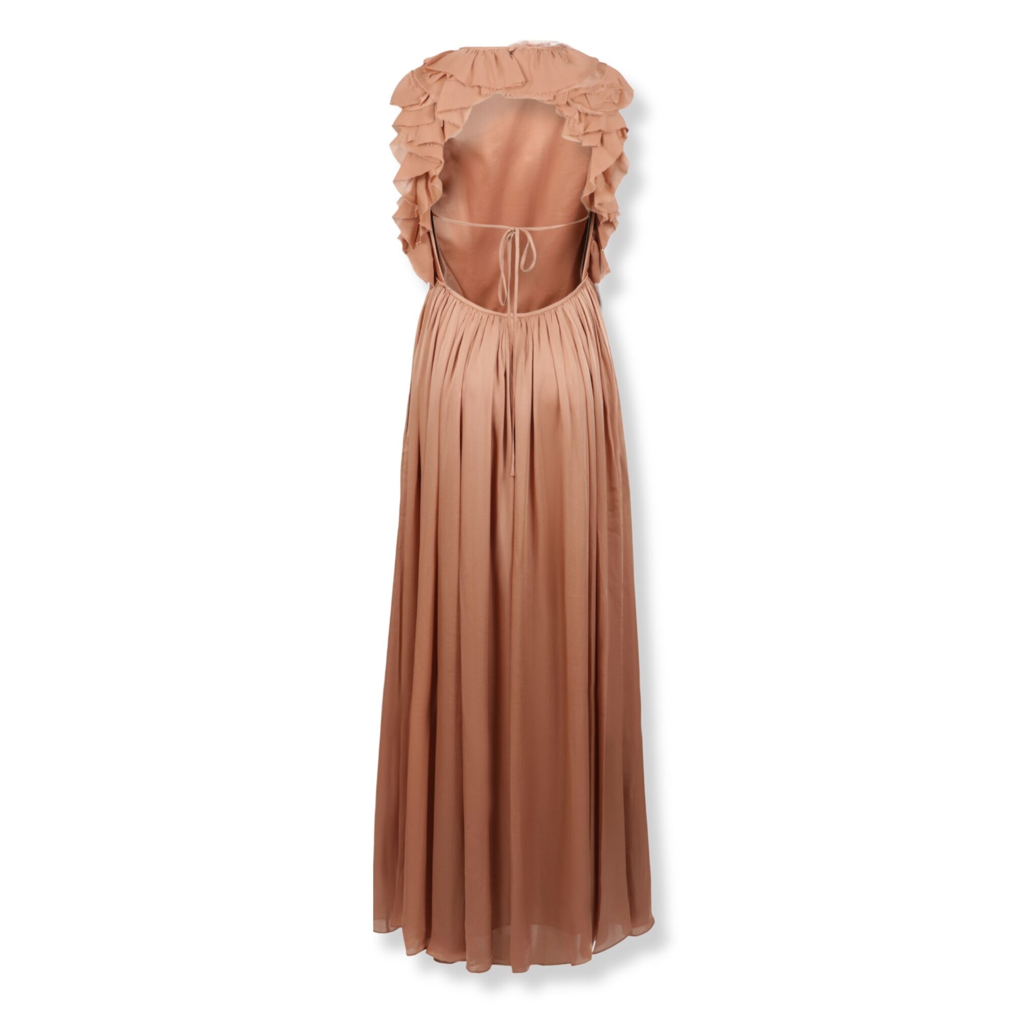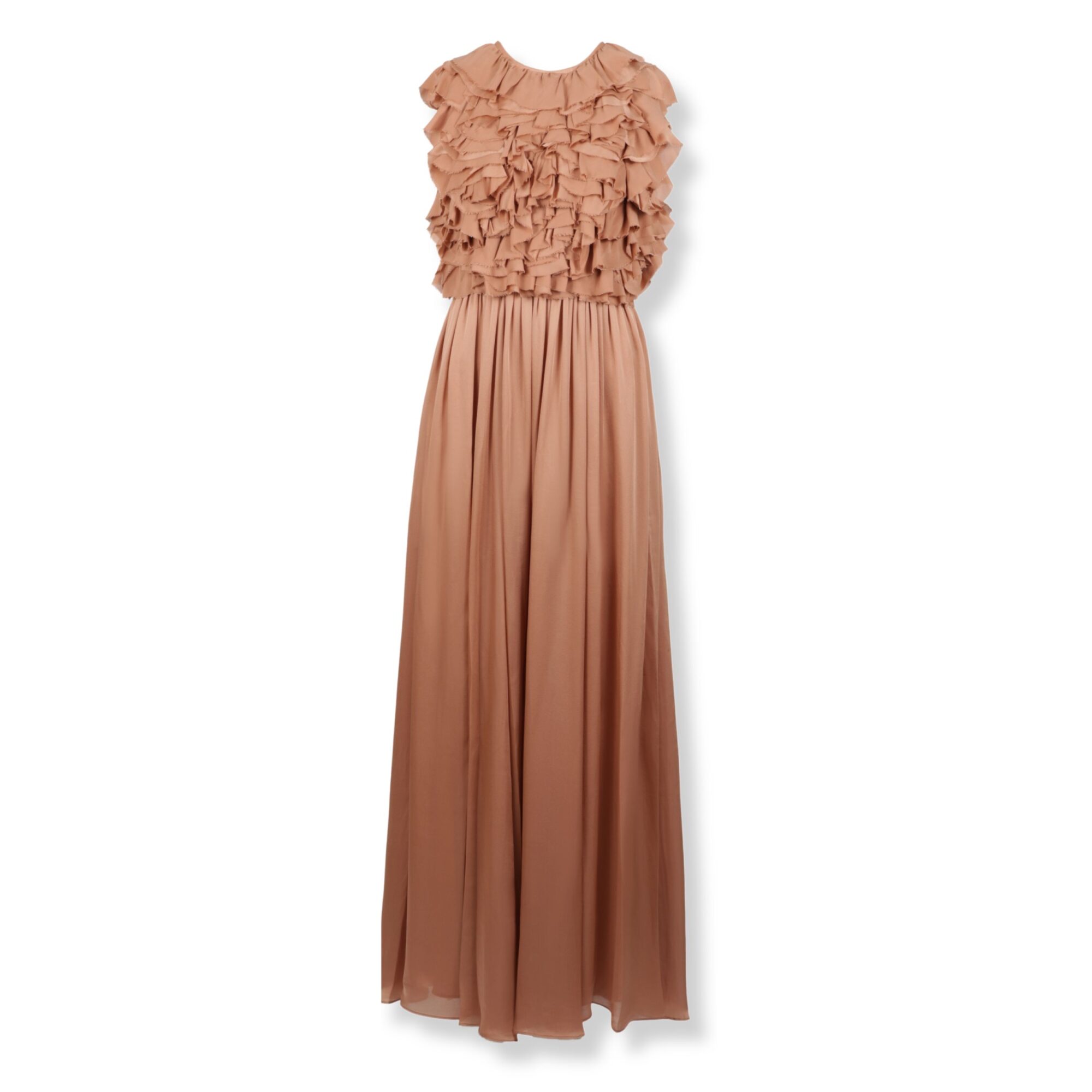 The Byzantine Gown Ulla Johnson. In chiffon di seta satinata, smanicato, schiena aperta. Corpetto decorato con volant e gonna plissettata con cadenza fluida.