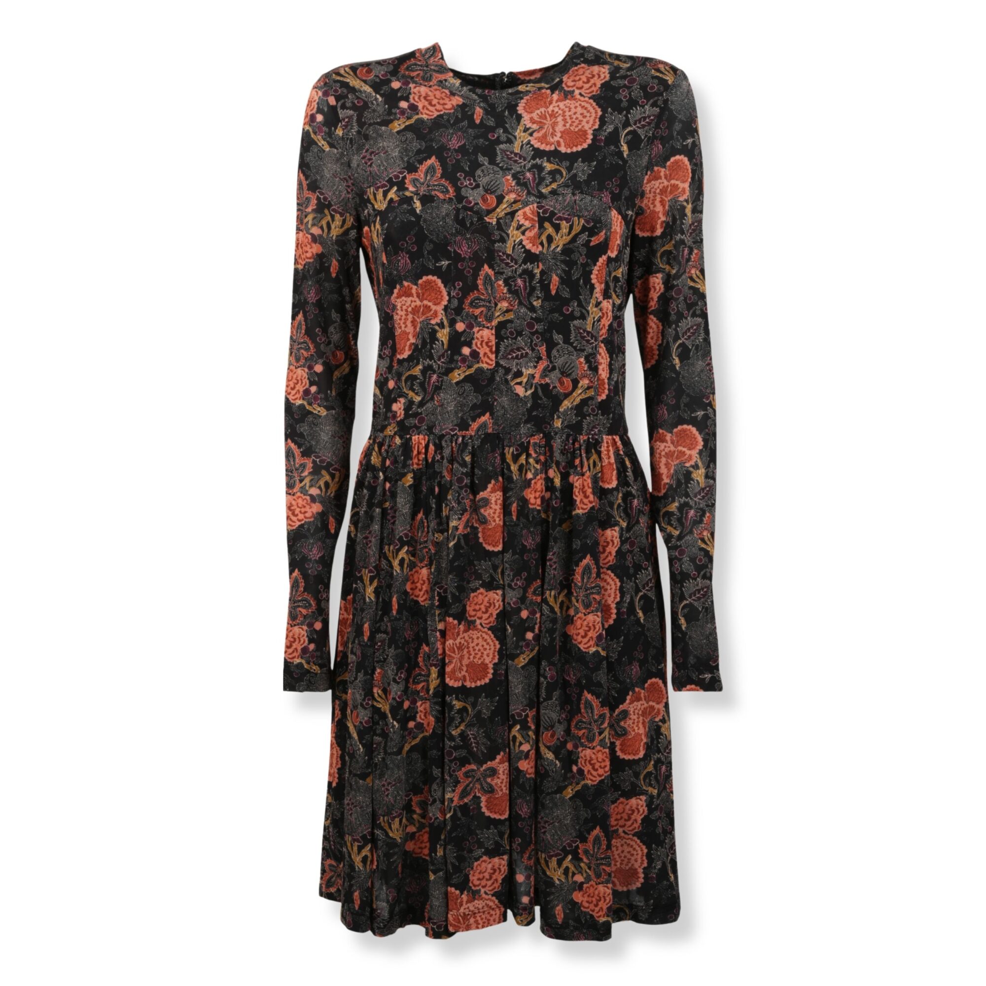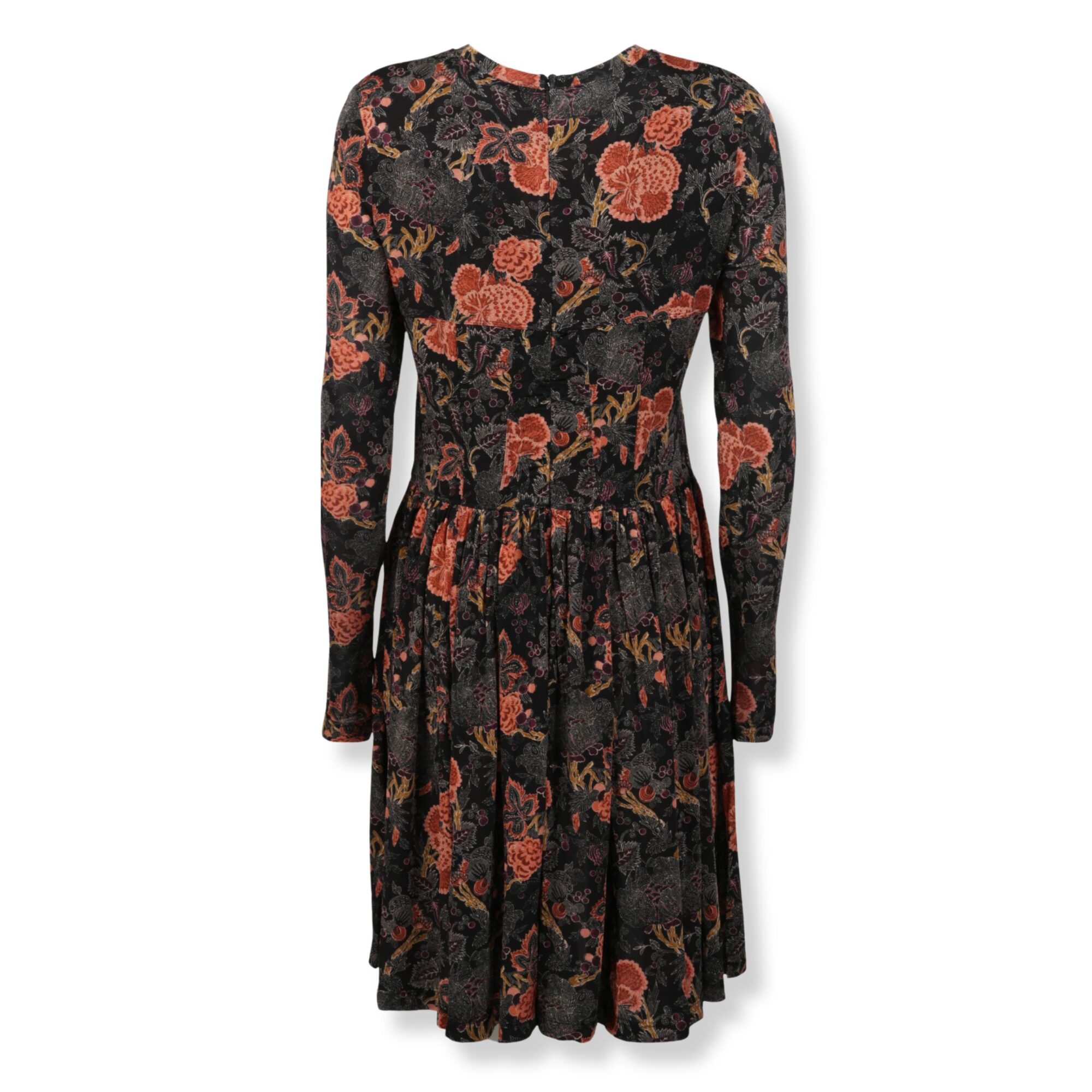 Abito Ulla Johnson. Corpetto aderente, maniche lunghe, scollo tondo e gonna plissettata con orlo leggermente svasato. Iconica stampa a tema floreale su tutta la superficie.