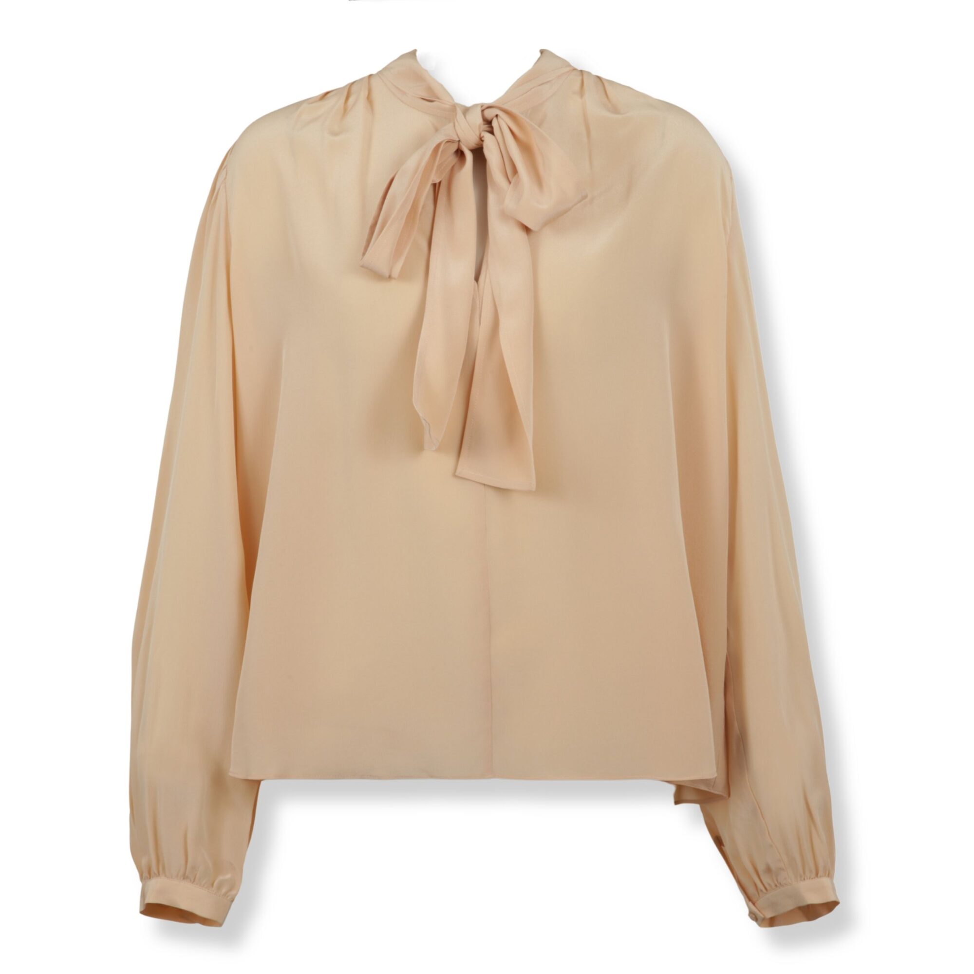 Blusa Ulla Johnson. Maniche lunghe, collo alto con fiocco, piccoli effetti arricciati sulle maniche e polsini stretti a camicia abbottonati.