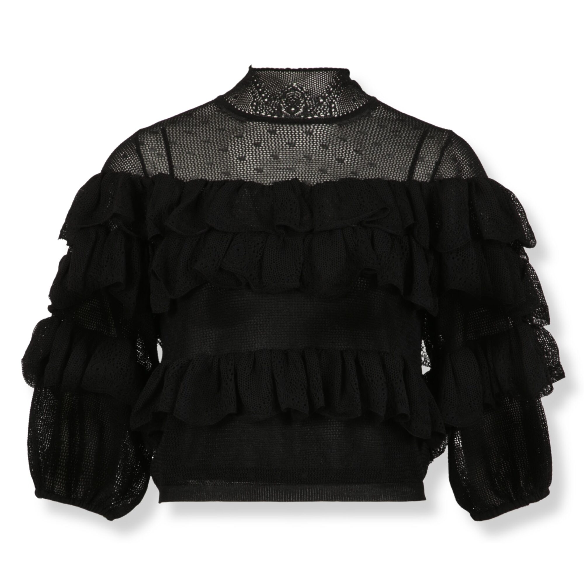 Corinna Top Ulla Johnson in maglia point d’esprit e pizzo Chantilly. Collo alto e volant a cascata, maniche al gomito con polsini elasticizzati.