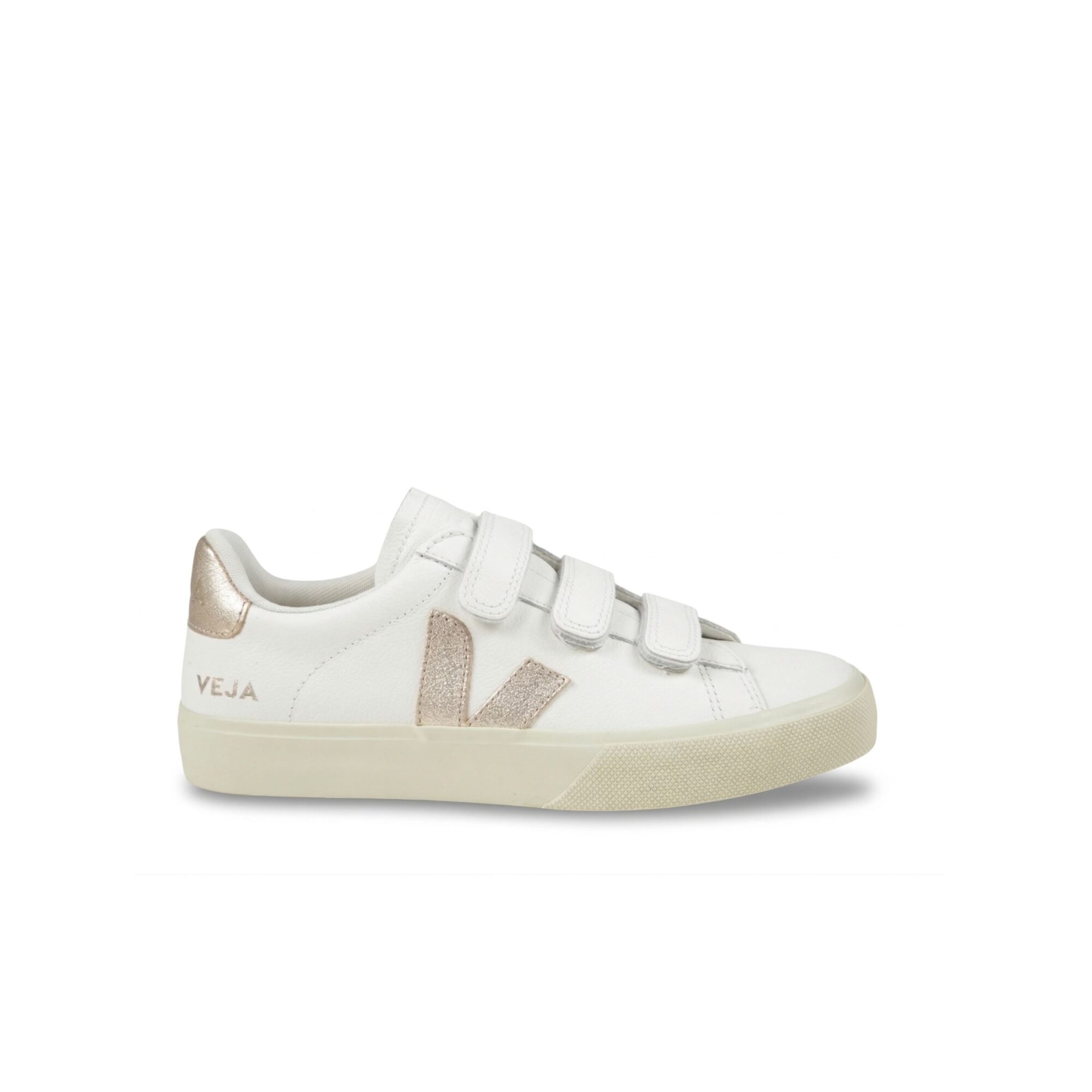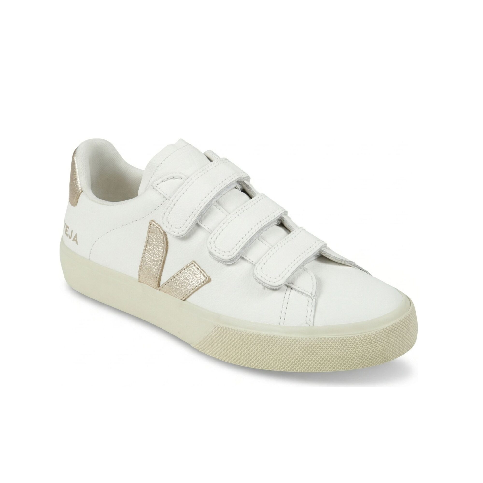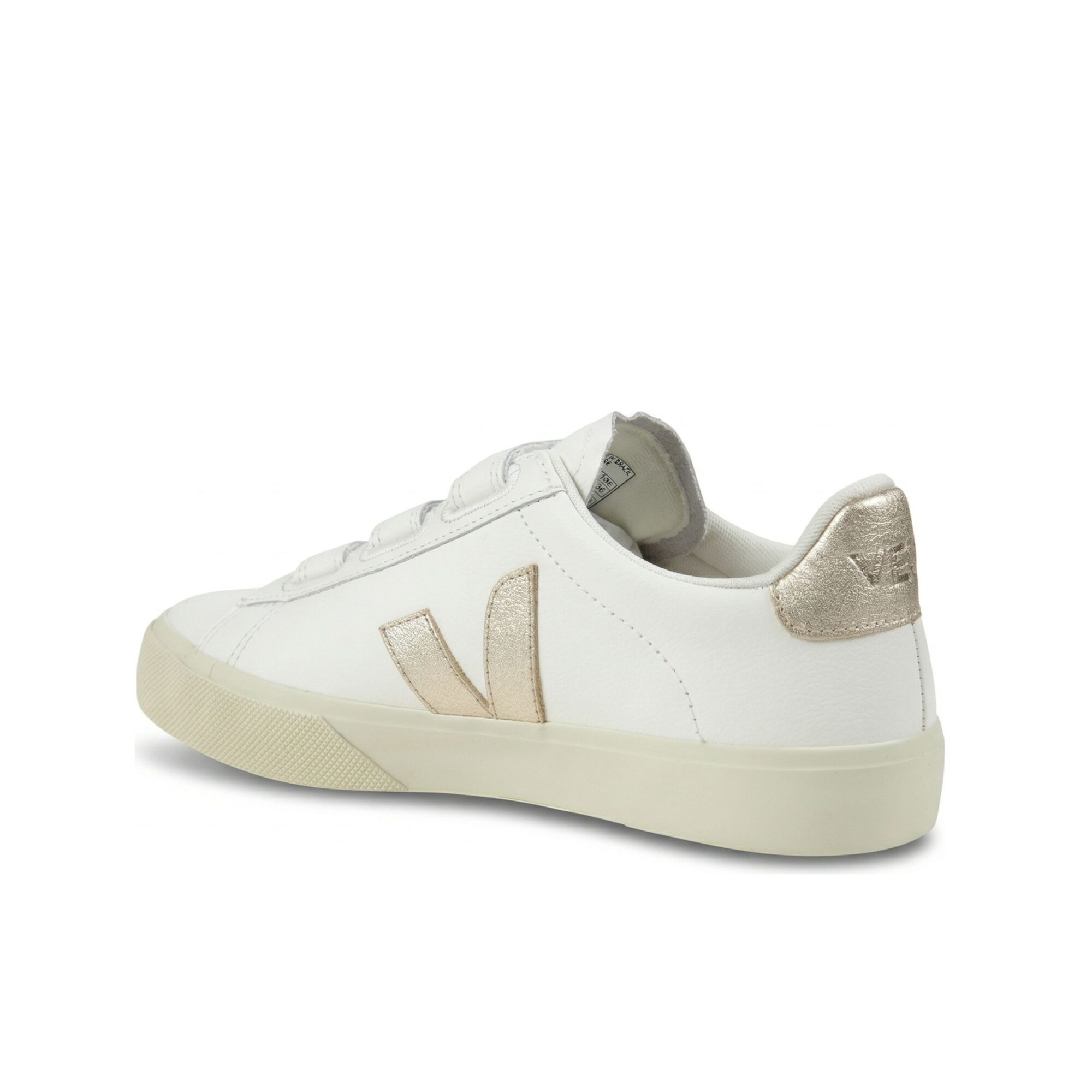 Sneakers Recife Veja. Tomaia in pelle Organic Traced (O. T.) con tripla chiusura regolabile a velcro, inserti in pelle effetto cracklé, suola in miscela di gomma amazzonica e silice minerale.