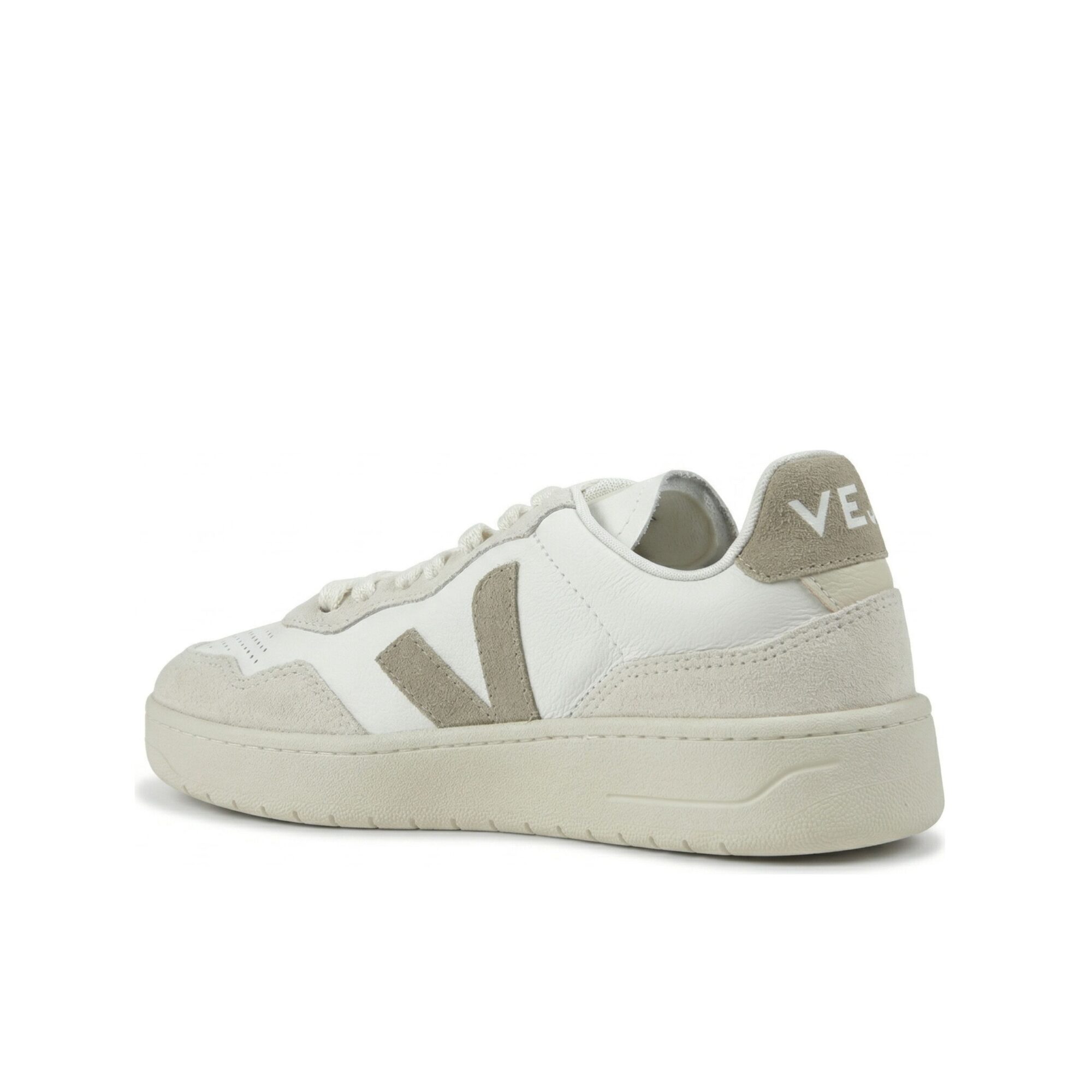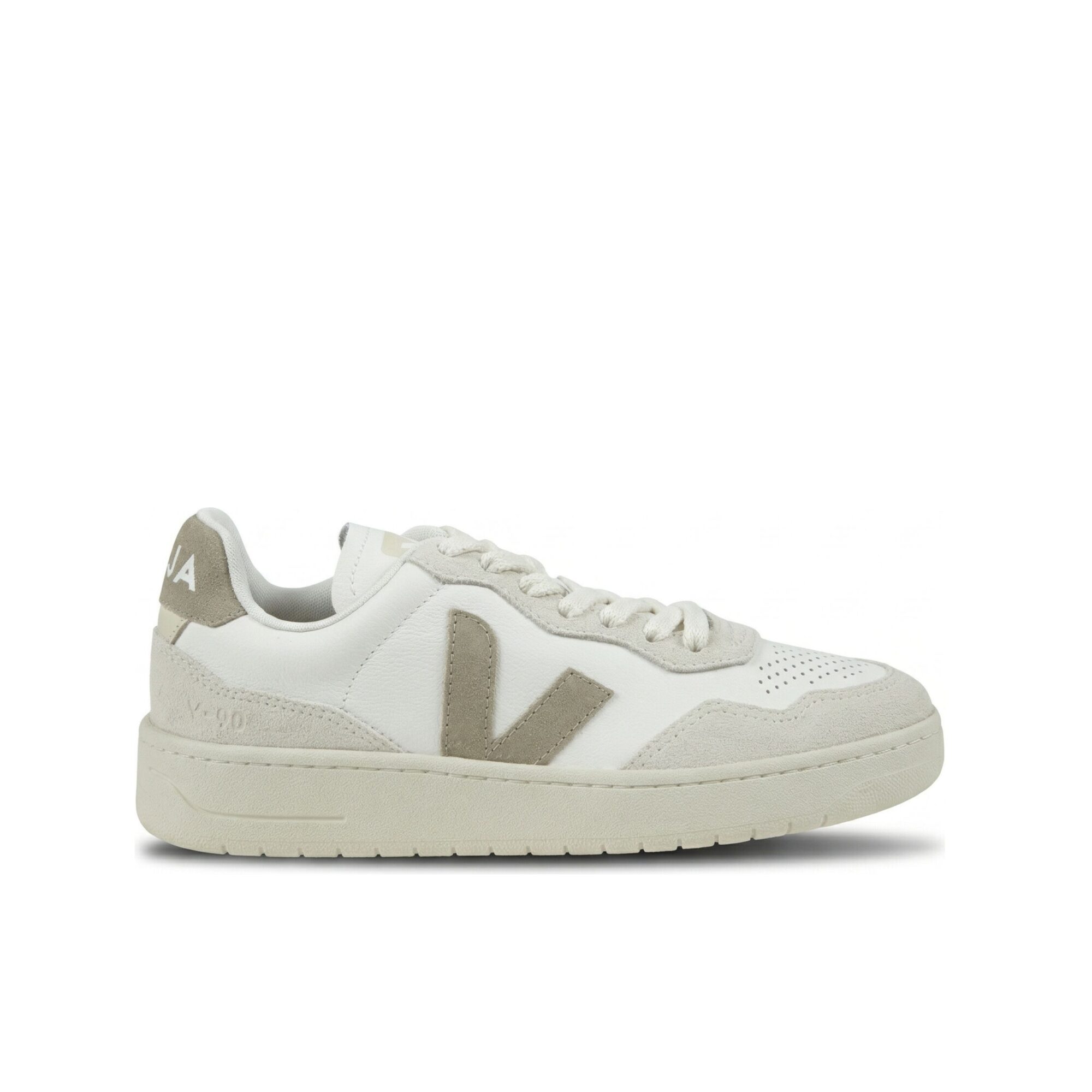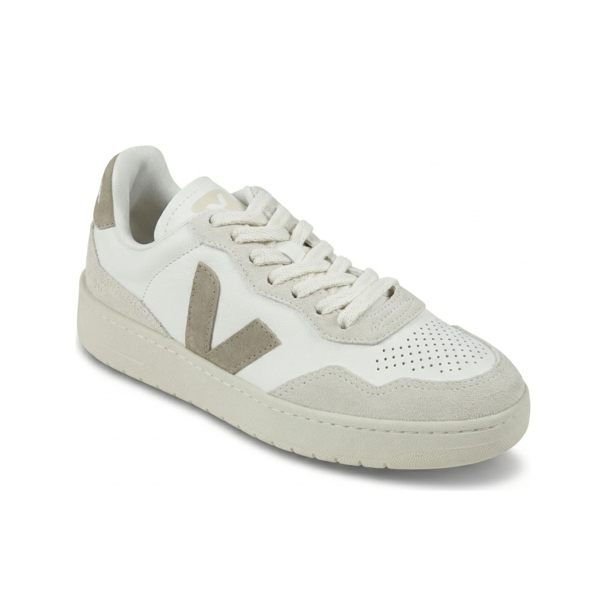 Sneakers V-90 Veja. Tomaia in pelle Organic Traced (O. T.) ed inserti in pelle scamosciata, suola in miscela di gomma amazzonica e silice minerale.