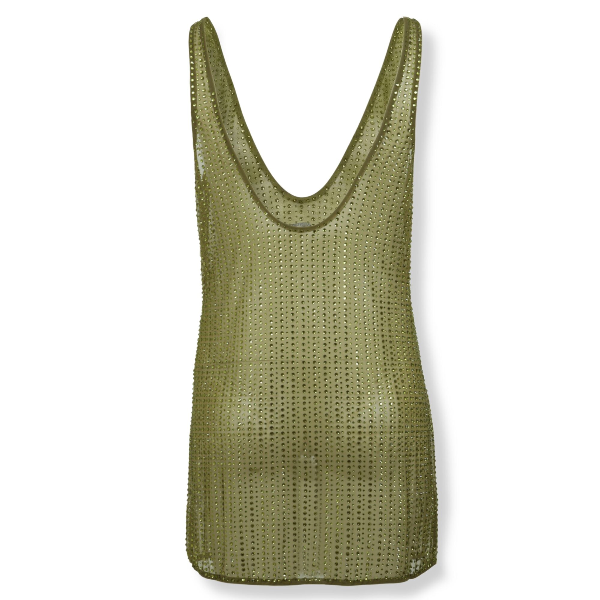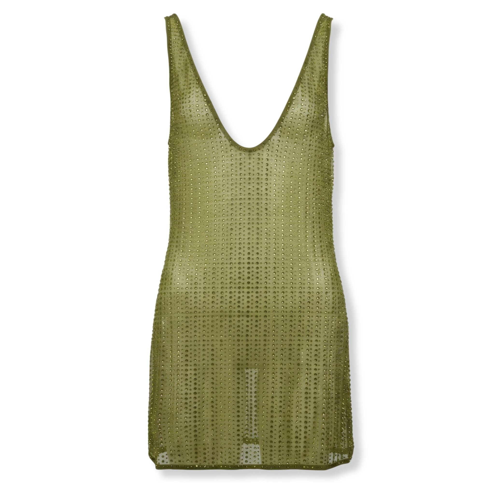 Miniabito Venuja. Design in tulle semitrasparente con strass applicati all-over, scollo ampio, linea aderente.