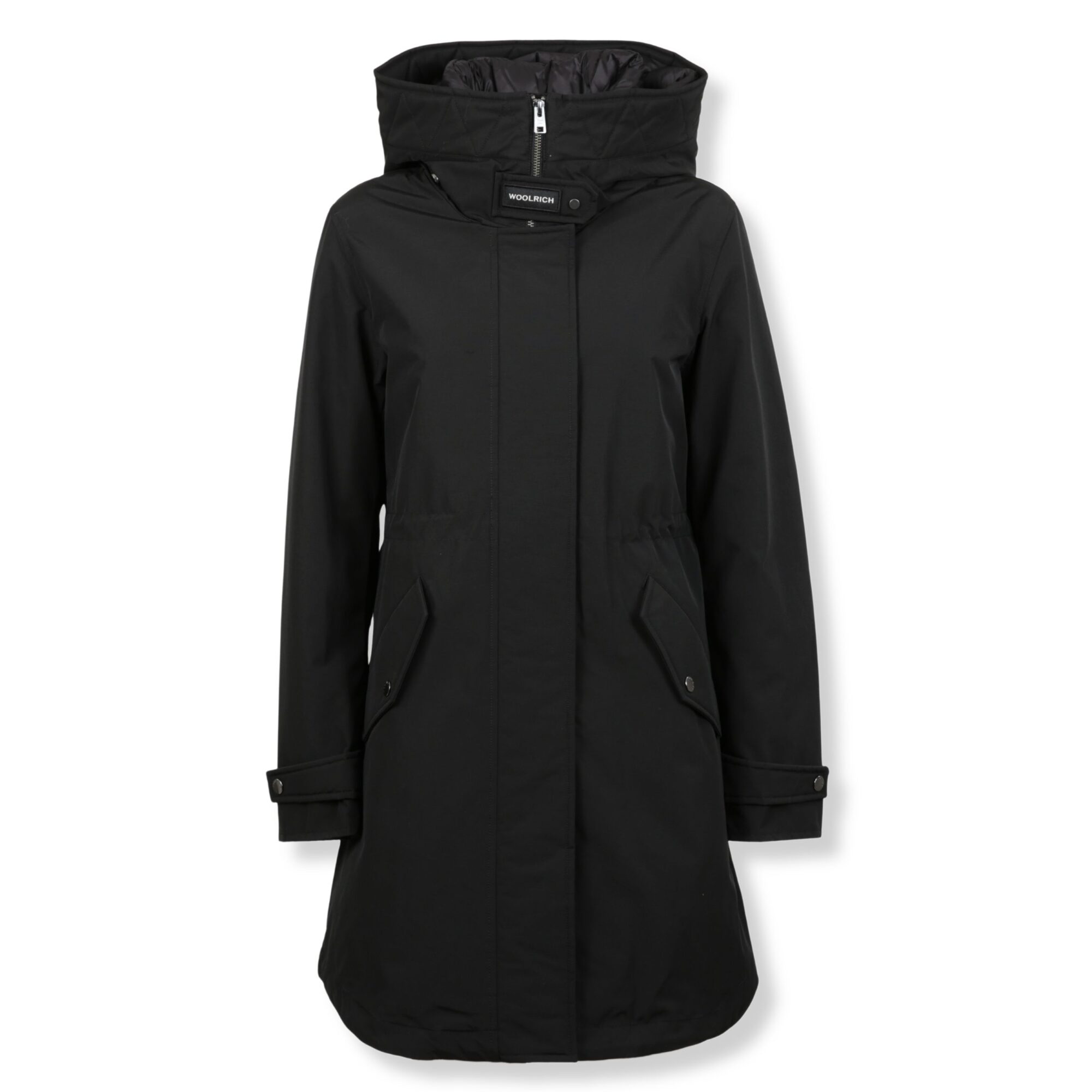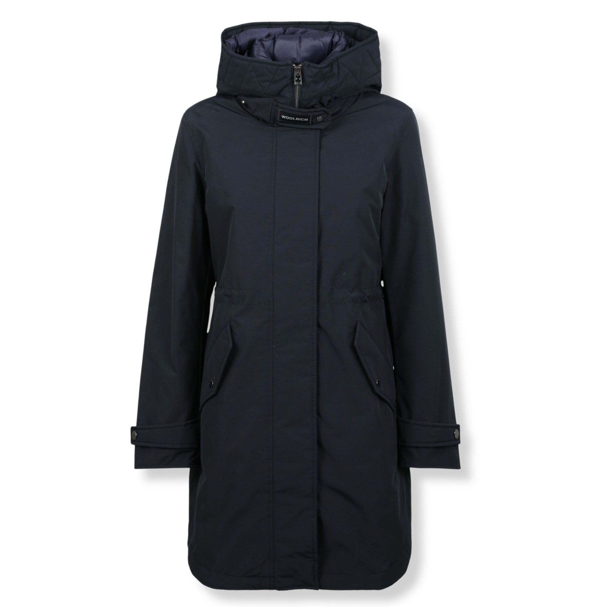 Arctic Parka Woolrich. In iconico Ramar Cloth con imbottitura in piuma d’anatra 90/10. Collo alto e cappuccio, chiusura frontale a zip e bottoni nascosti e due tasche con patta sul davanti.